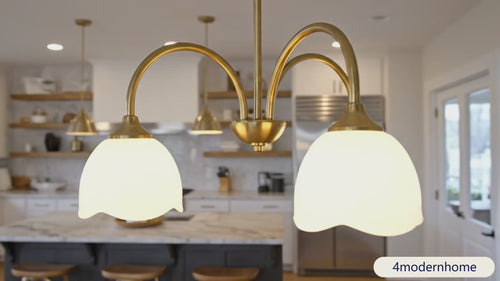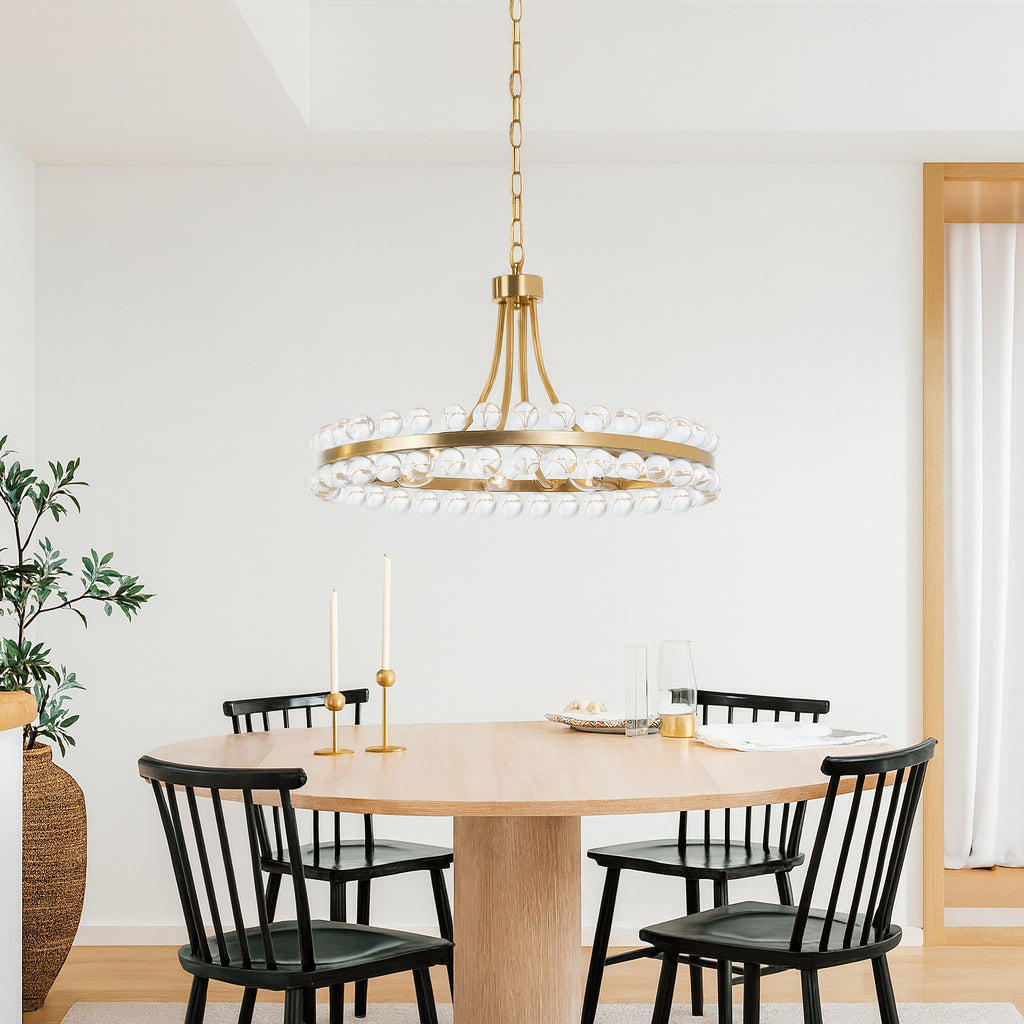 It is a beautiful chandelier. It took some time to figure out and assemble. The design was too ornate for my humble dining room with a standard high ceiling, so eliminated bottom danglers and connecting danglers. With no danglers, the bottom of the chandelier is about 6 feet from the floor. The light bulbs make a big difference in their look. I used traditional standard CLEAR light bulbs for a sparkling effect. The plain ceiling medallion was also installed.