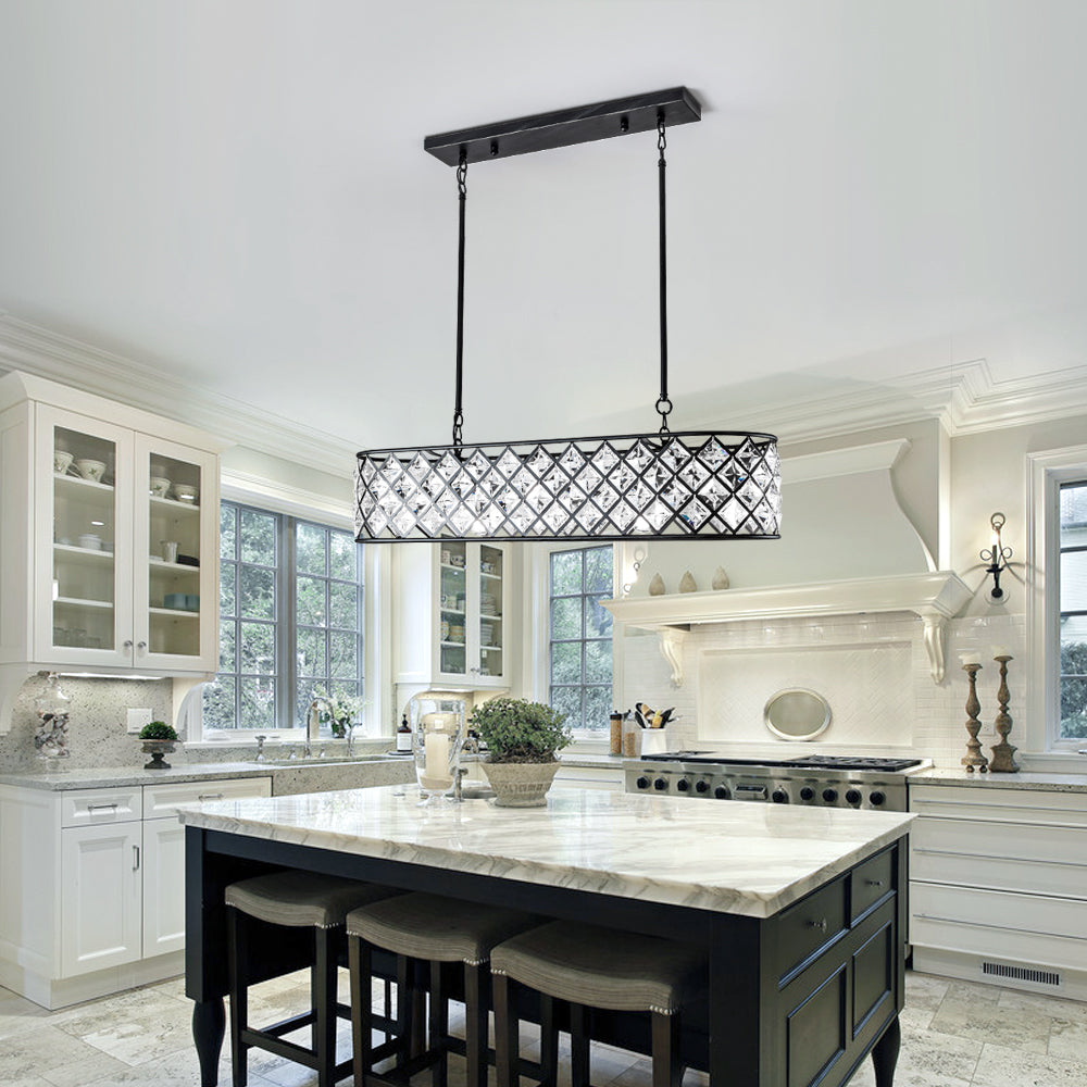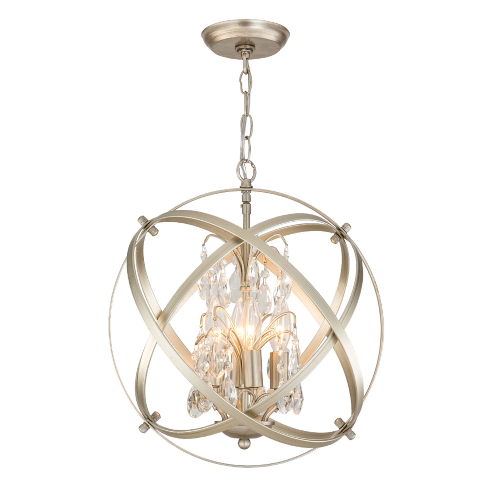 It is a beautiful chandelier. It took some time to figure out and assemble. The design was too ornate for my humble dining room with a standard high ceiling, so eliminated bottom danglers and connecting danglers. With no danglers, the bottom of the chandelier is about 6 feet from the floor. The light bulbs make a big difference in their look. I used traditional standard CLEAR light bulbs for a sparkling effect. The plain ceiling medallion was also installed.
