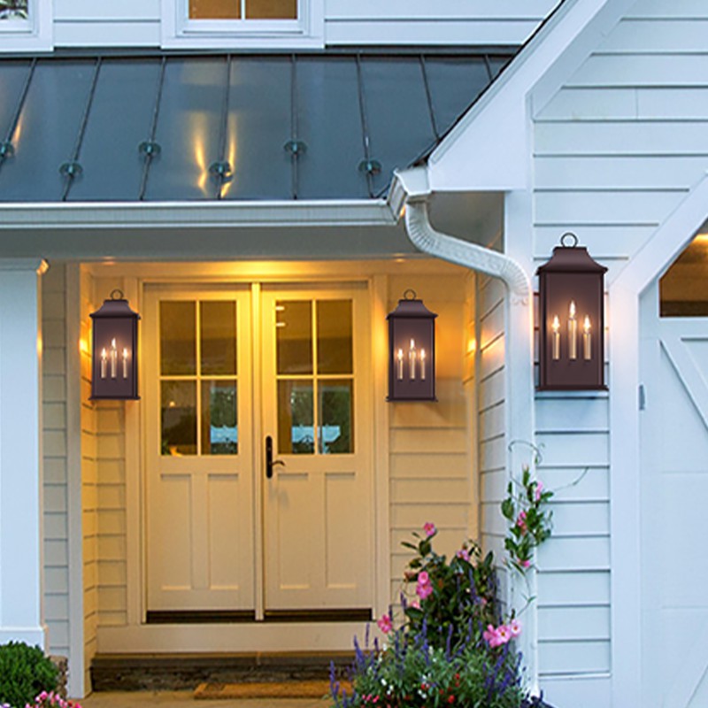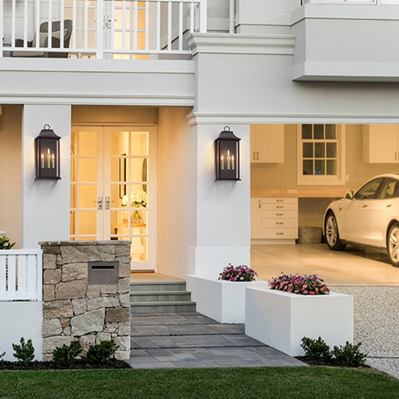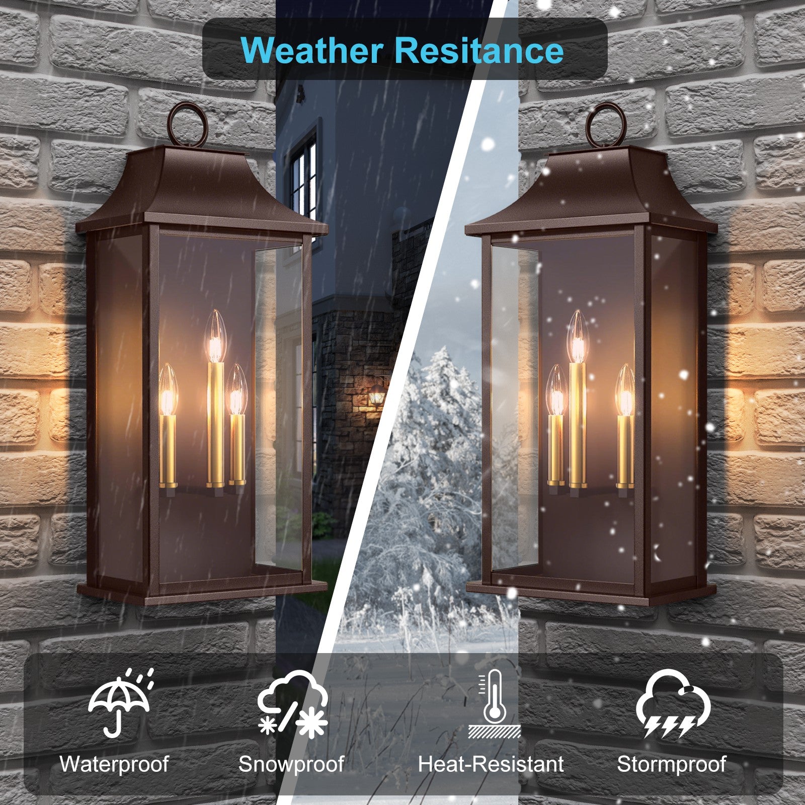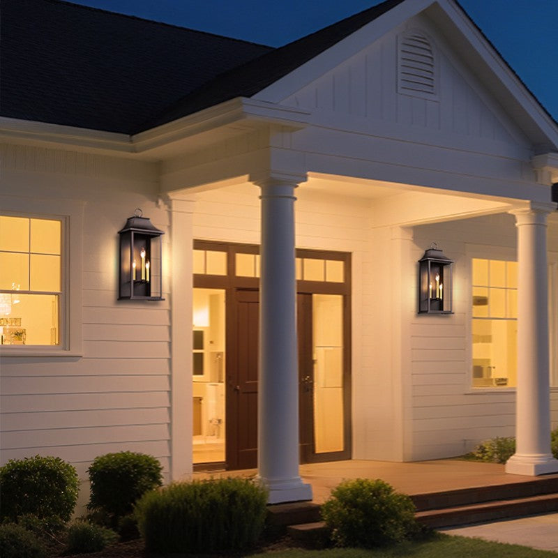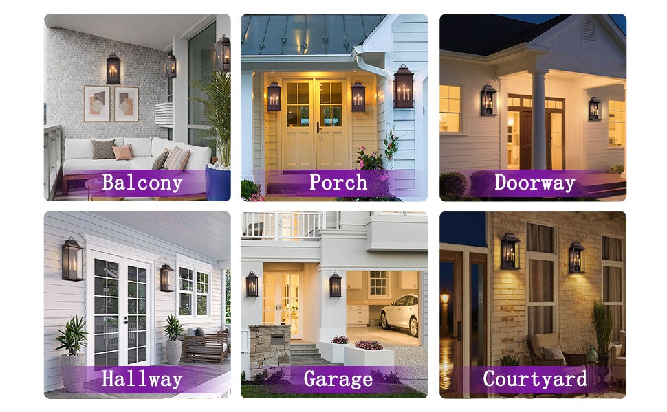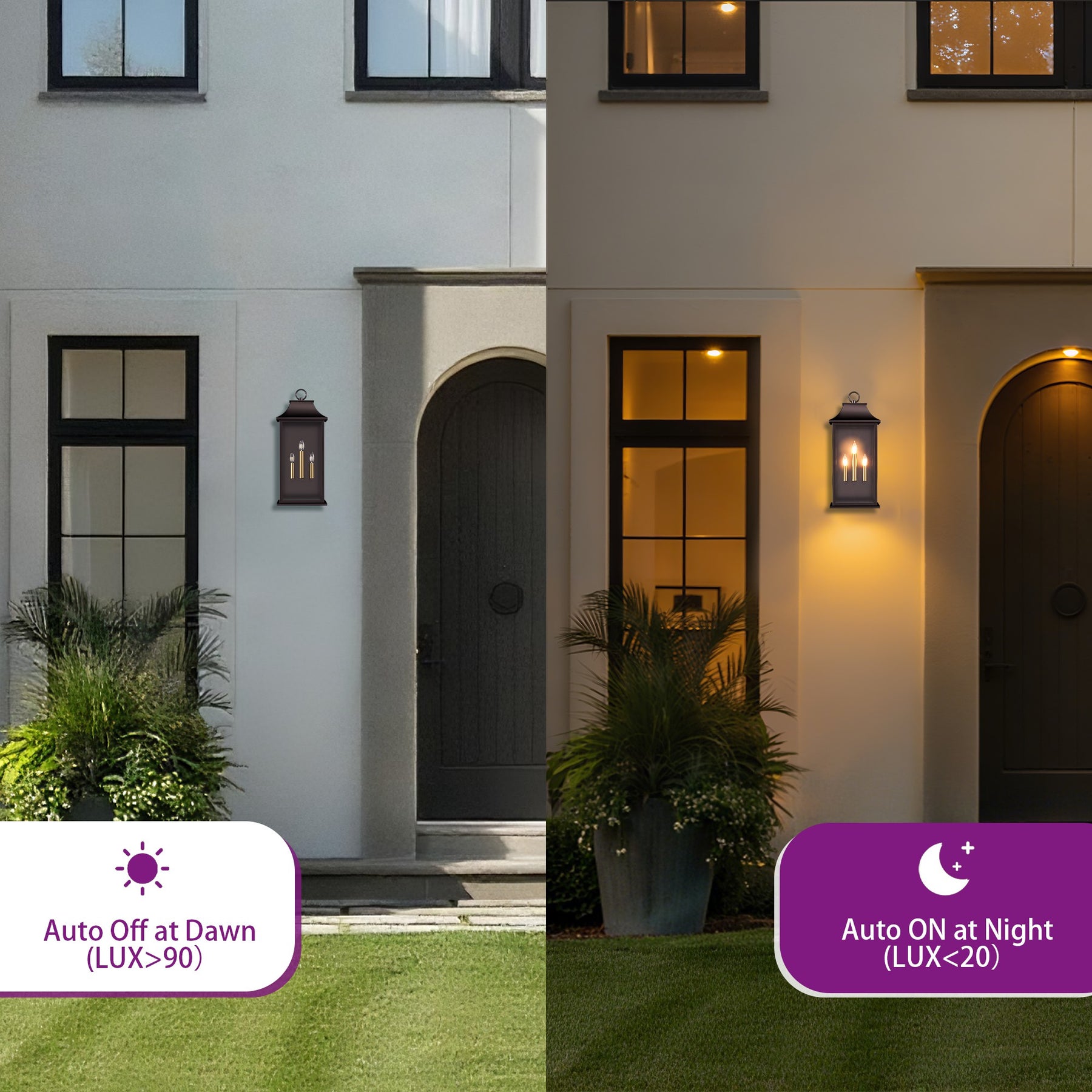 Our outdoor wall lights feature a premium metal frame with a sleek black matte finish. Constructed with high-temperature tempered glass, they are waterproof, rust-proof, and weather-resistant for lasting durability. A built in photoelectric sensor automatically turns the lights on at dusk and off at dawn, saving energy and adding convenience. With a modern farmhouse design, including three gold candle holders within a rectangular frame, these lights are compatible with LED, incandescent, or CFL bulbs. Ideal for illuminating your front door, garage, porch, or backyard.