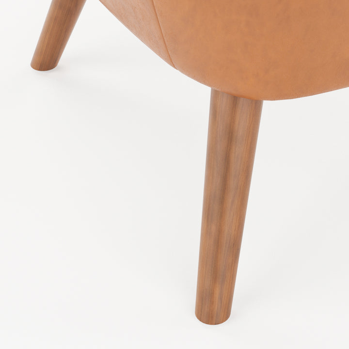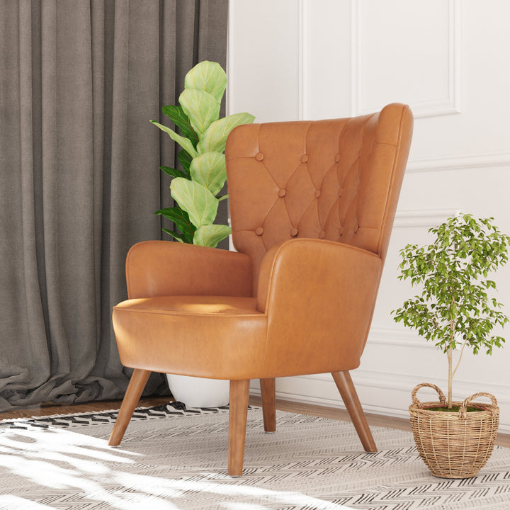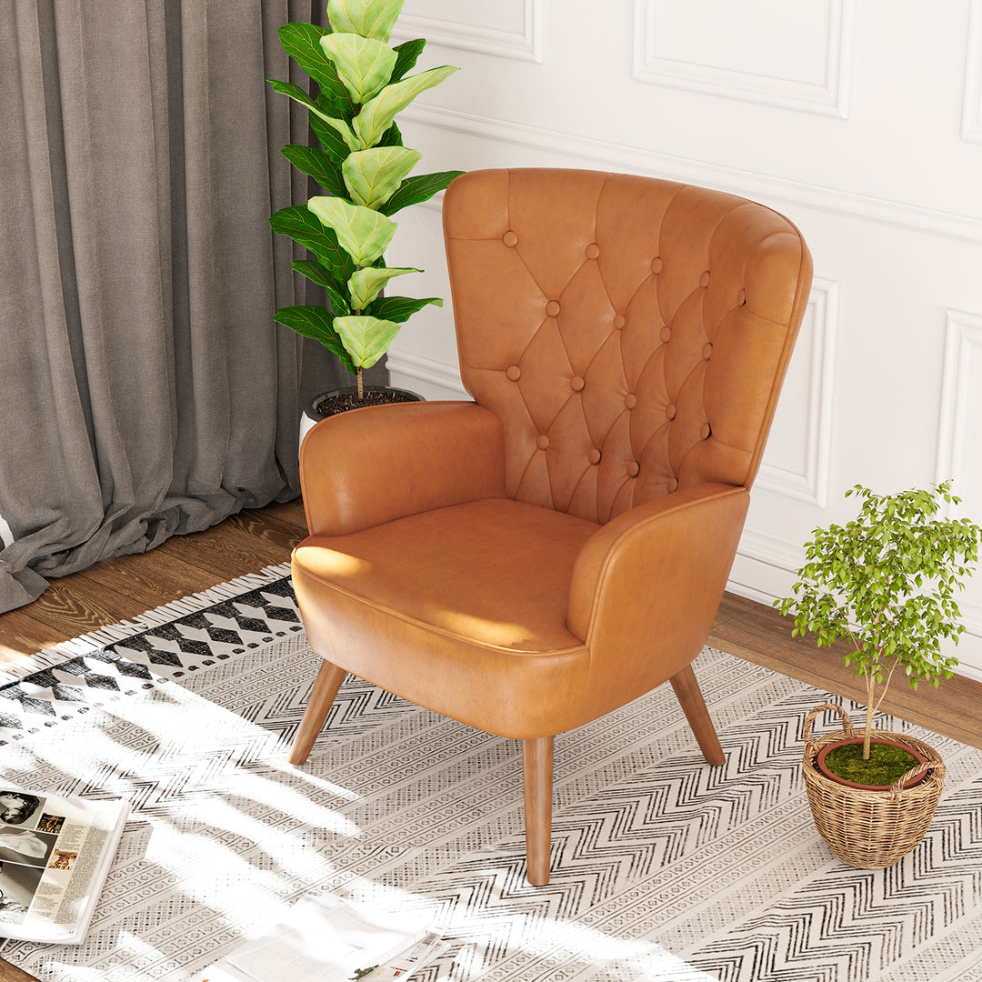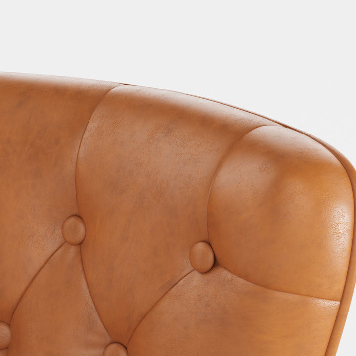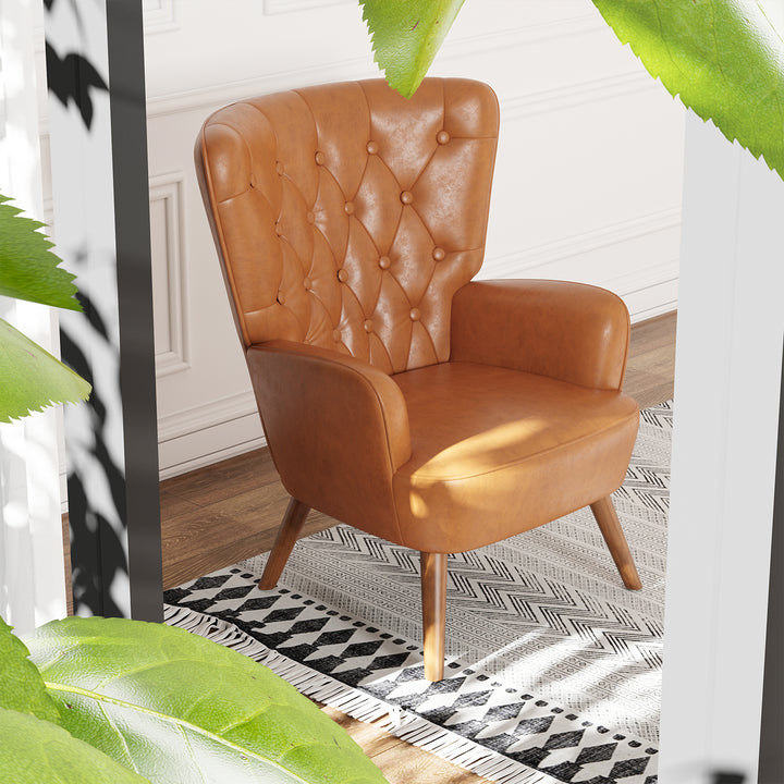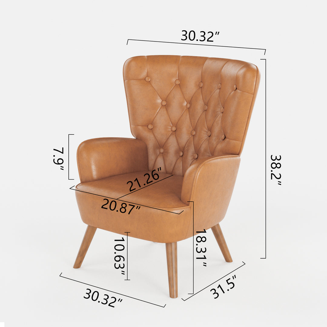 This accent chair offers a cozy yet modern aesthetic for your reading nook. Crafted with a sturdy metal and solid wood frame, it features flared solid wood legs finished for added elegance. Wrapped in warm honey brown antimicrobial faux leather, the chair is both water-resistant and fade-resistant. With recessed arms, a tight back, and foam-filled seating for ultimate comfort, the diamond button-tufted cushions provide a sophisticated touch. It supports a weight capacity of 300 lbs, making it a stylish and durable addition to your space.