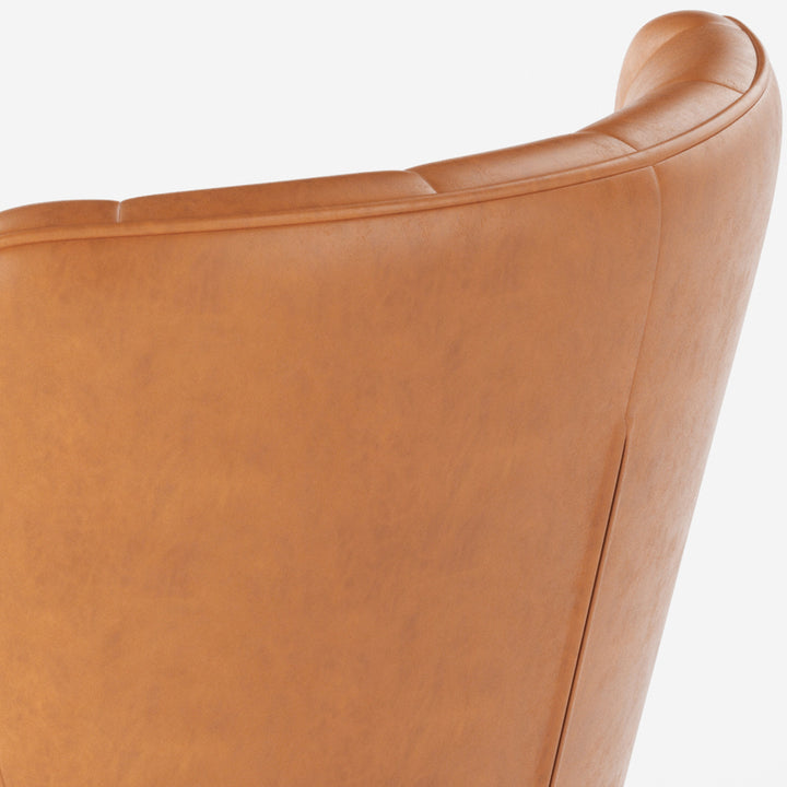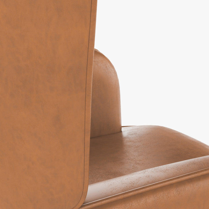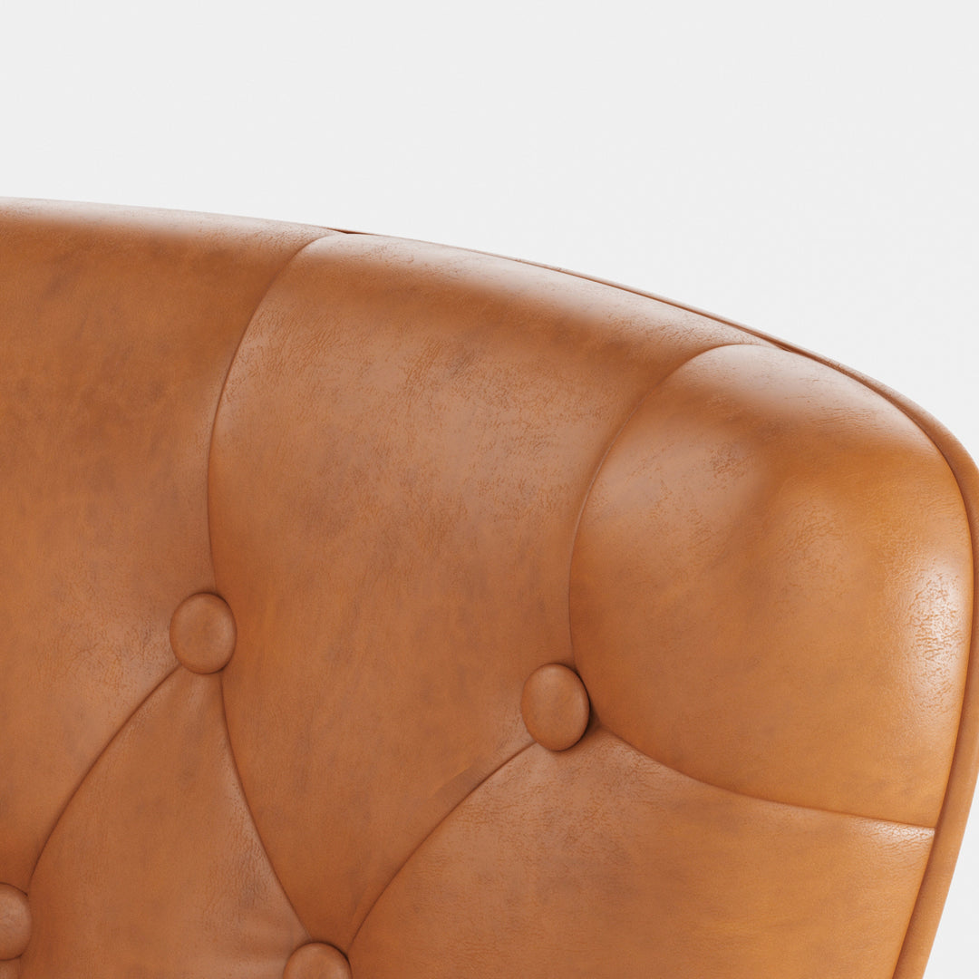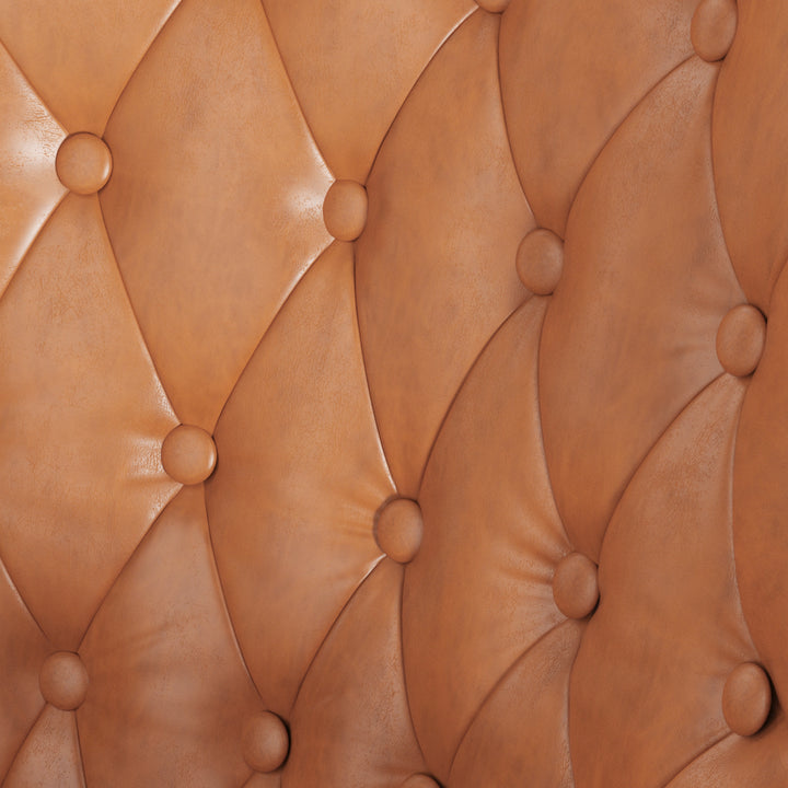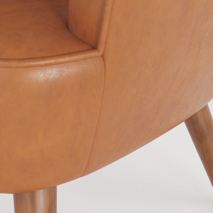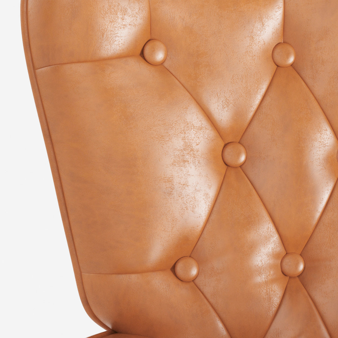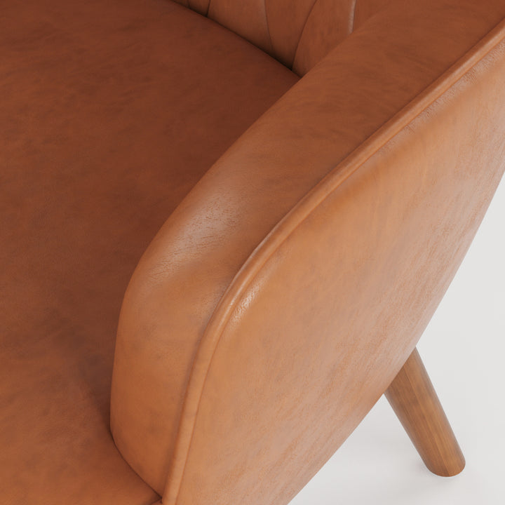 This accent chair offers a cozy yet modern aesthetic for your reading nook. Crafted with a sturdy metal and solid wood frame, it features flared solid wood legs finished for added elegance. Wrapped in warm honey brown antimicrobial faux leather, the chair is both water-resistant and fade-resistant. With recessed arms, a tight back, and foam-filled seating for ultimate comfort, the diamond button-tufted cushions provide a sophisticated touch. It supports a weight capacity of 300 lbs, making it a stylish and durable addition to your space.