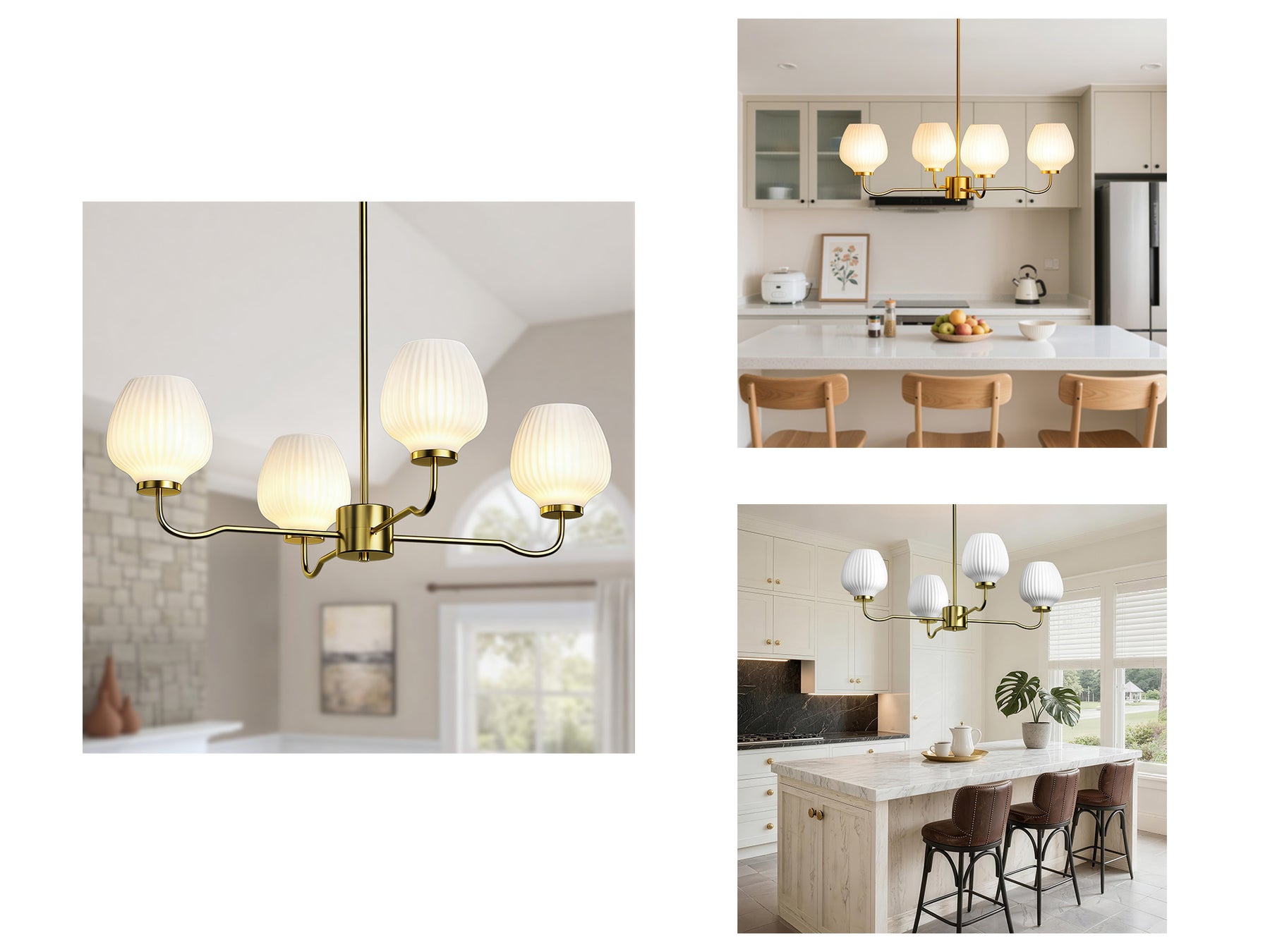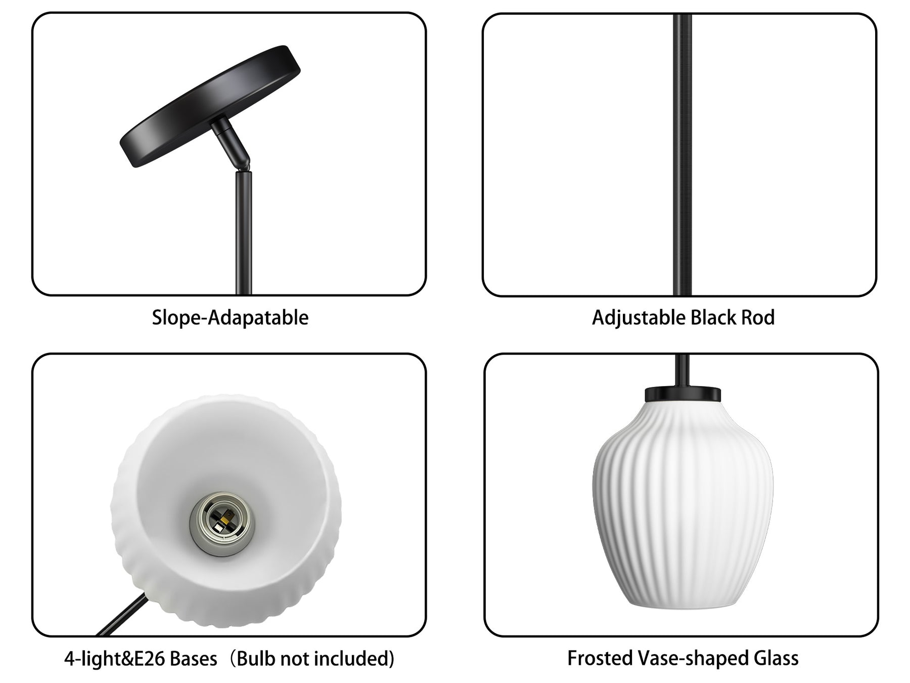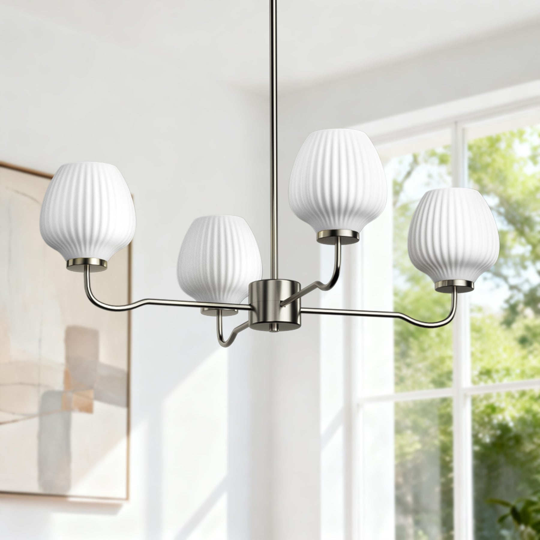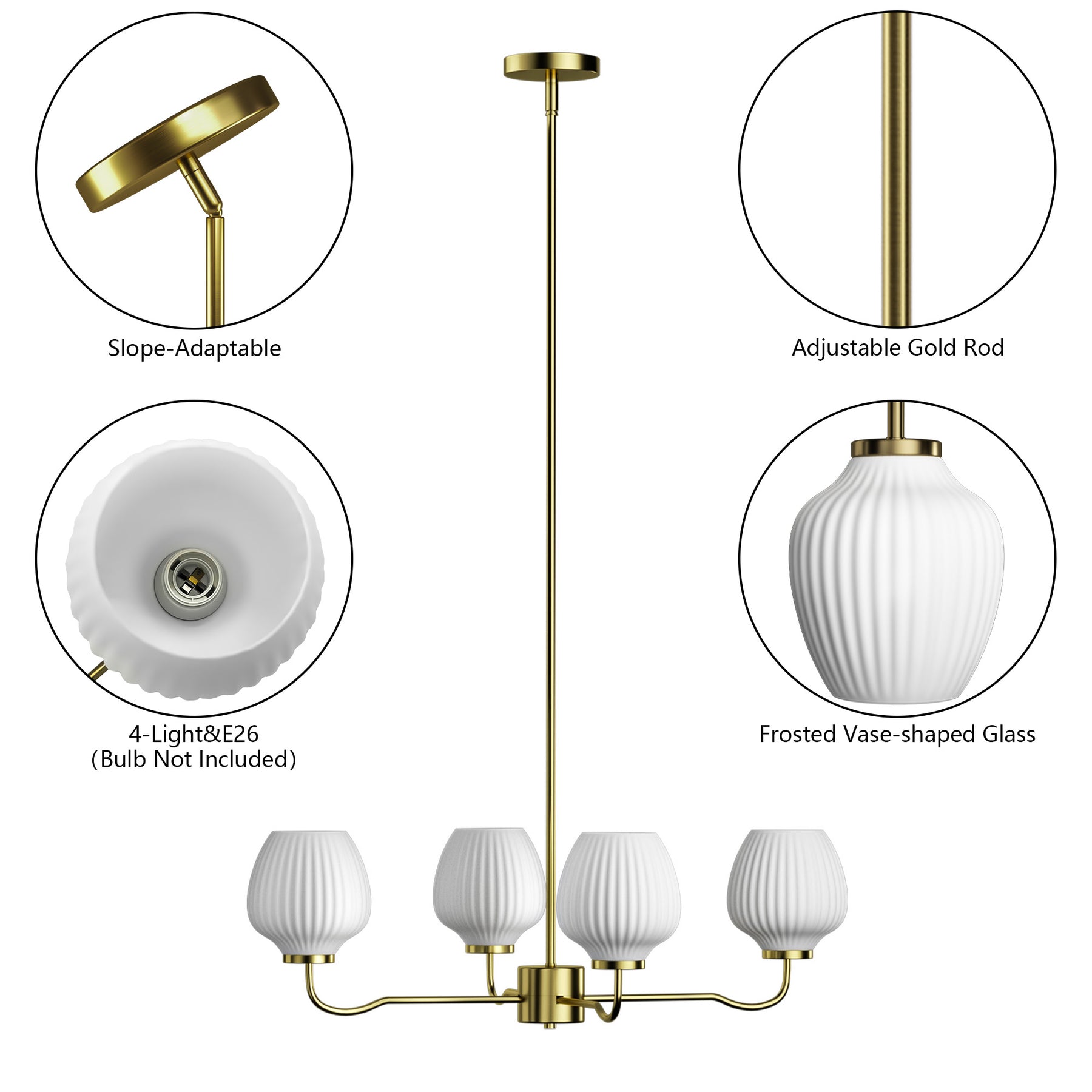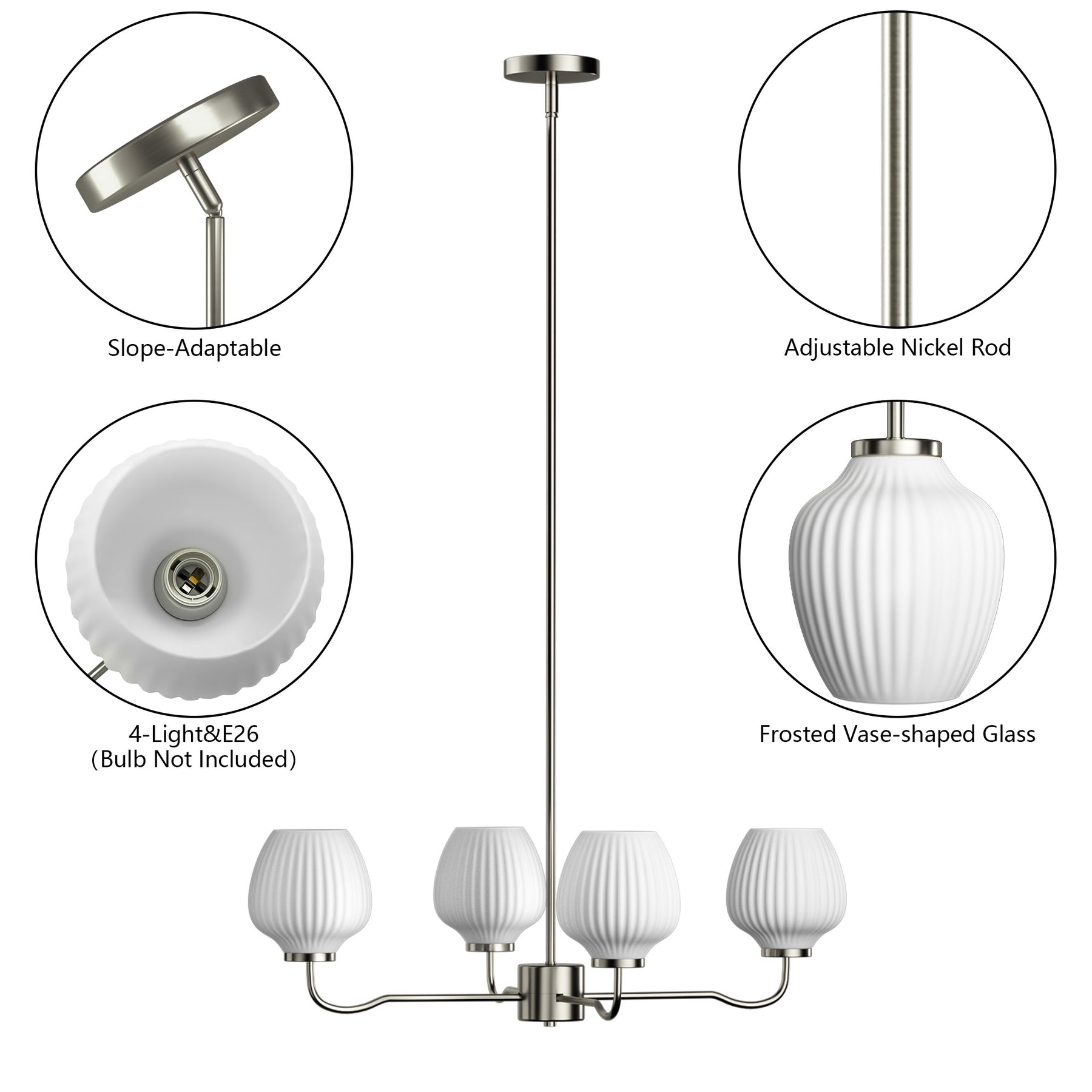 Enhance your space with this modern 4-light chandelier, featuring white frosted glass vase shades that softly diffuse light for a warm, comfortable glow. Its balanced, symmetrical design creates an elegant focal point above dining tables or kitchen areas, delivering even illumination without harsh glare. Designed for flexible installation, the chandelier includes adjustable downrods up to 42 inches and is compatible with sloped ceilings. ETL listed for safety, dimmable for brightness control, and easy to install, this fixture offers a perfect blend of modern style and everyday functionality.