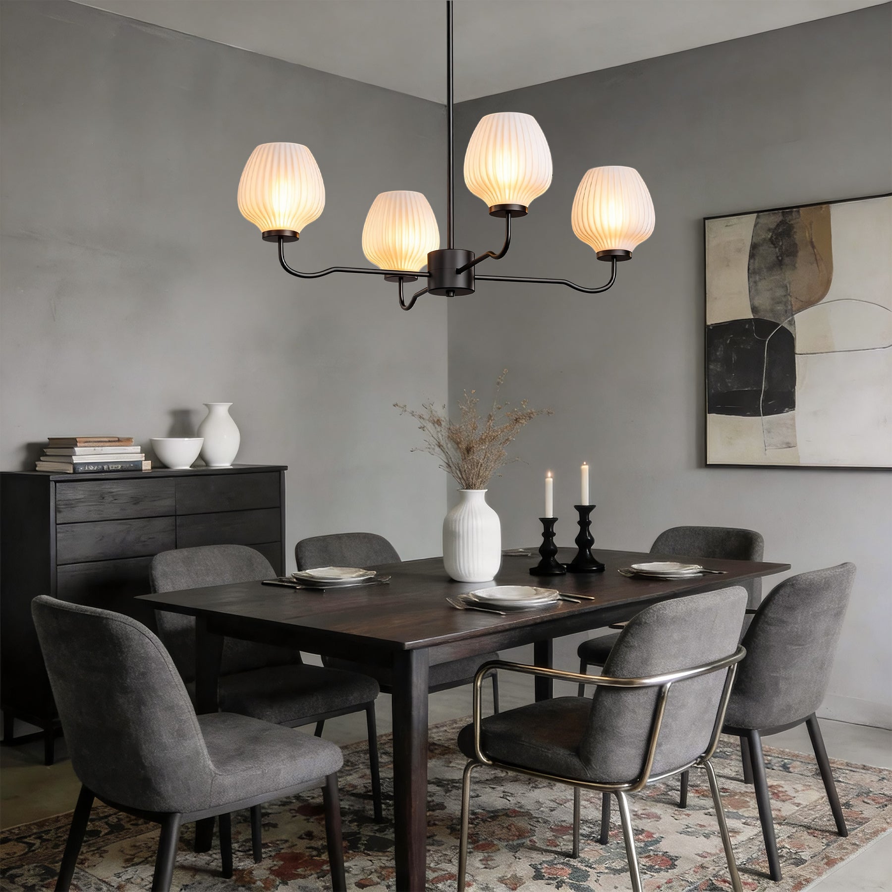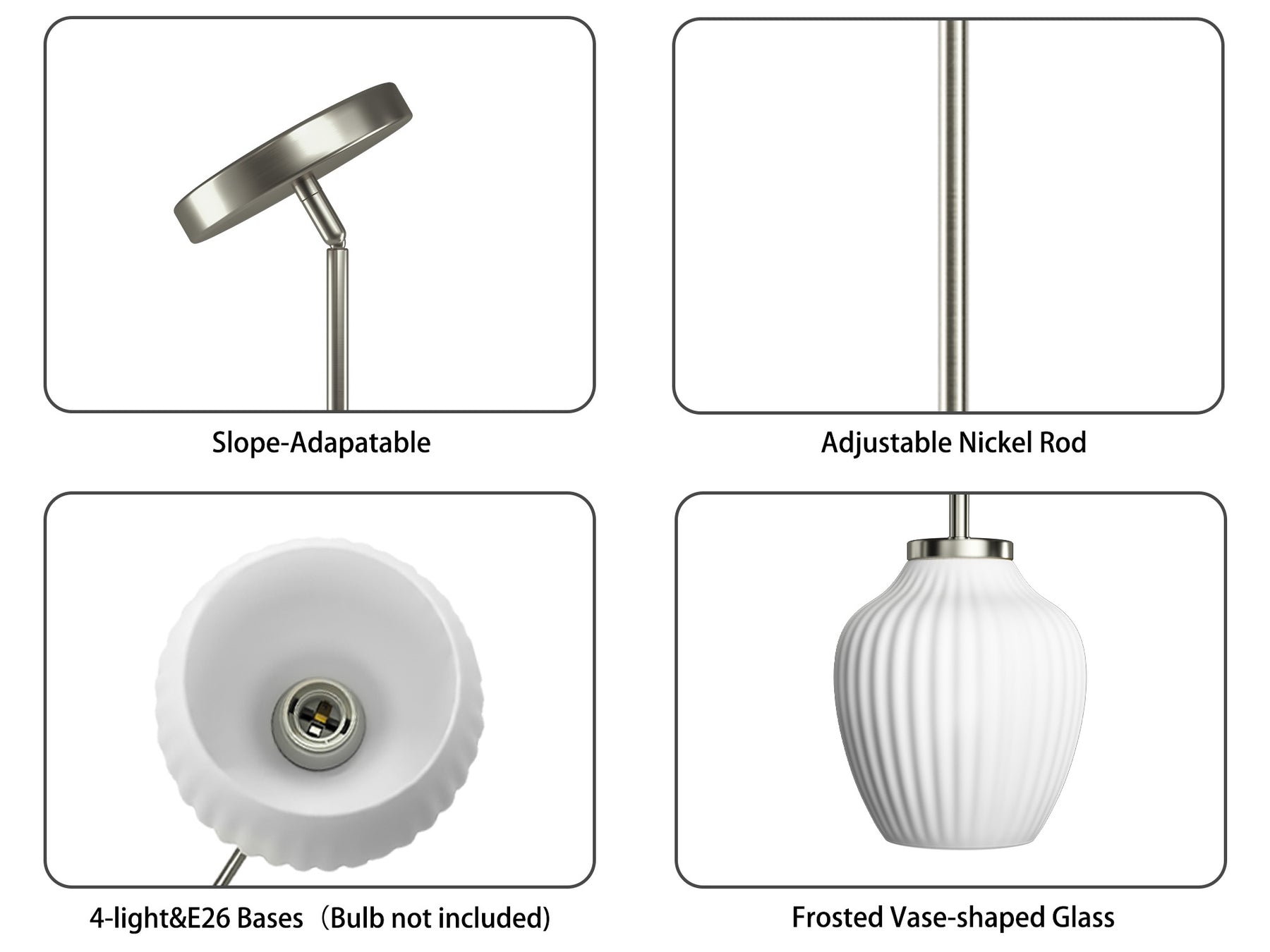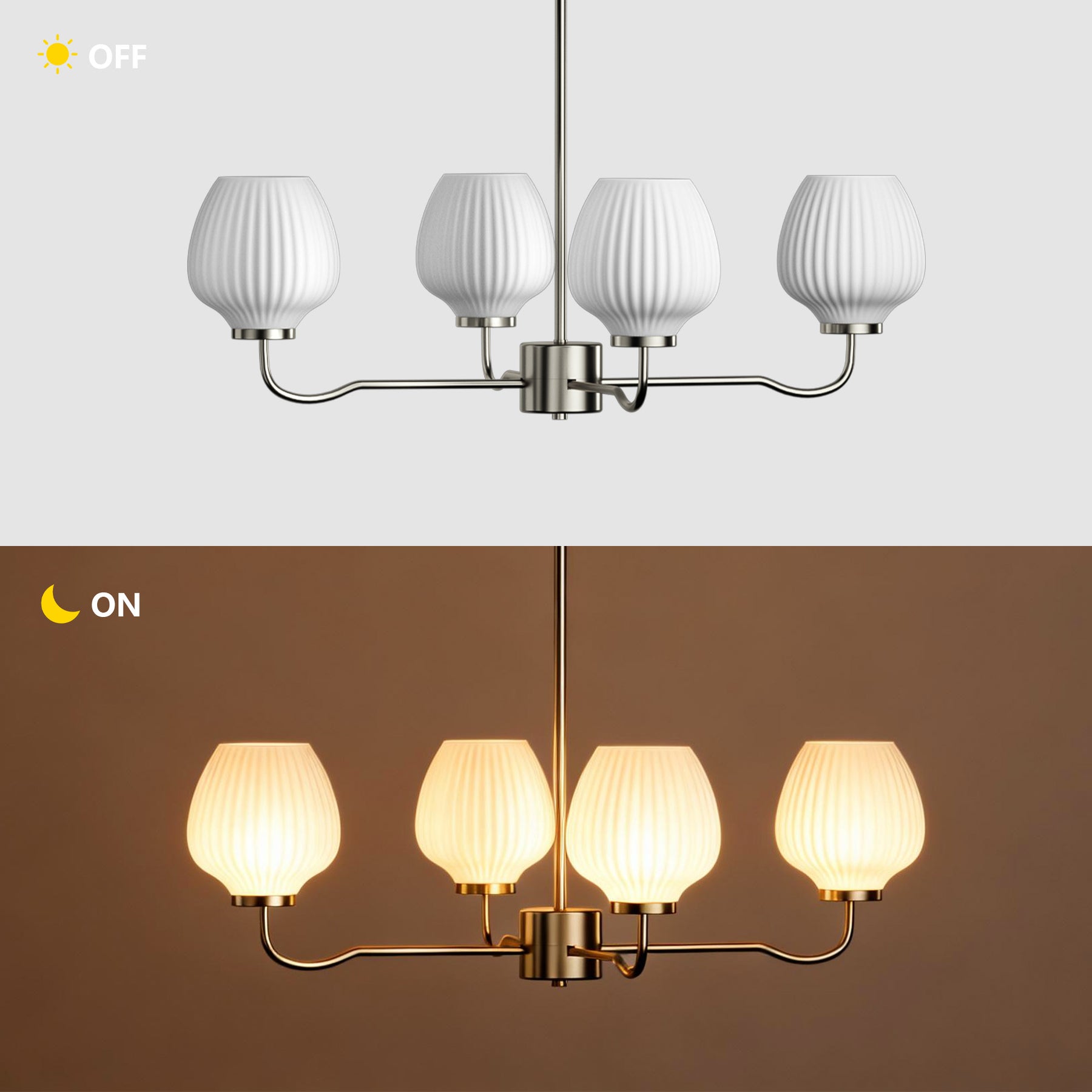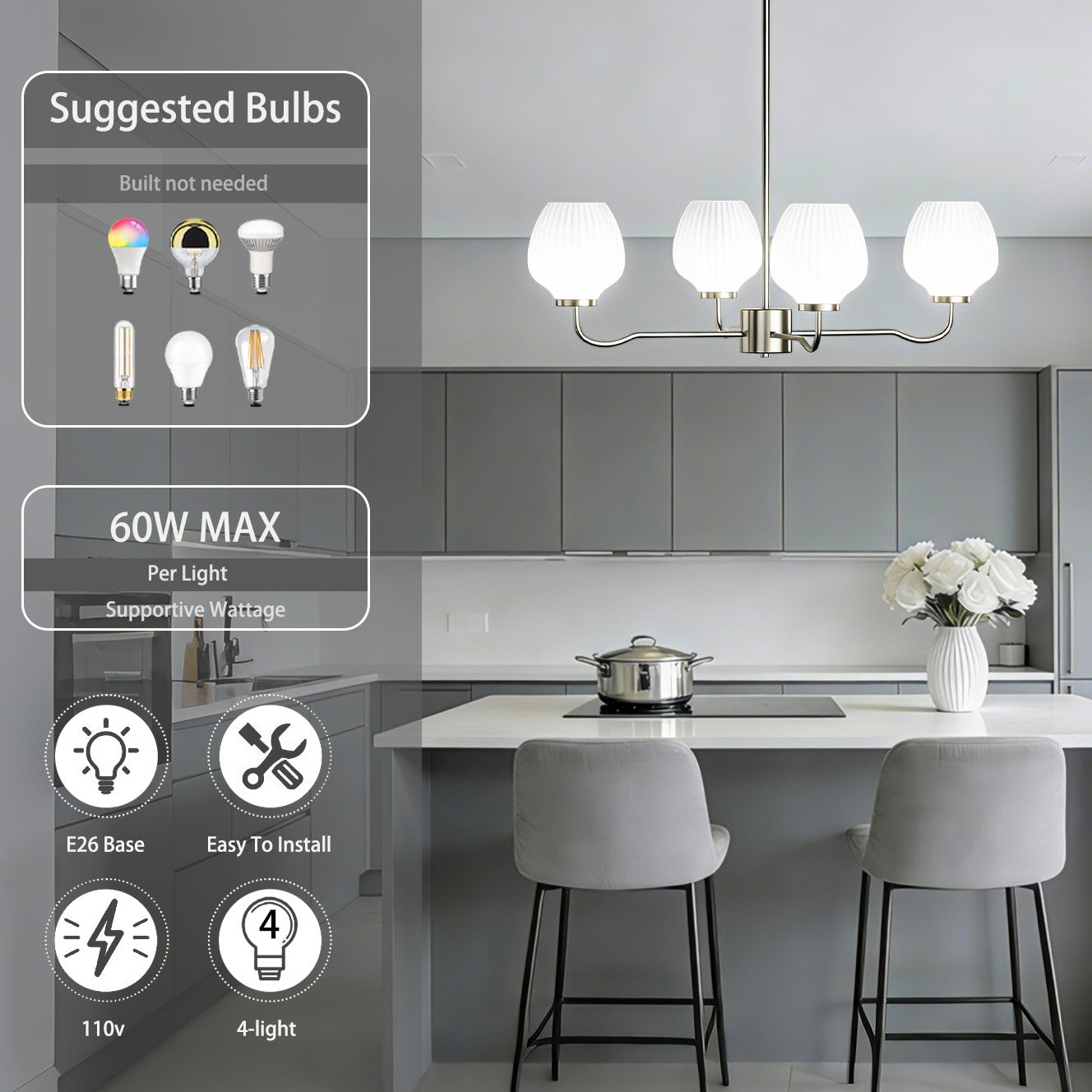 Enhance your space with this modern 4-light chandelier, featuring white frosted glass vase shades that softly diffuse light for a warm, comfortable glow. Its balanced, symmetrical design creates an elegant focal point above dining tables or kitchen areas, delivering even illumination without harsh glare. Designed for flexible installation, the chandelier includes adjustable downrods up to 42 inches and is compatible with sloped ceilings. ETL listed for safety, dimmable for brightness control, and easy to install, this fixture offers a perfect blend of modern style and everyday functionality.