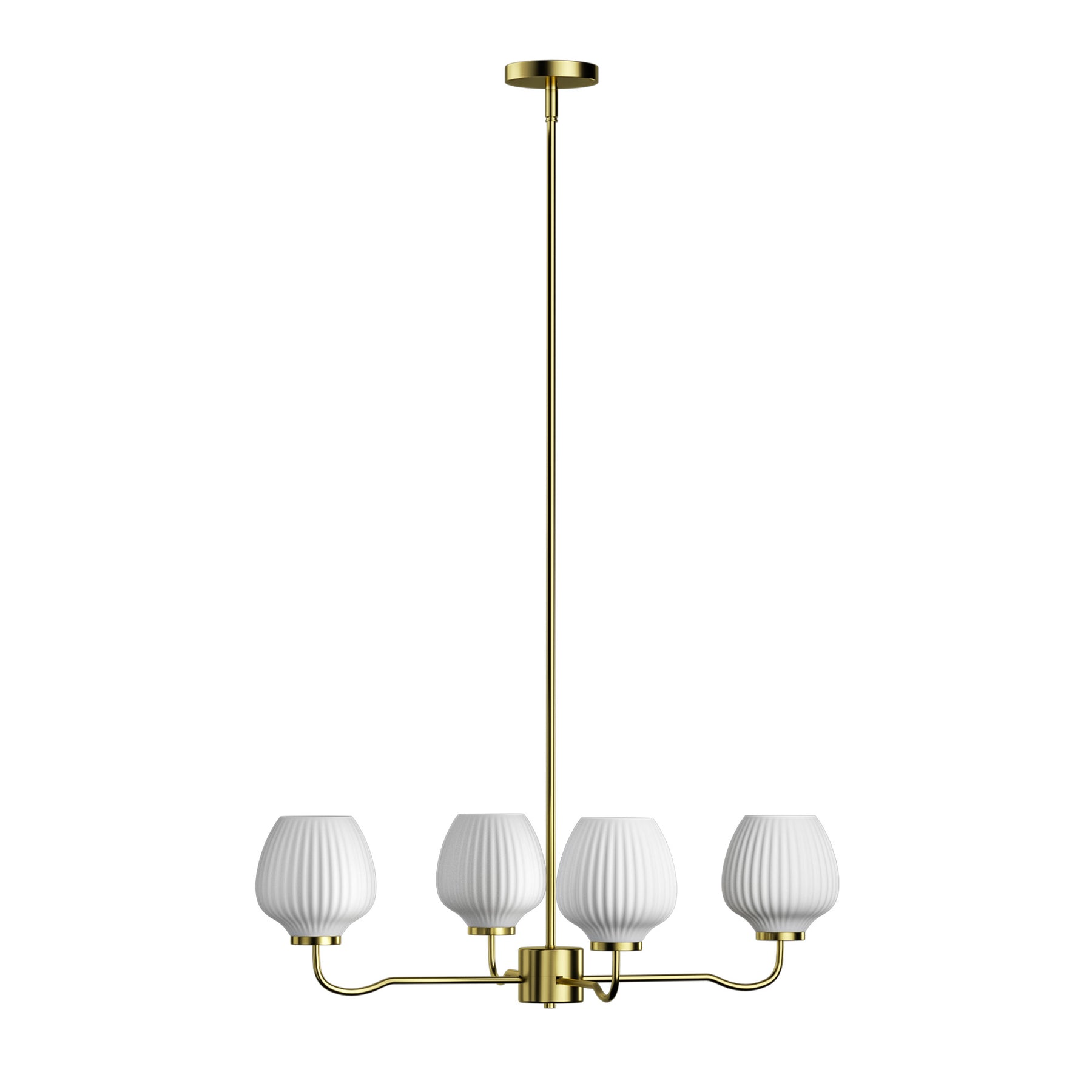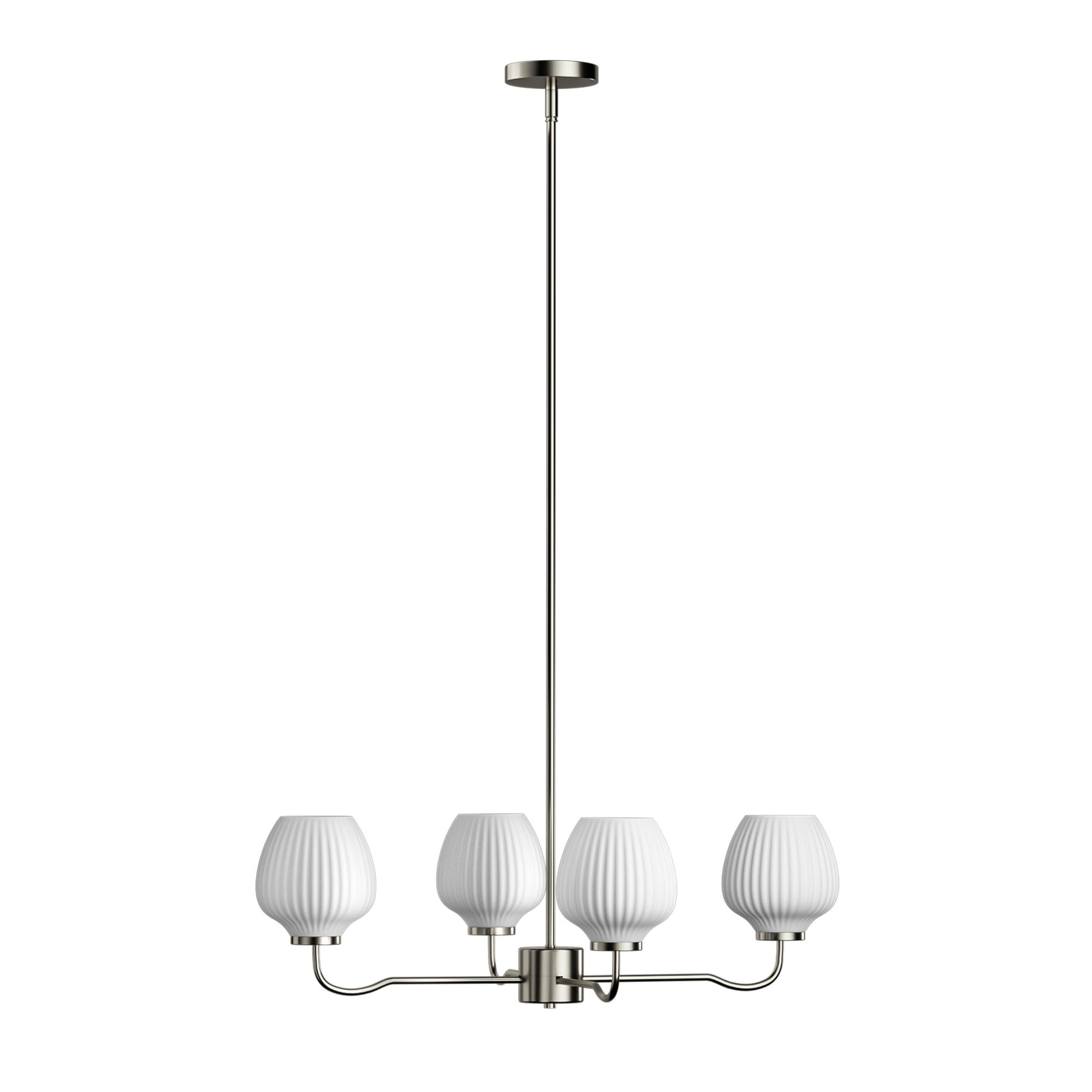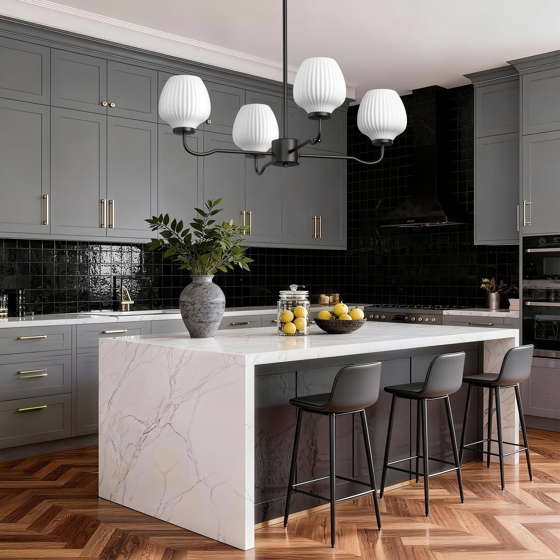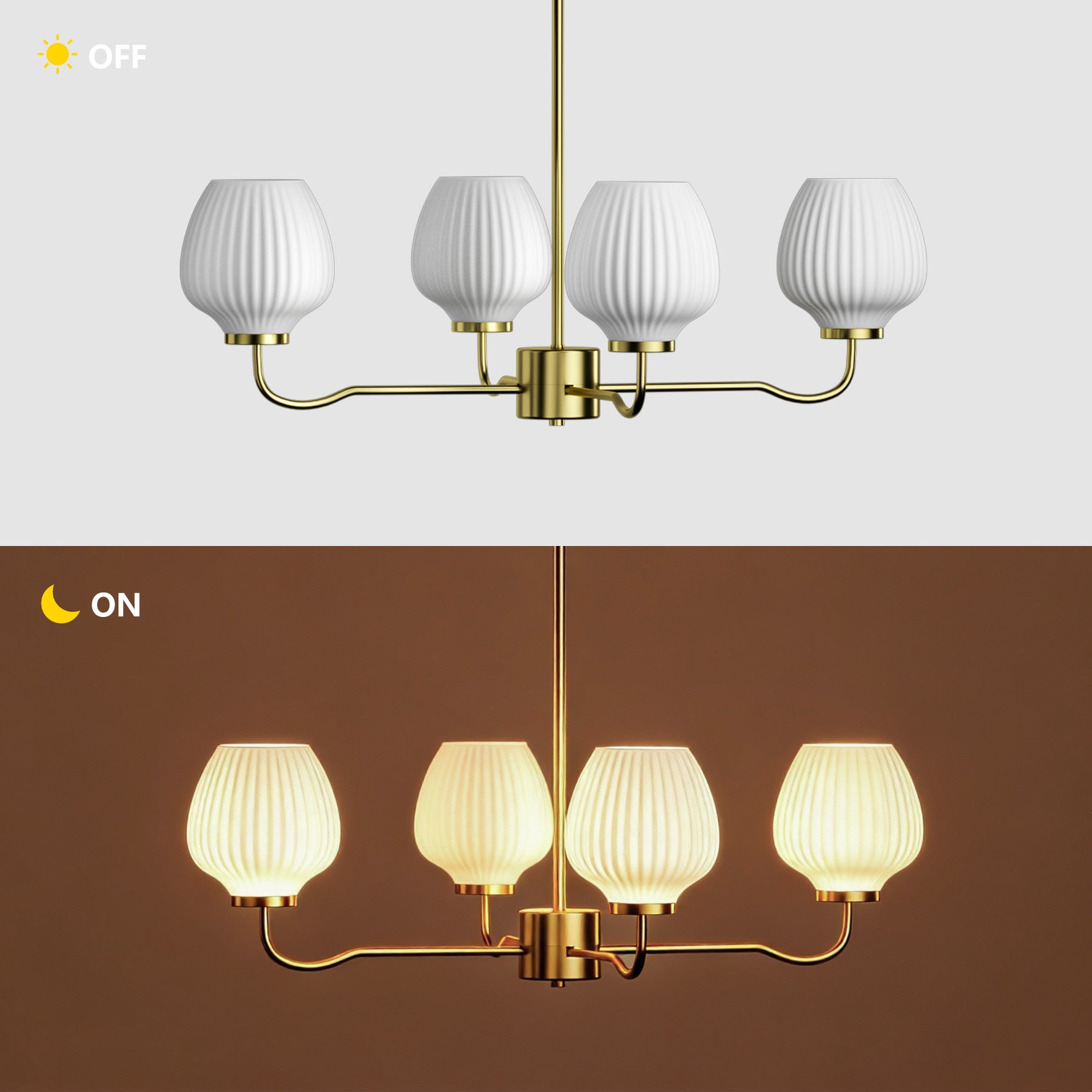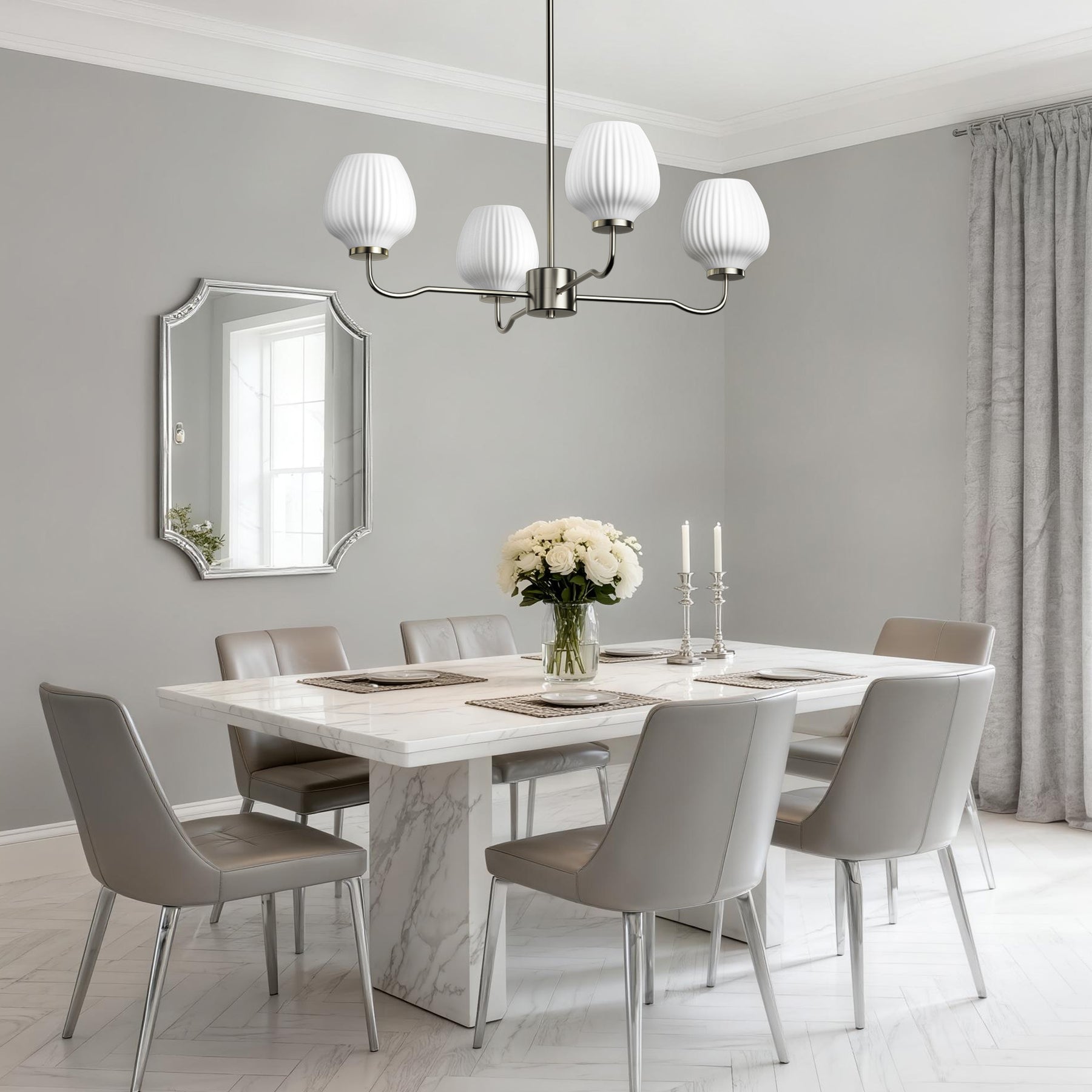 Enhance your space with this modern 4-light chandelier, featuring white frosted glass vase shades that softly diffuse light for a warm, comfortable glow. Its balanced, symmetrical design creates an elegant focal point above dining tables or kitchen areas, delivering even illumination without harsh glare. Designed for flexible installation, the chandelier includes adjustable downrods up to 42 inches and is compatible with sloped ceilings. ETL listed for safety, dimmable for brightness control, and easy to install, this fixture offers a perfect blend of modern style and everyday functionality.