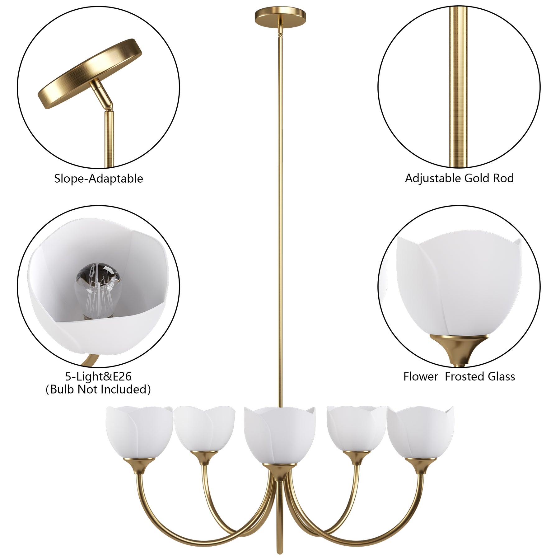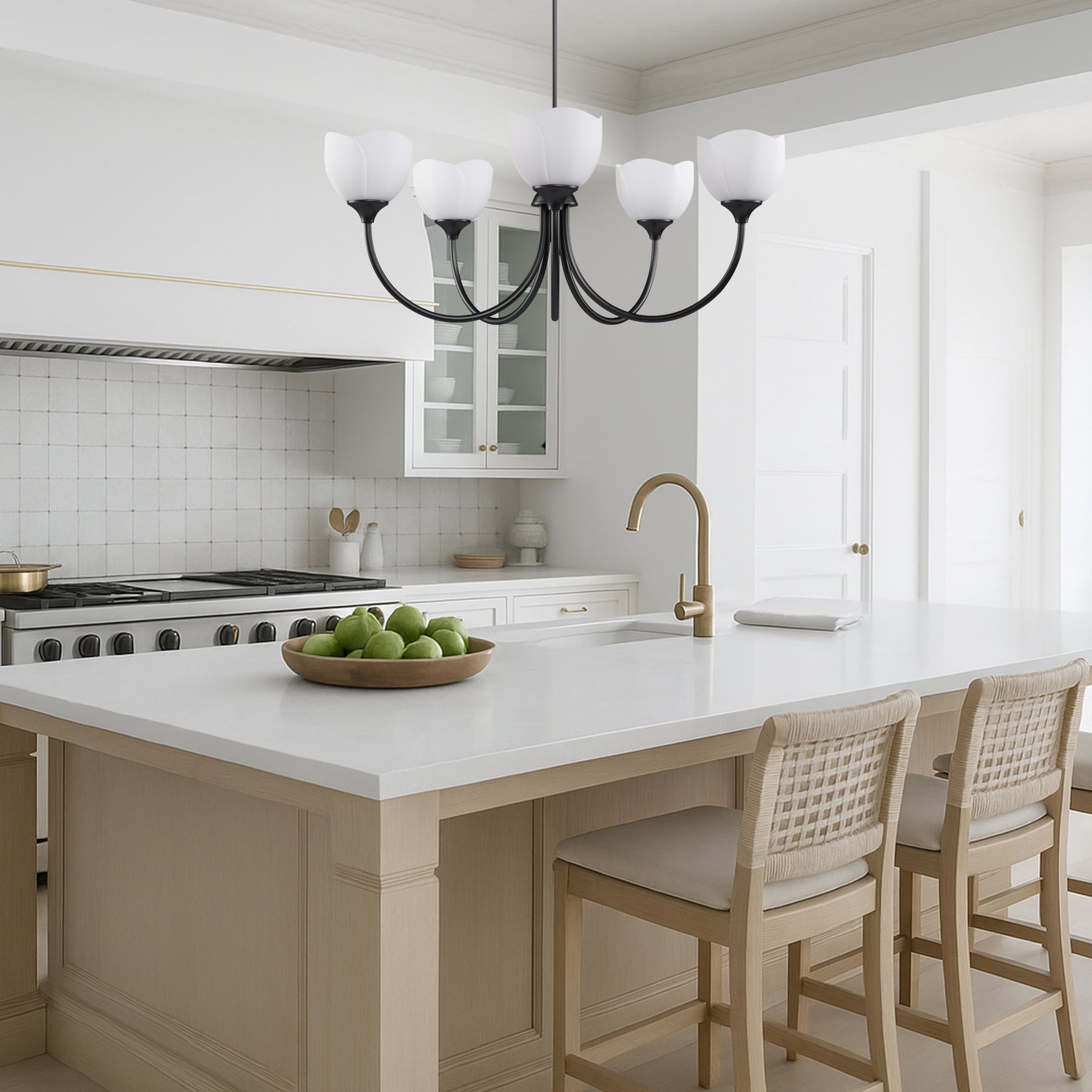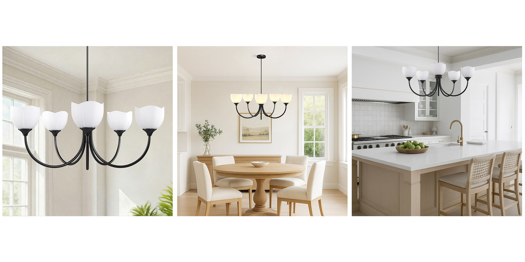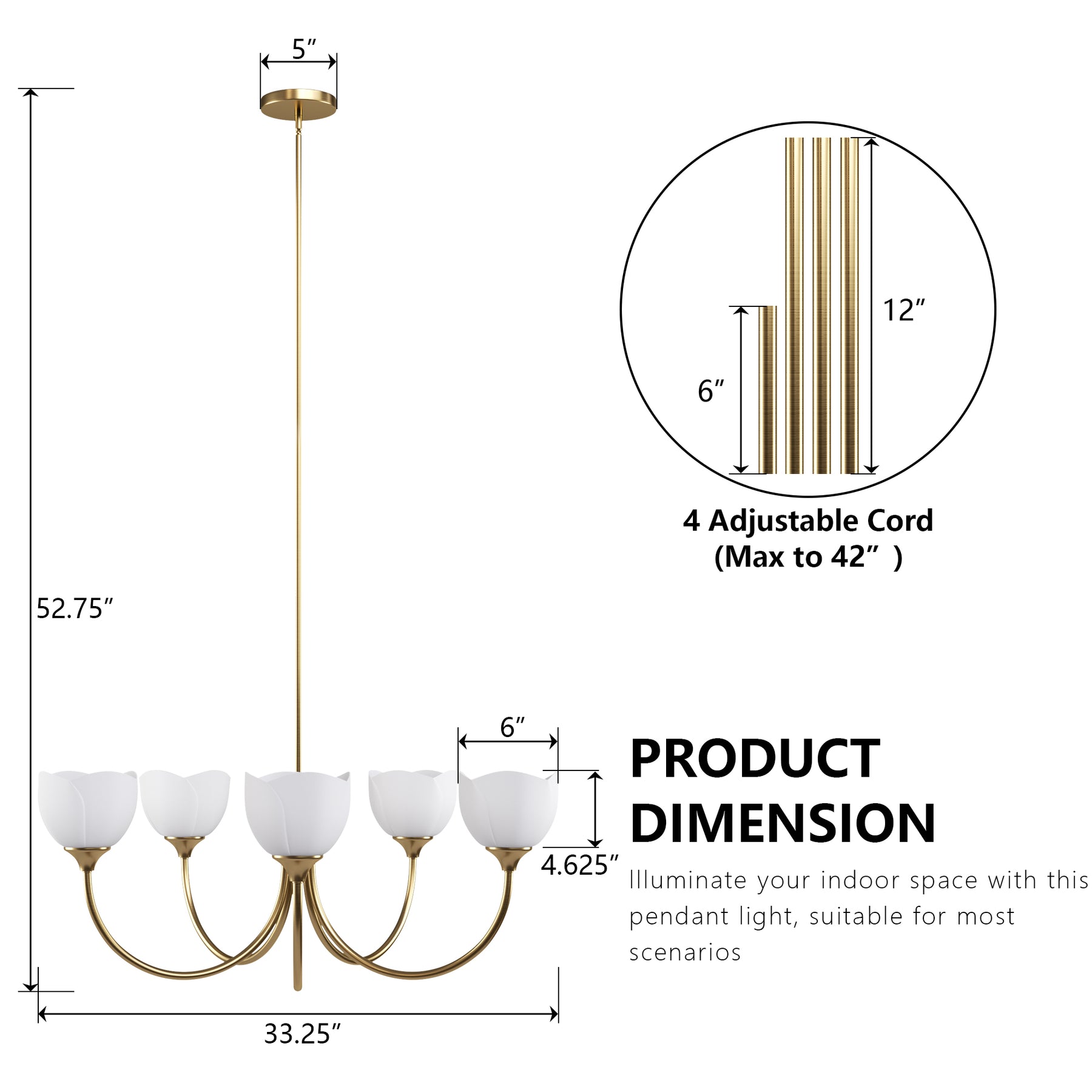 Elevate your space with a chandelier that’s as graceful as it is functional. Crafted from sturdy iron and accented with opal glass flower shades, this design brings a soft, inviting glow that feels effortlessly elegant. The 42" adjustable downrod adapts to your ceiling height, while ETL certification ensures safe, reliable use. Perfect for dining rooms, living areas, or entryways, this versatile statement piece transforms any room into a warm and stylish retreat.
