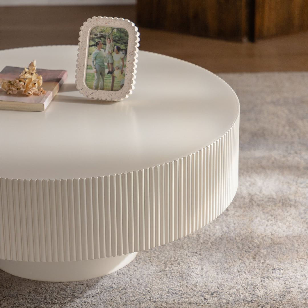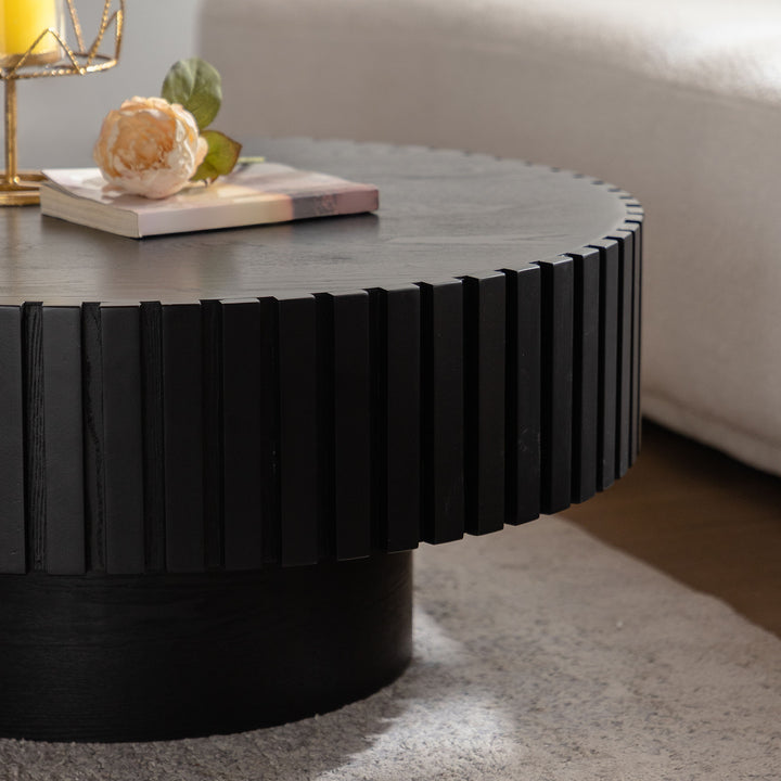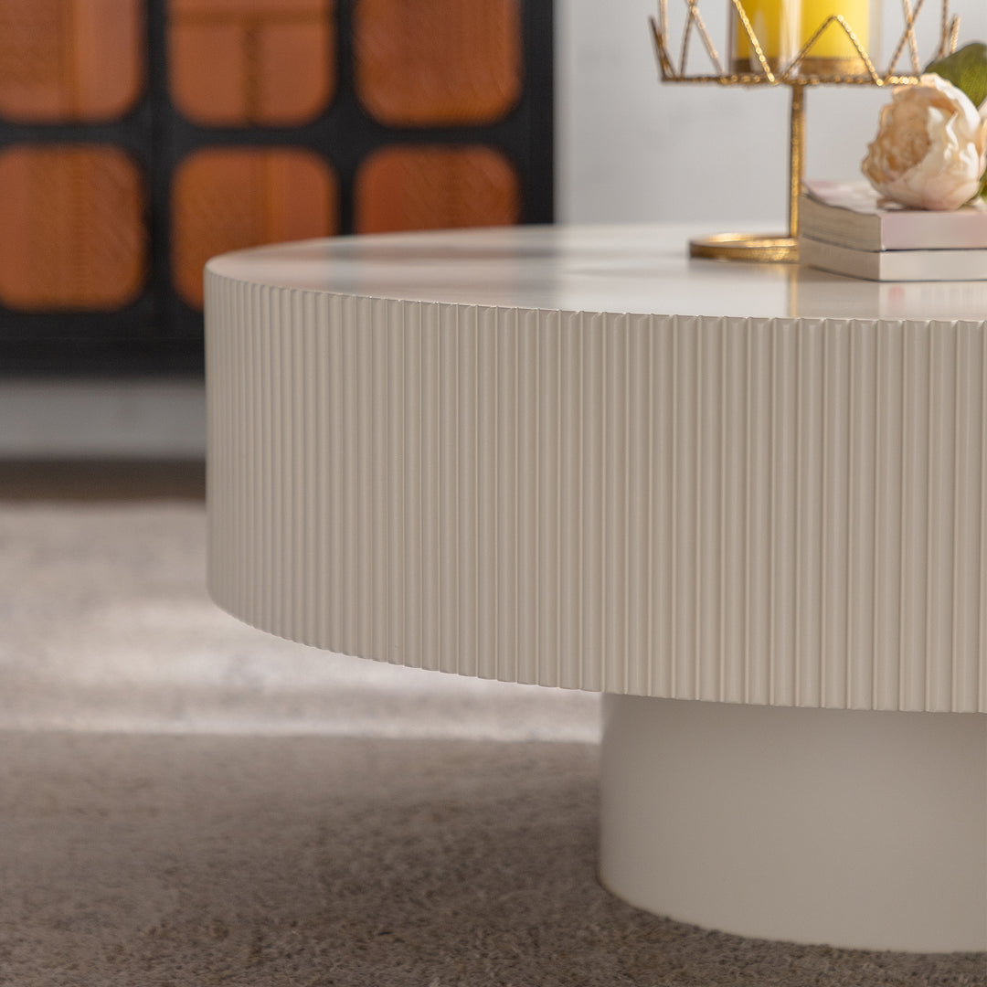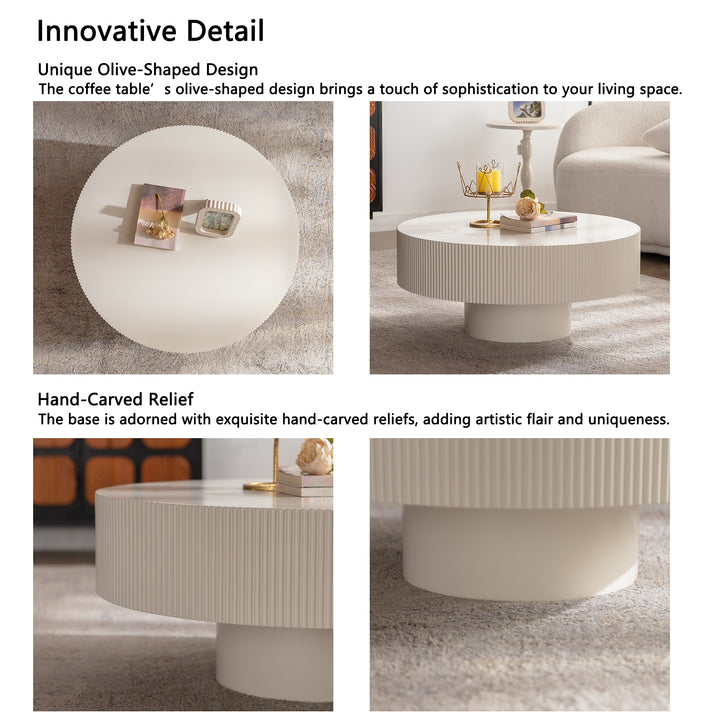Introducing our stylish oval round coffee table, designed to add a touch of elegance to your modern living room. Featuring a sleek and simple design with olive-shaped accents, handmade grooves, and reliefs, this table combines sophistication with industrial charm. Crafted with a sturdy MDF base and solid wood reliefs, it offers both support and aesthetic appeal. Easy to install with all hardware and instructions provided, this versatile coffee table is perfect for various settings and styles. Choose from multiple colors to match your unique taste and create a cozy and inviting atmosphere in your home.