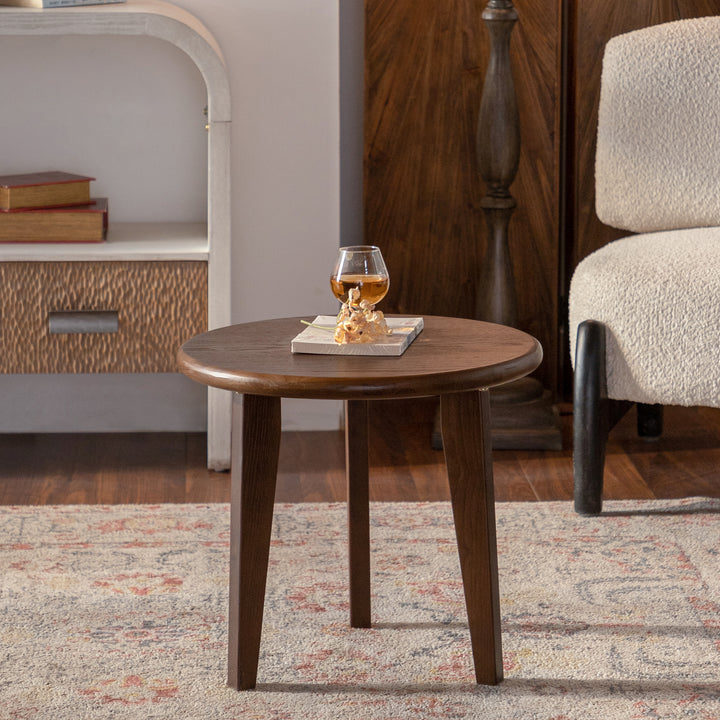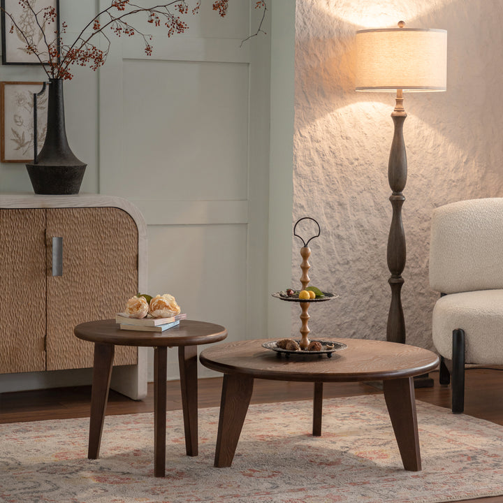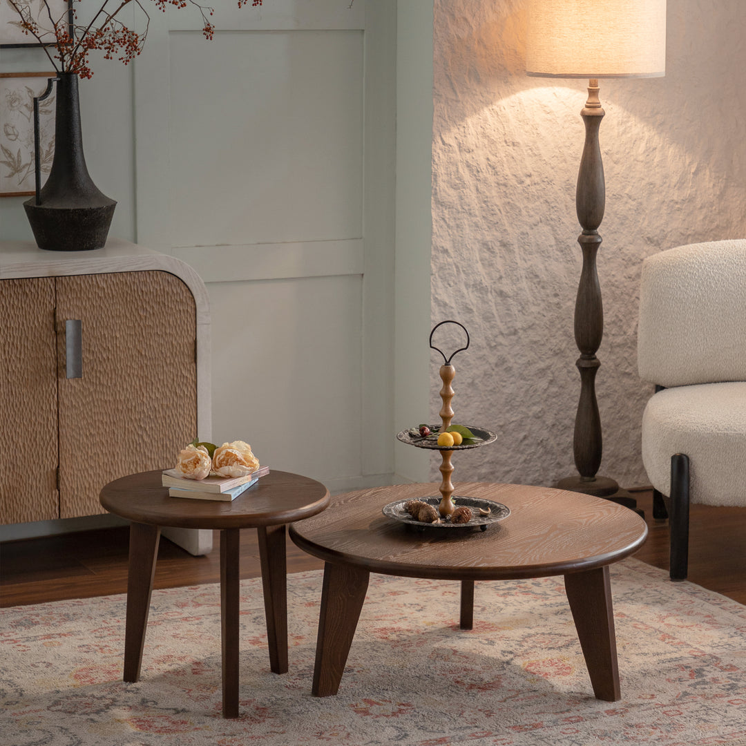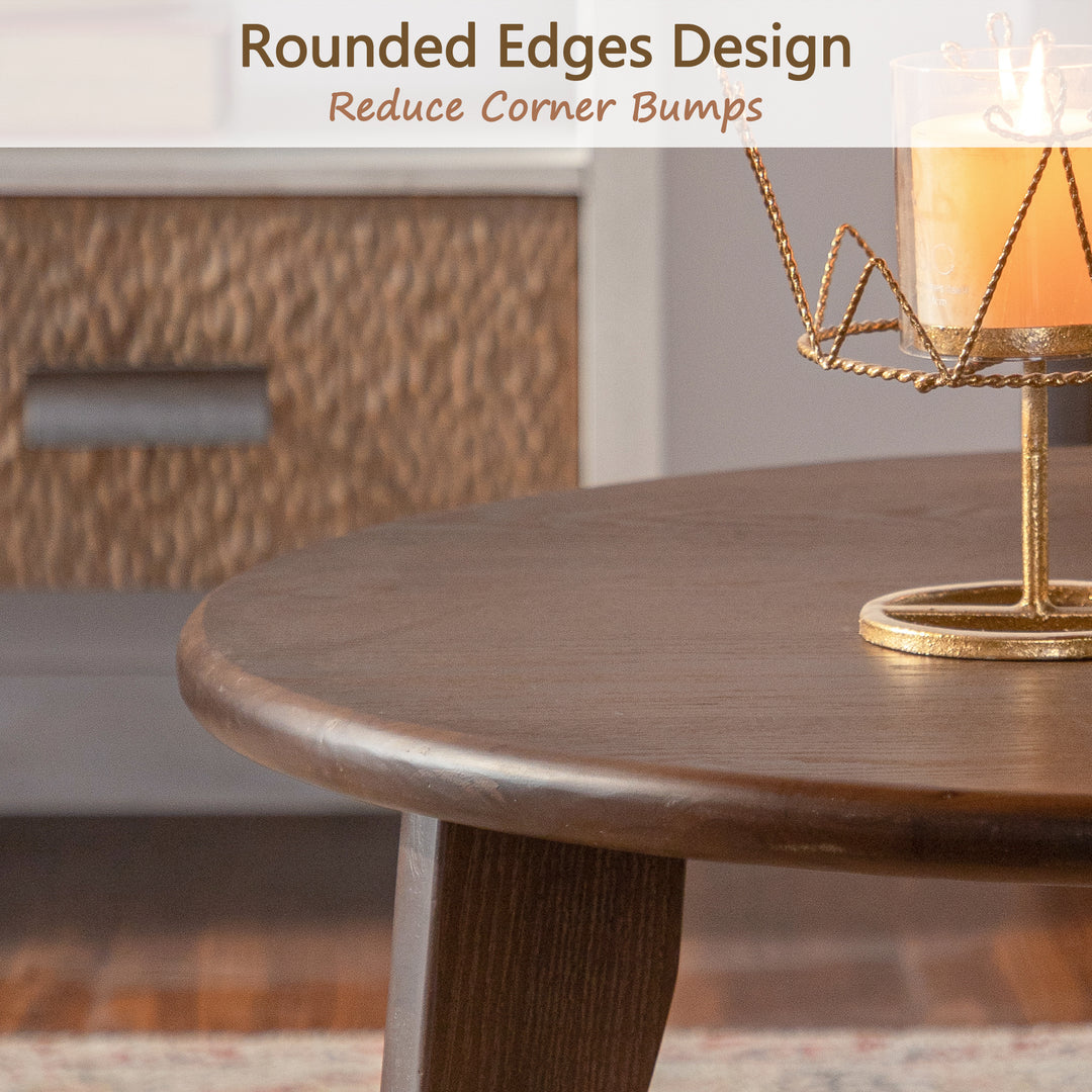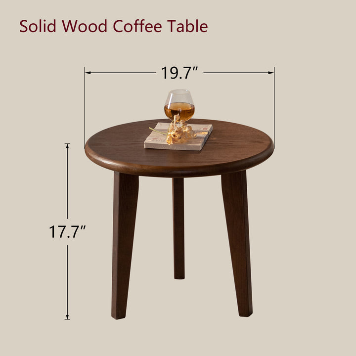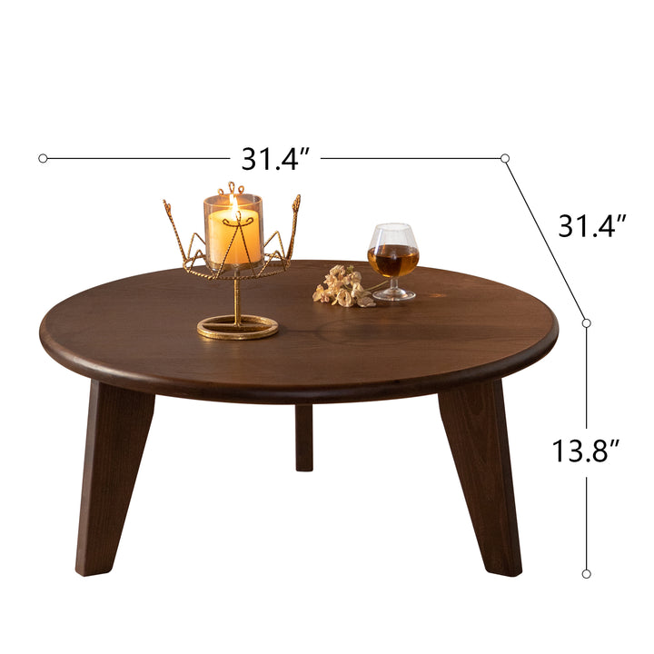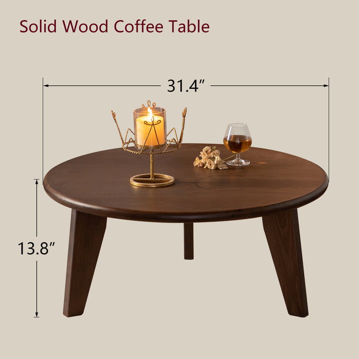 Elevate your home decor with this elegant round coffee table, featuring a spacious solid wood top that provides a generous surface for displaying decor items or enjoying beverages. Its deep wood finish adds a touch of sophistication, seamlessly fitting into both living room and bedroom settings. The sturdy three-legged base, crafted from solid wood, ensures stability while enhancing the table's unique charm. Perfectly blending modern and rustic styles, this coffee table is a versatile and stylish addition to any space, offering both functionality and aesthetic appeal.