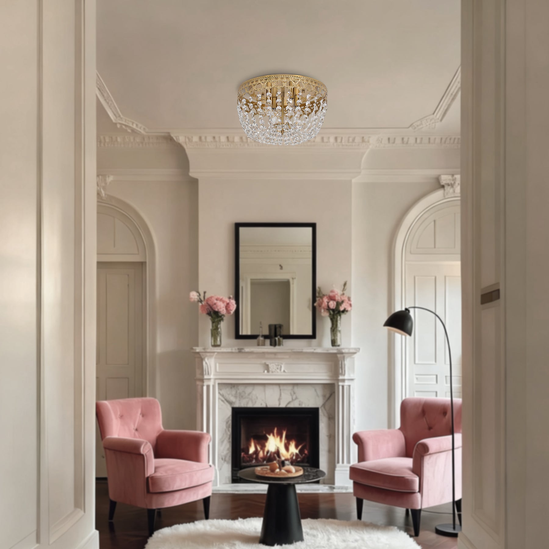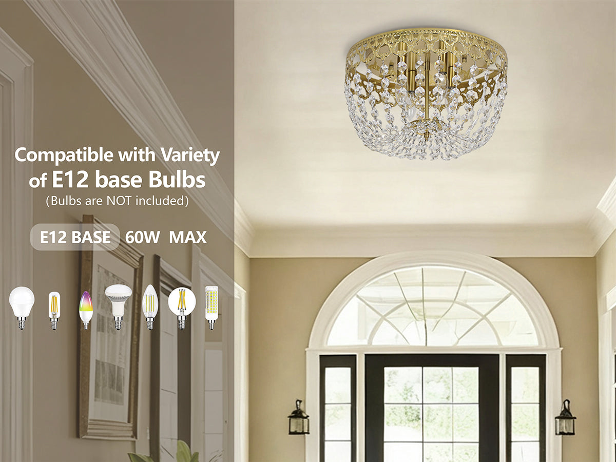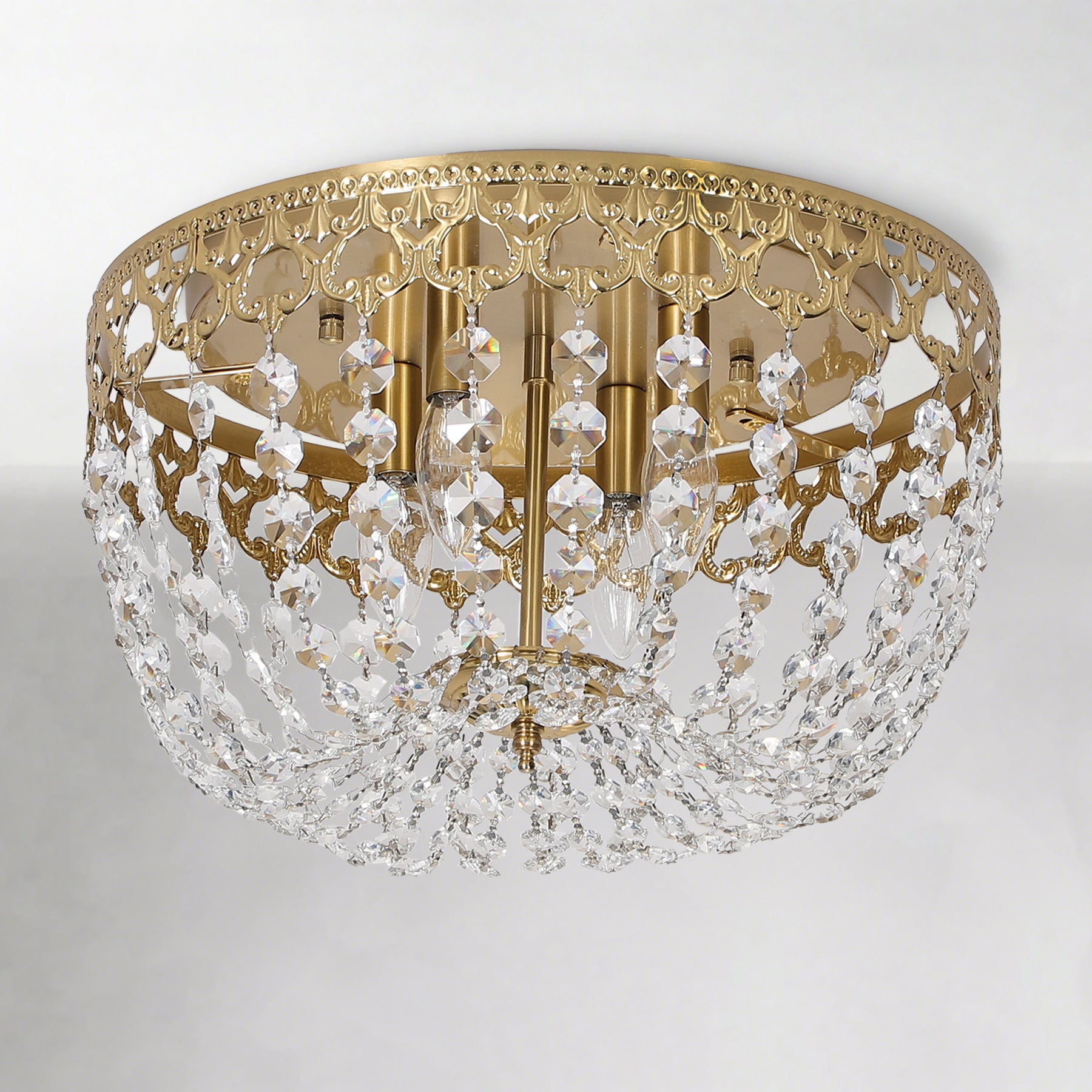This 4-light flush-mount ceiling light is the ideal decorative fixture for lower ceilings. Made from wrought iron metal with a neutral finish, this bowl-shaped fixture features strings of acrylic crystals that extend down from the ceiling and gather at the center, refracting light to create a glam look. This flush mount works in any dry environment, from your entryway or hallway to your bedroom or dining room. Plus, this fixture is dimmer-switch compatible and accommodates four 60W bulbs (sold separately).