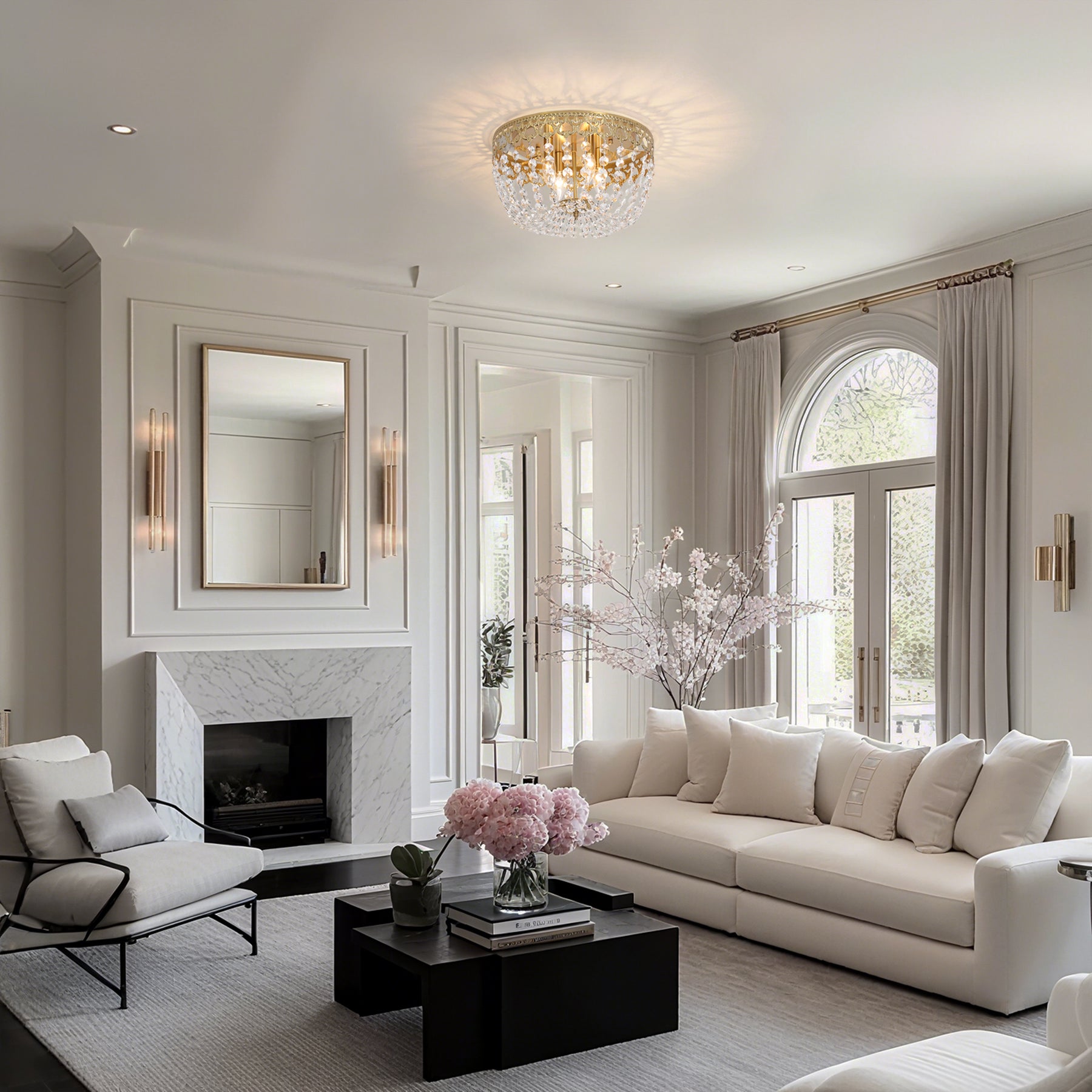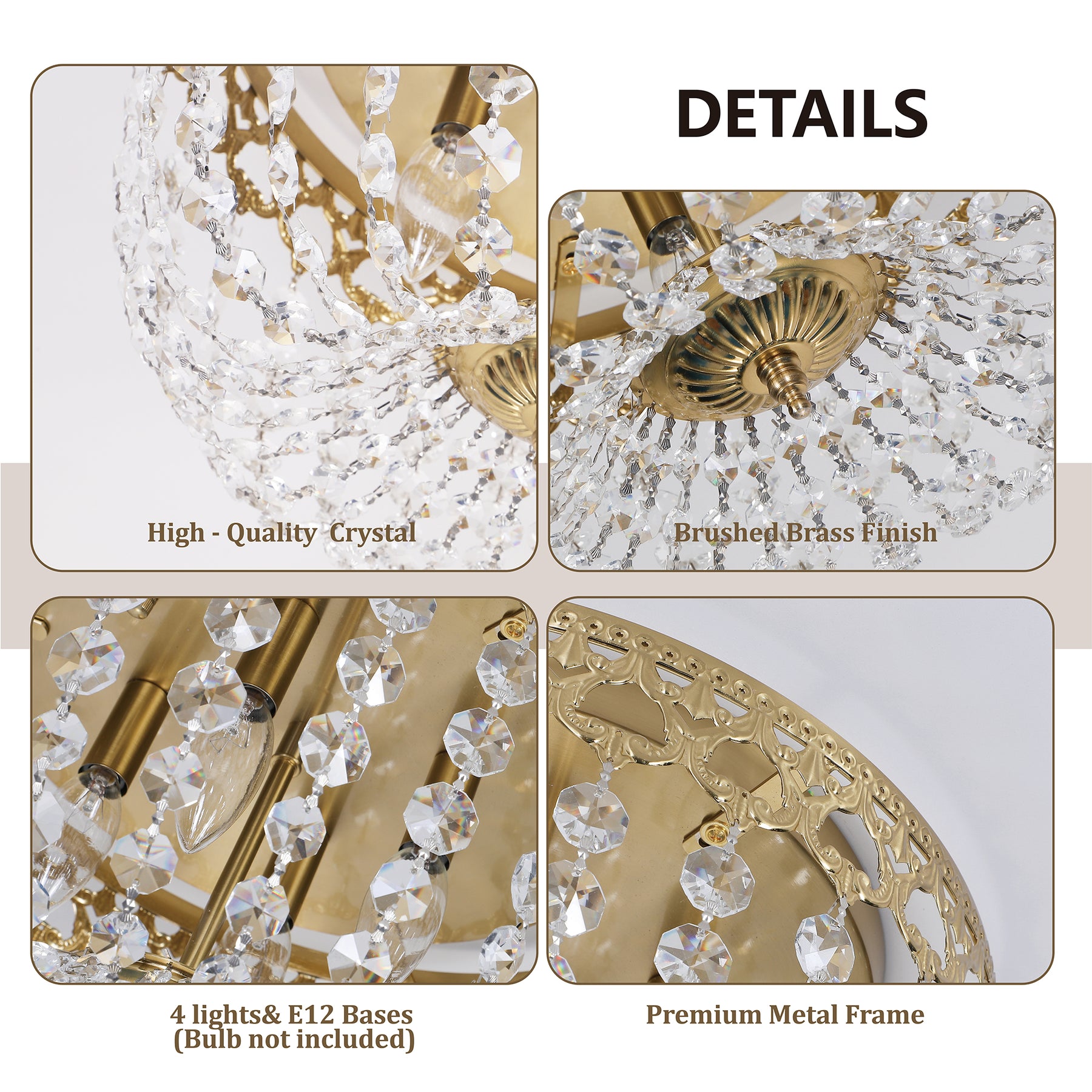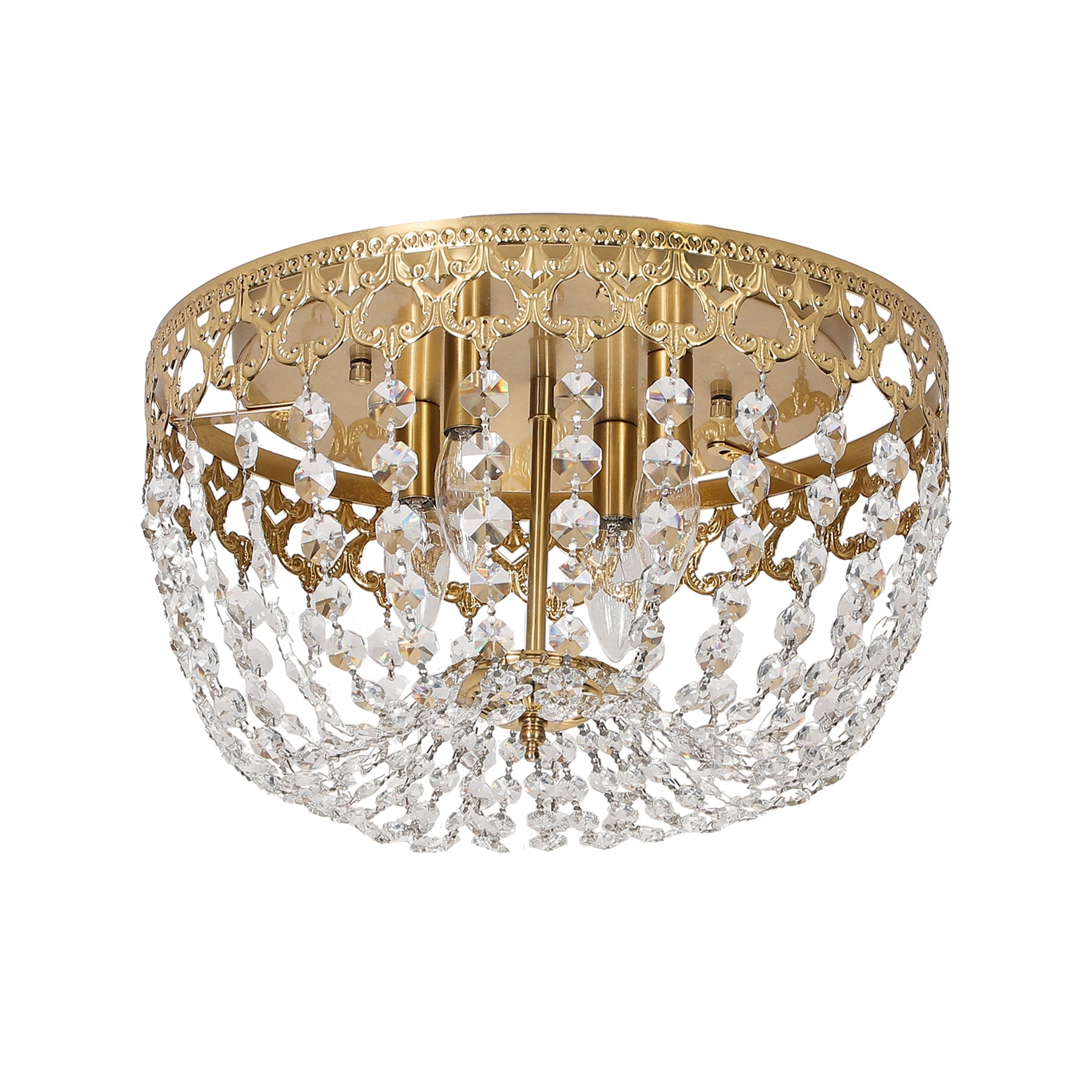 This 4-light flush-mount ceiling light is the ideal decorative fixture for lower ceilings. Made from wrought iron metal with a neutral finish, this bowl-shaped fixture features strings of acrylic crystals that extend down from the ceiling and gather at the center, refracting light to create a glam look. This flush mount works in any dry environment, from your entryway or hallway to your bedroom or dining room. Plus, this fixture is dimmer-switch compatible and accommodates four 60W bulbs (sold separately).