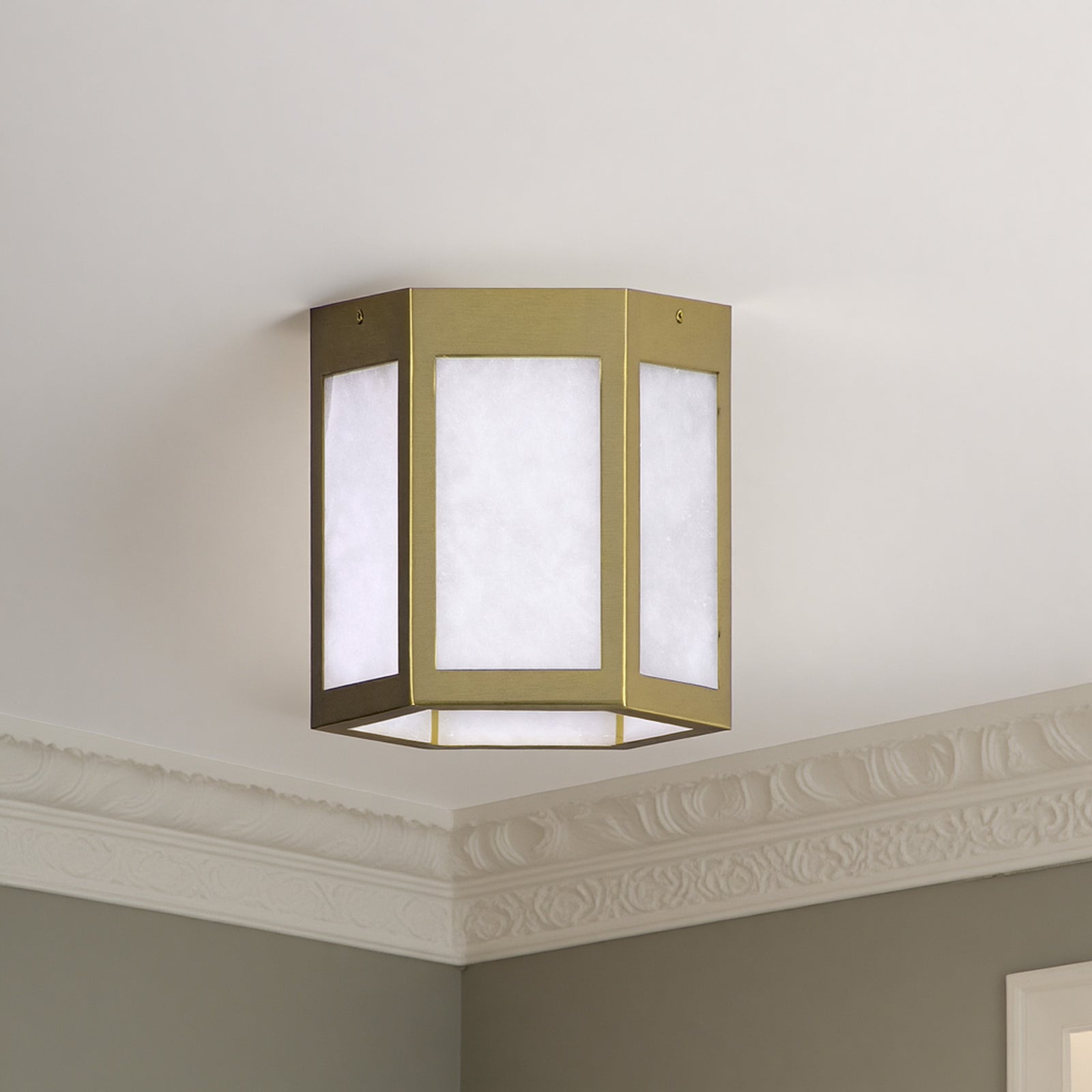 • The white decorative glass diffuser filters light softly and evenly, adding visual texture and a warm ambient glow.