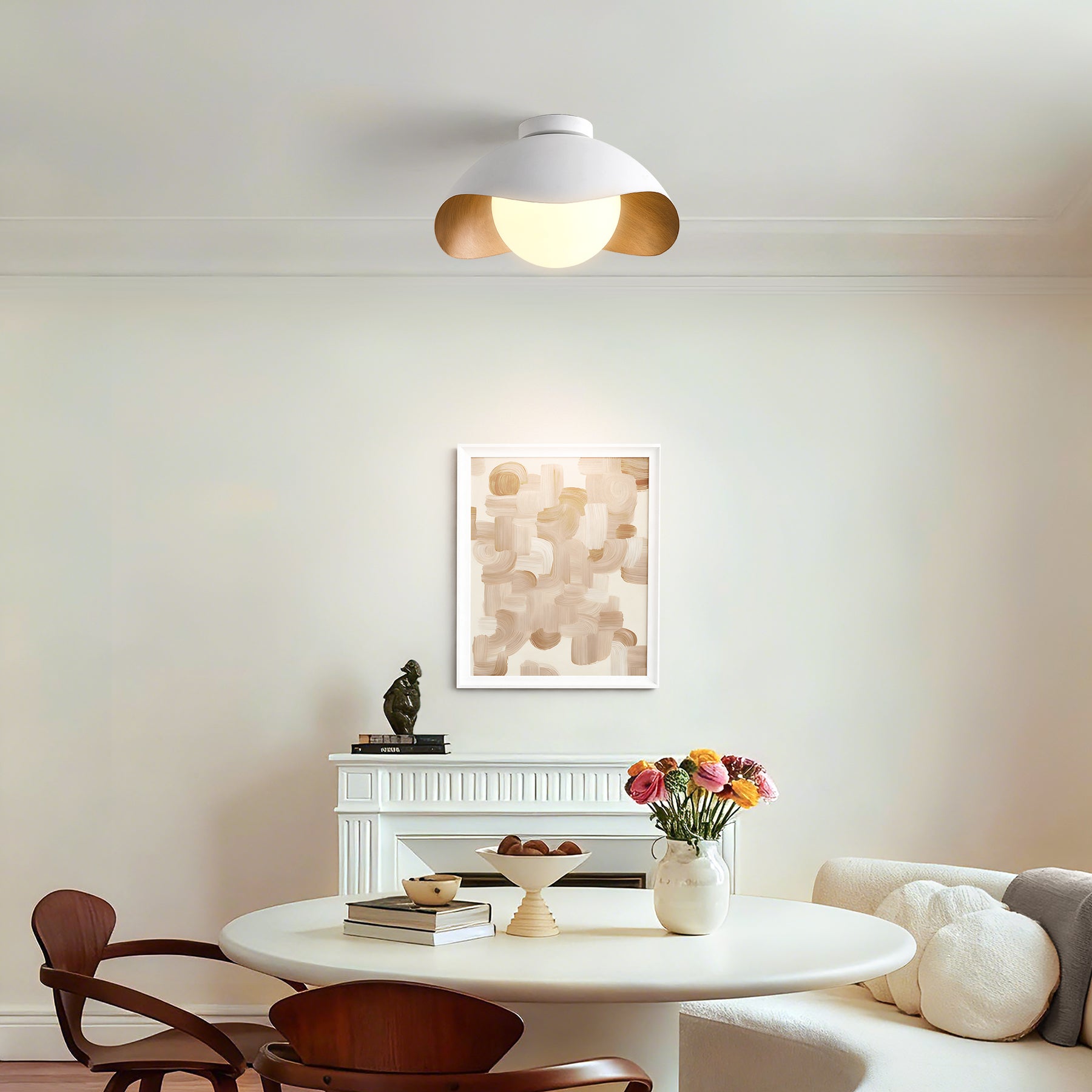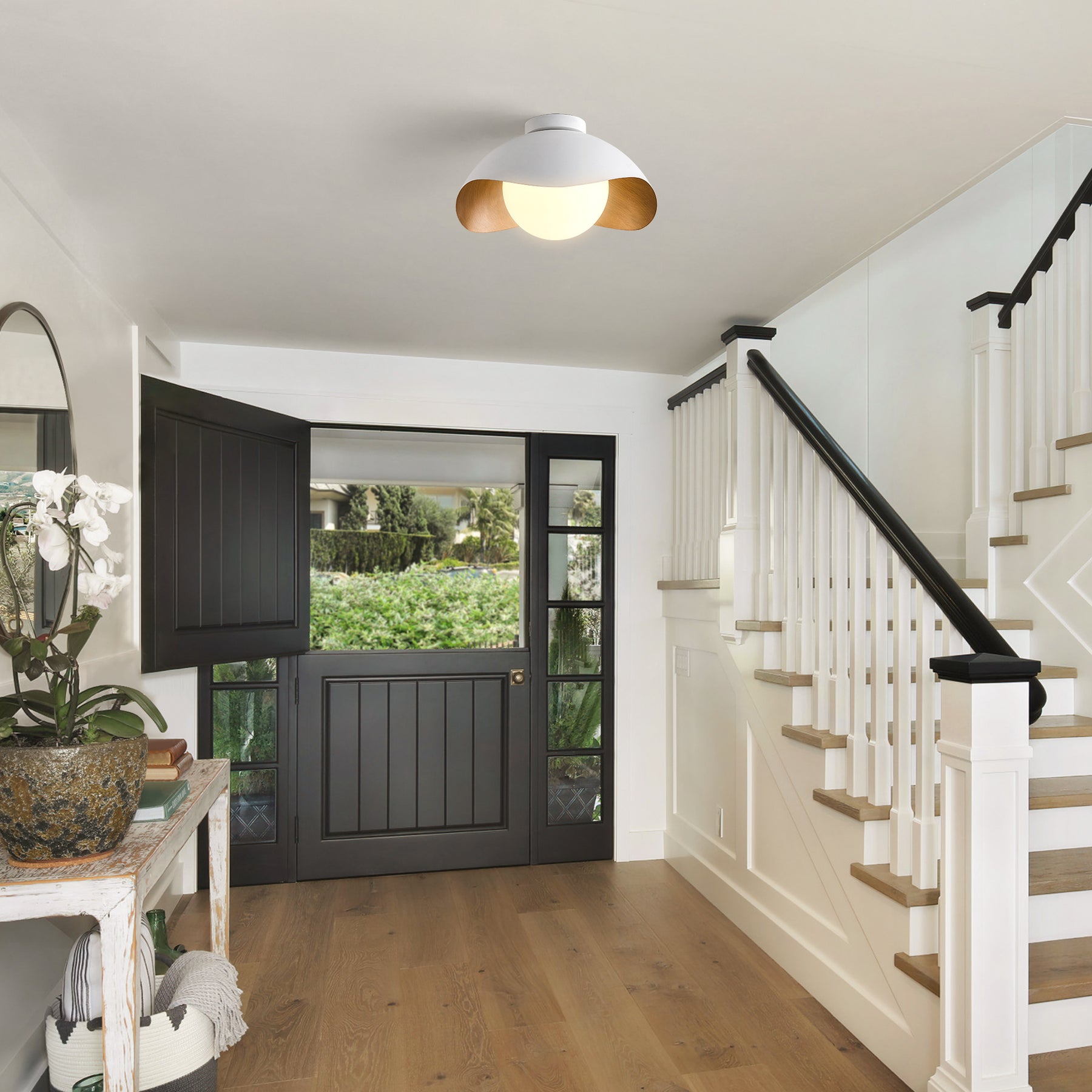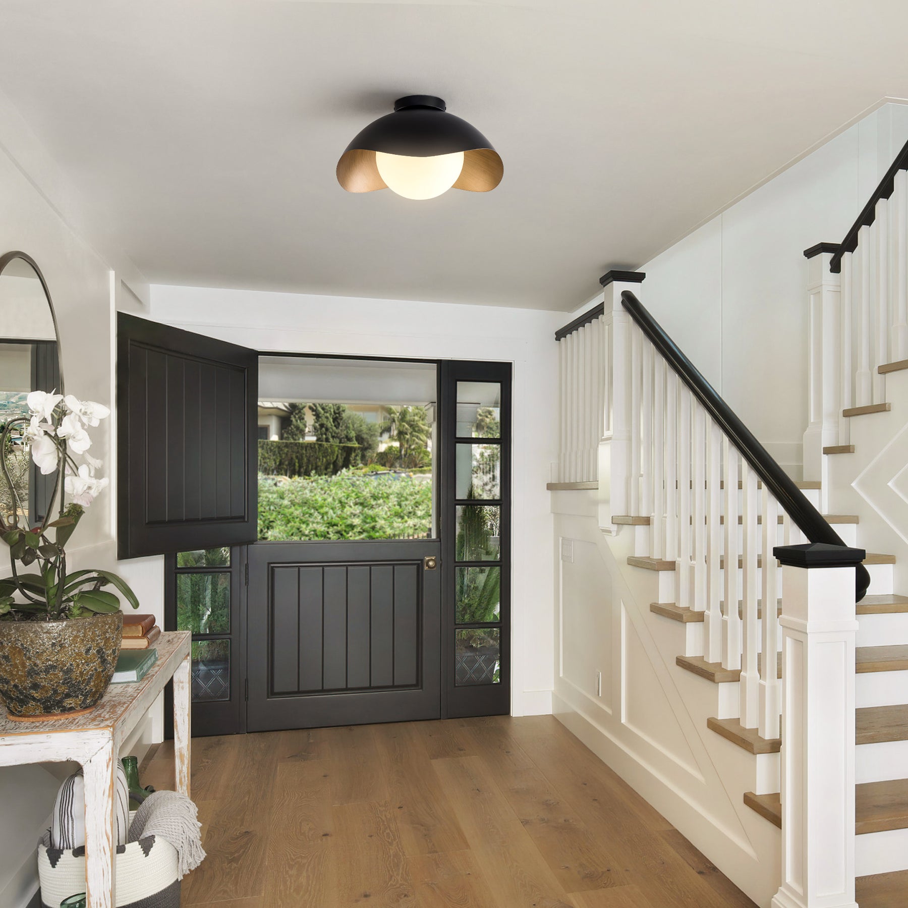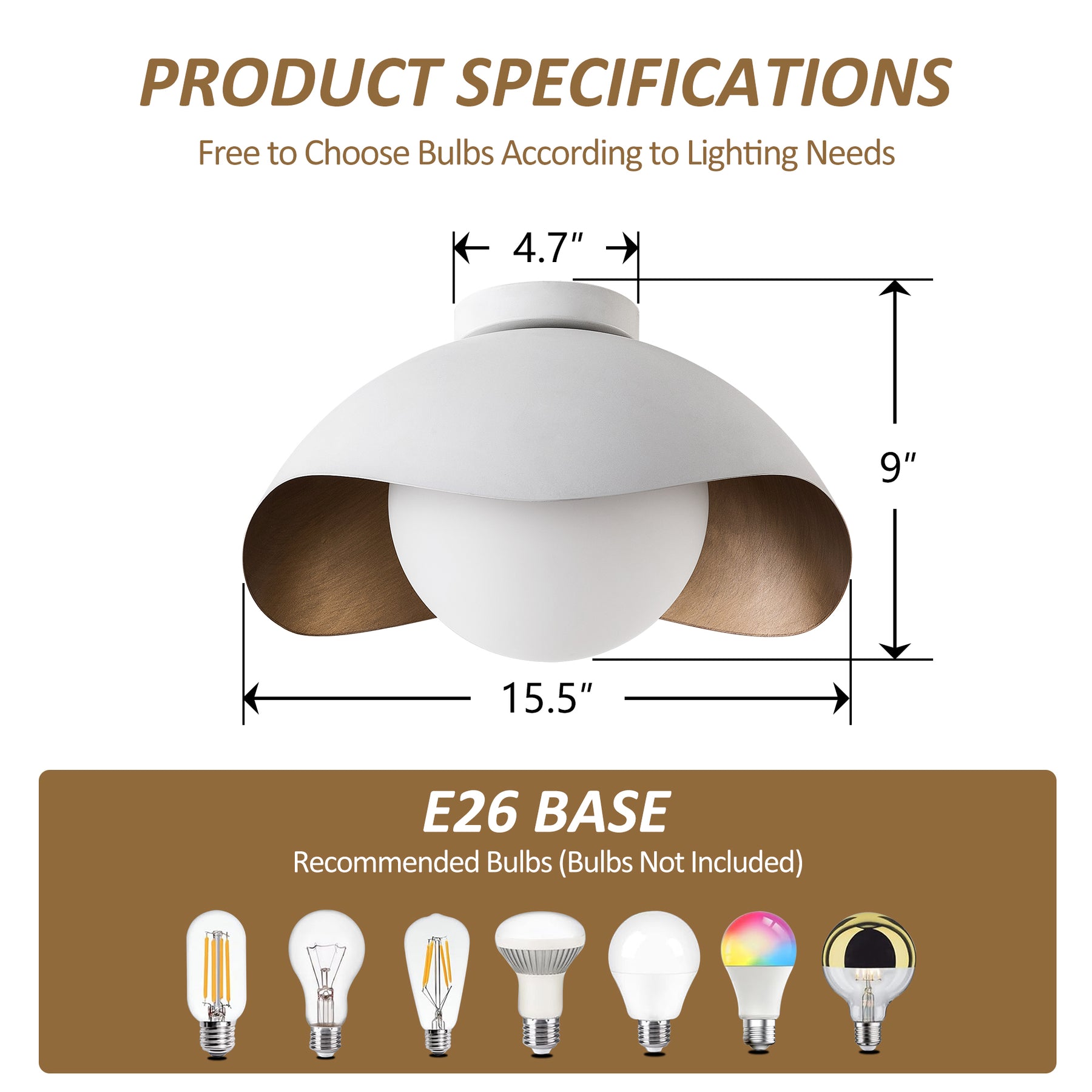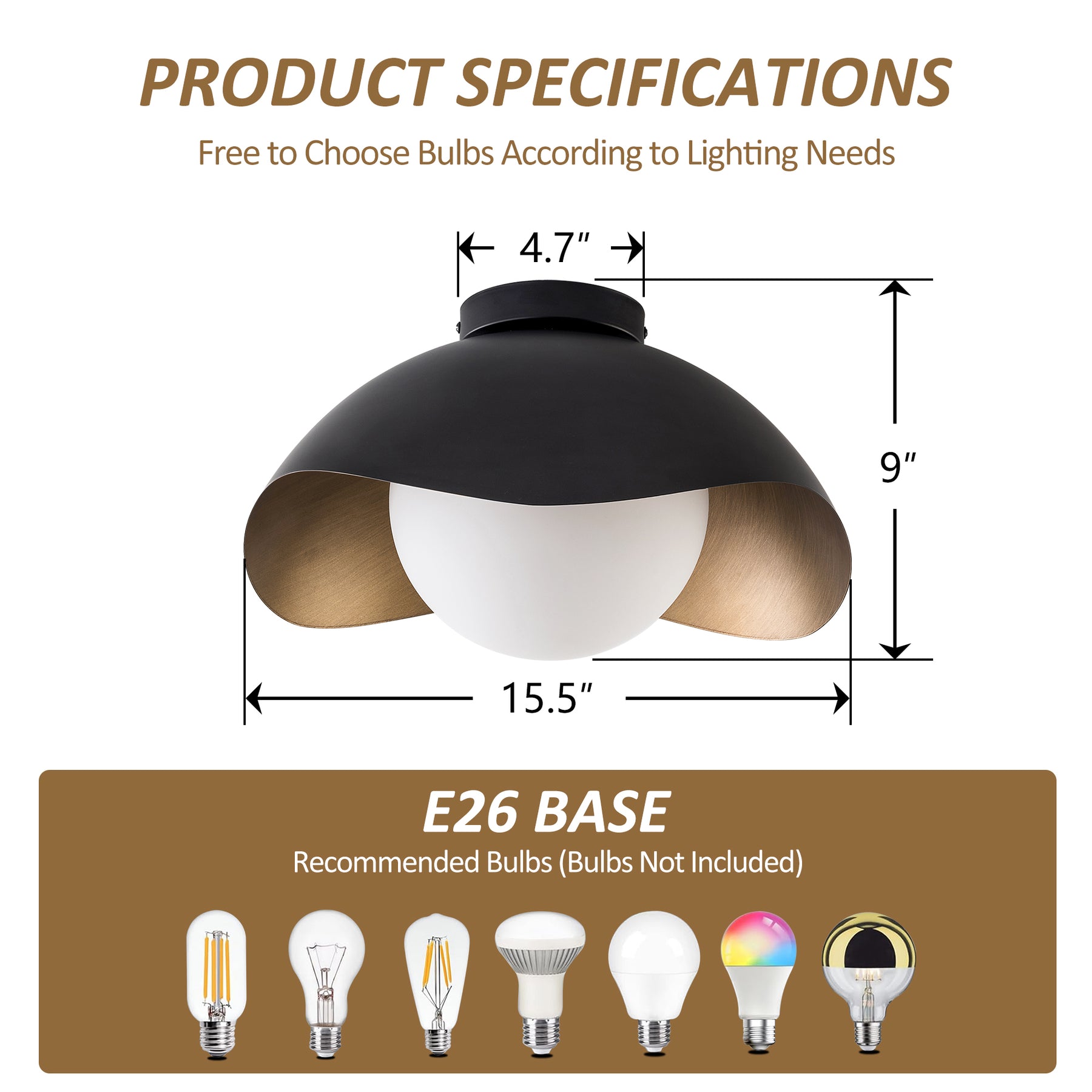 Bring a touch of modern elegance to your home with this stylish flush mount ceiling light. Featuring a sleek metal shade finished in matte black or matte white with a warm gold interior, this fixture delivers a beautiful contrast that enhances any contemporary or transitional décor. The durable metal-and-glass construction ensures long-lasting quality, while the 9" × 15.5" curved shade design provides a soft, inviting glow. Compatible with a single E26 bulb up to 60W and fully dimmable, this light is perfect for bedrooms, hallways, entryways, and living areas. ETL-listed for safety and easy to install, it’s a refined lighting solution for any space.