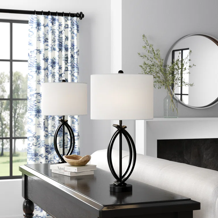 Maxax 26" Creative Black Metal Table Lamp Set of 2 with White Fabric Drum Shade #T81