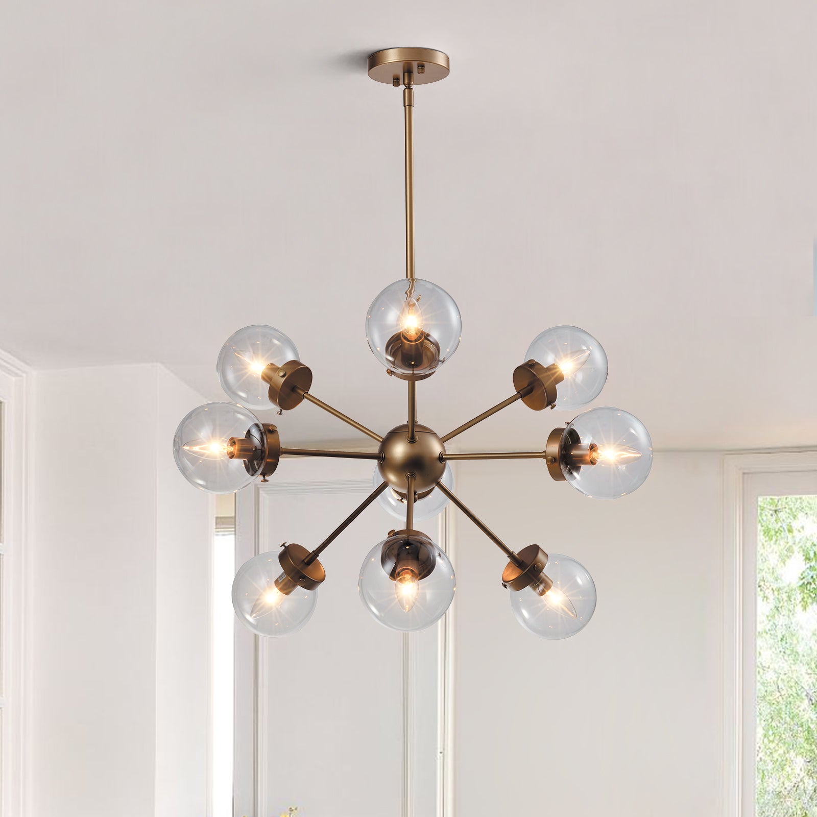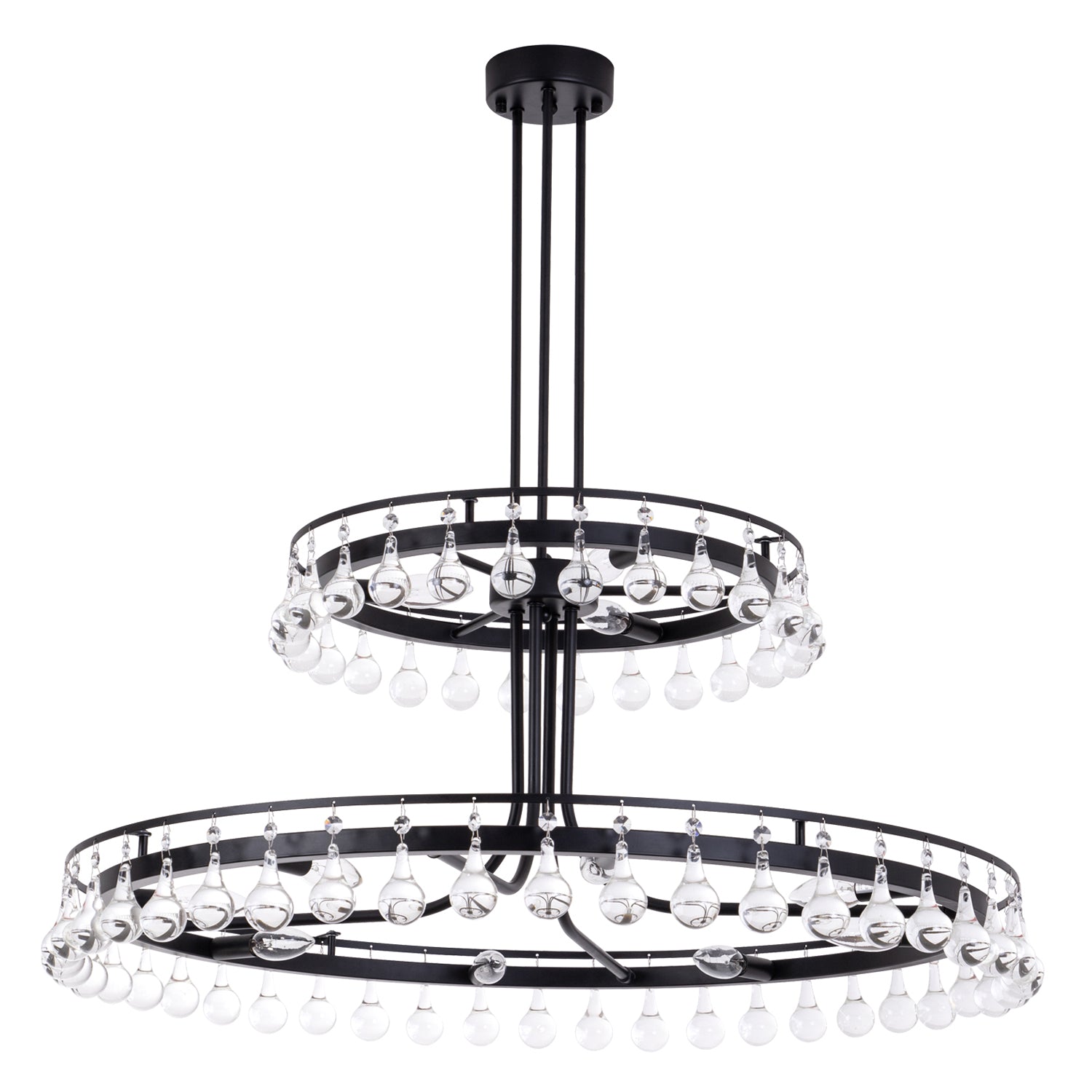 It is a beautiful chandelier. It took some time to figure out and assemble. The design was too ornate for my humble dining room with a standard high ceiling, so eliminated bottom danglers and connecting danglers. With no danglers, the bottom of the chandelier is about 6 feet from the floor. The light bulbs make a big difference in their look. I used traditional standard CLEAR light bulbs for a sparkling effect. The plain ceiling medallion was also installed.