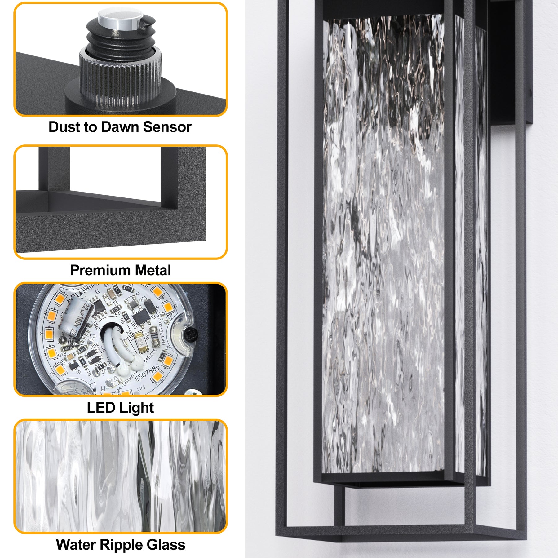 - Unique Appearance, Light Up the Style: The unique water ripple glass of this outside lights for house can not only evenly scatter the light, projecting a dreamy and soft ripple light and shadow, but also ensure sufficient lighting. Create a warm and charming light luxury atmosphere for your porch, courtyard or entrance, and become the finishing touch to enhance the outdoor space.