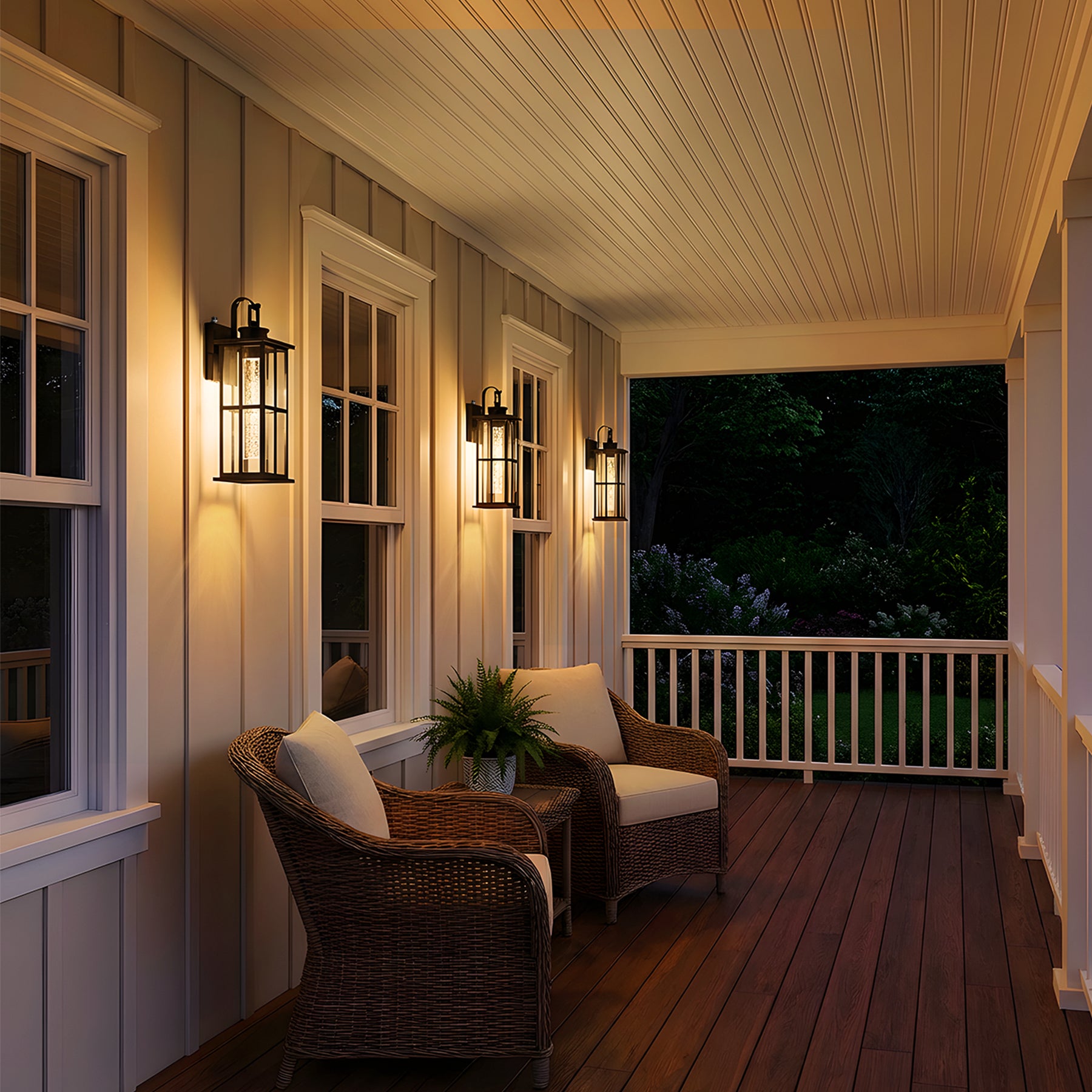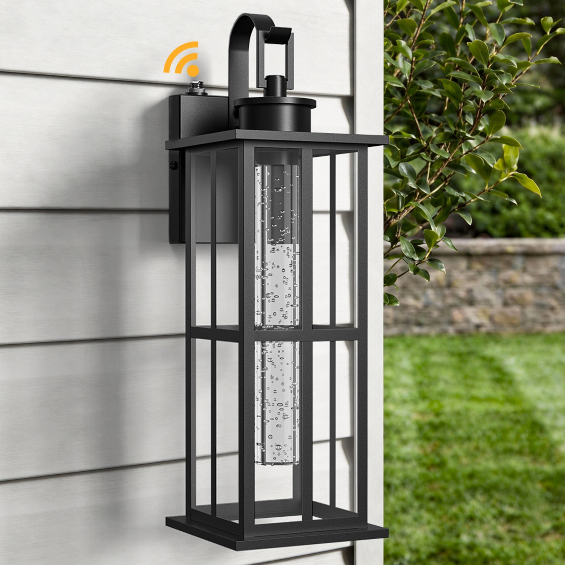 Elevate your home’s exterior with this striking lantern-style wall sconce, where modern industrial design meets timeless charm. Its open metal frame and bubble acrylic center create a dazzling, sparkling glow that transforms your porch, doorway, or backyard into a welcoming retreat. The built-in dusk-to-dawn sensor ensures hassle-free illumination—automatically turning on at night and off at dawn—while its robust construction stands up to rain, snow, and harsh sunlight. A low-maintenance, high-style upgrade that enhances your curb appeal and keeps your outdoor spaces safe and inviting, year after year.