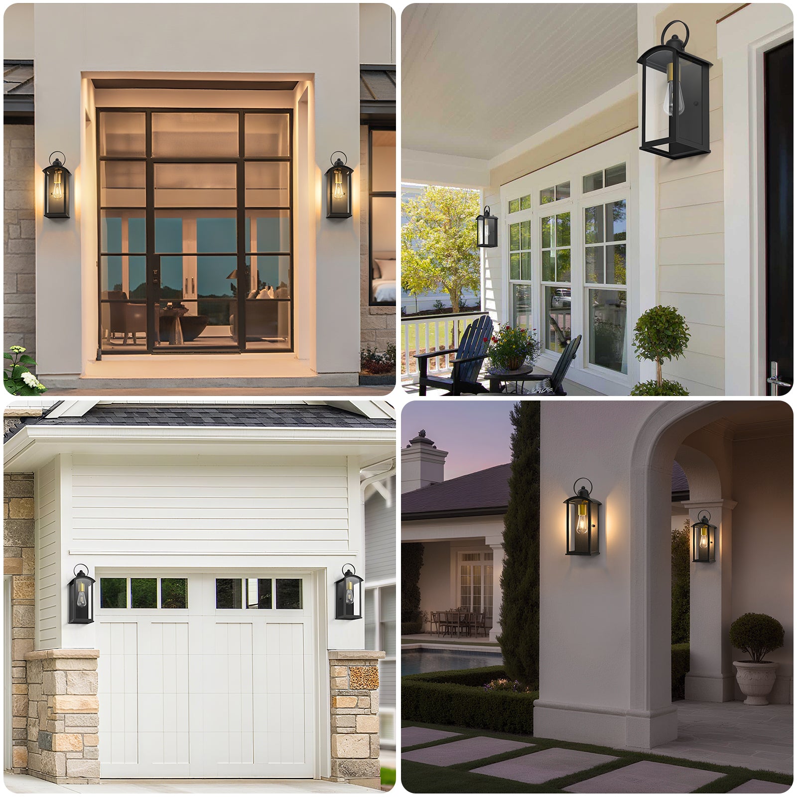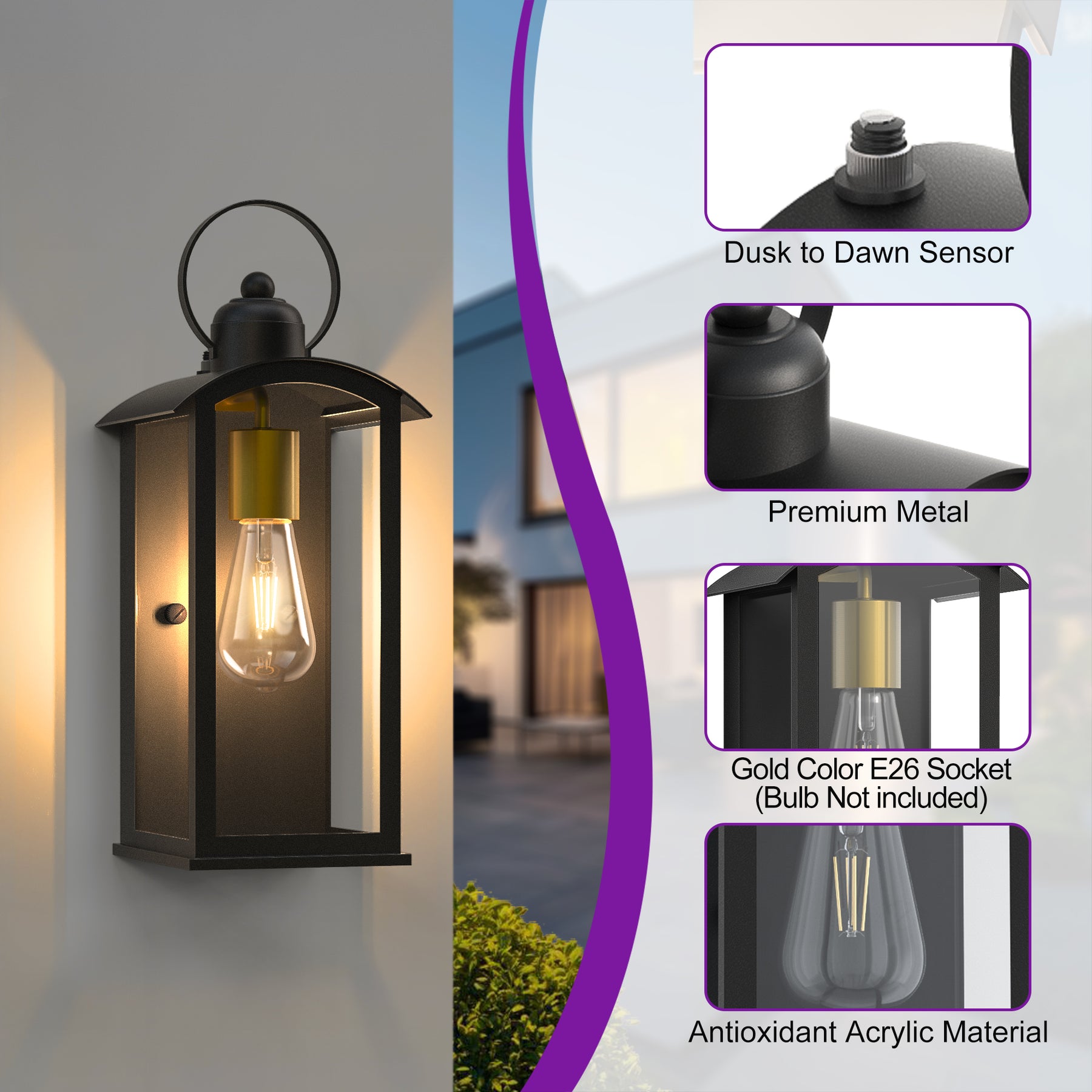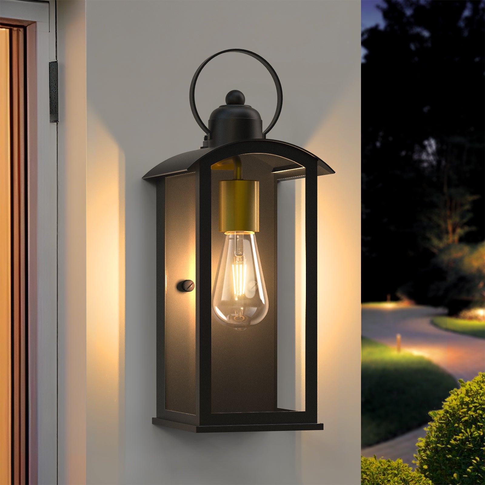 This outdoor wall light perfectly combines classic lantern aesthetics with cottage-inspired charm, guiding guests to your front door in style. The sleek iron frame, finished in matte black, rests flush against the wall, while the curved roof and round finial add an elegant touch. Its clean-lined silhouette, paired with glass panels on three sides, beautifully showcases the single candlestick inside, designed to hold one bulb (sold separately). With dimming capabilities and a dusk-to-dawn feature, this sconce ensures a welcoming ambient glow throughout the night. Rated for wet locations, it's ideal for areas exposed to the elements, making it a perfect choice for porches, patios, and entryways.