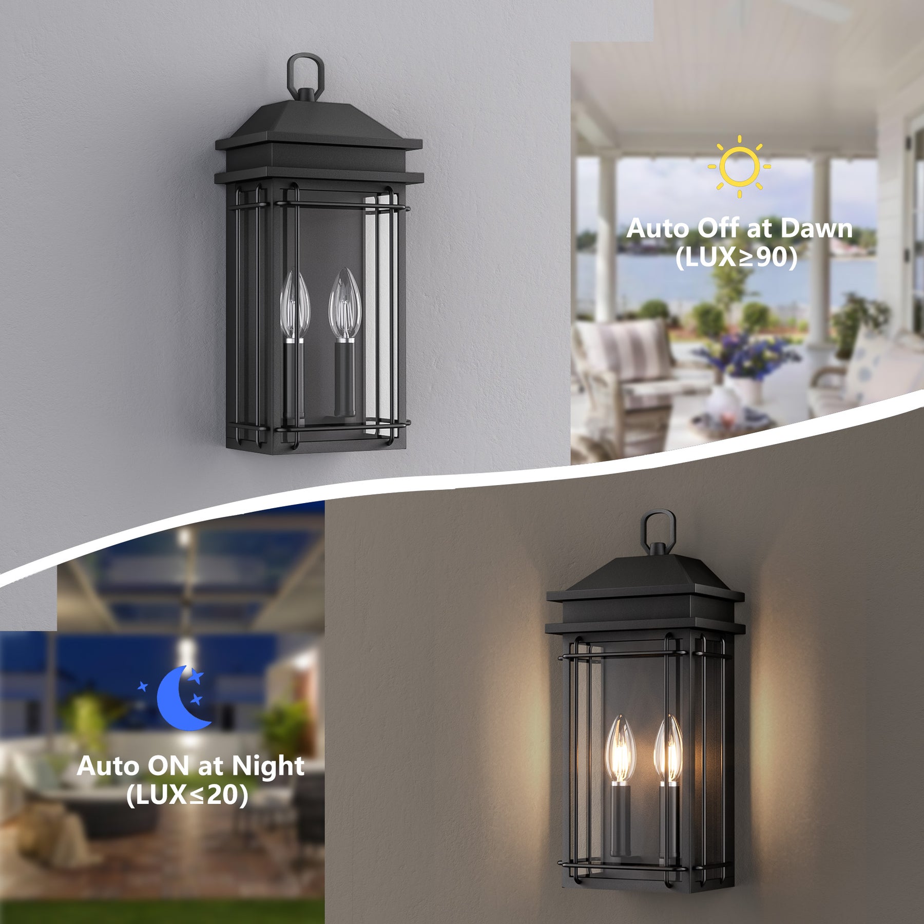 - Dusk-to-Dawn Automation:Automatically turns on at night (LUX≤20) and off at dawn (LUX≥90) — no more manual switching. Perfect for hands-free, energy-efficient lighting.
