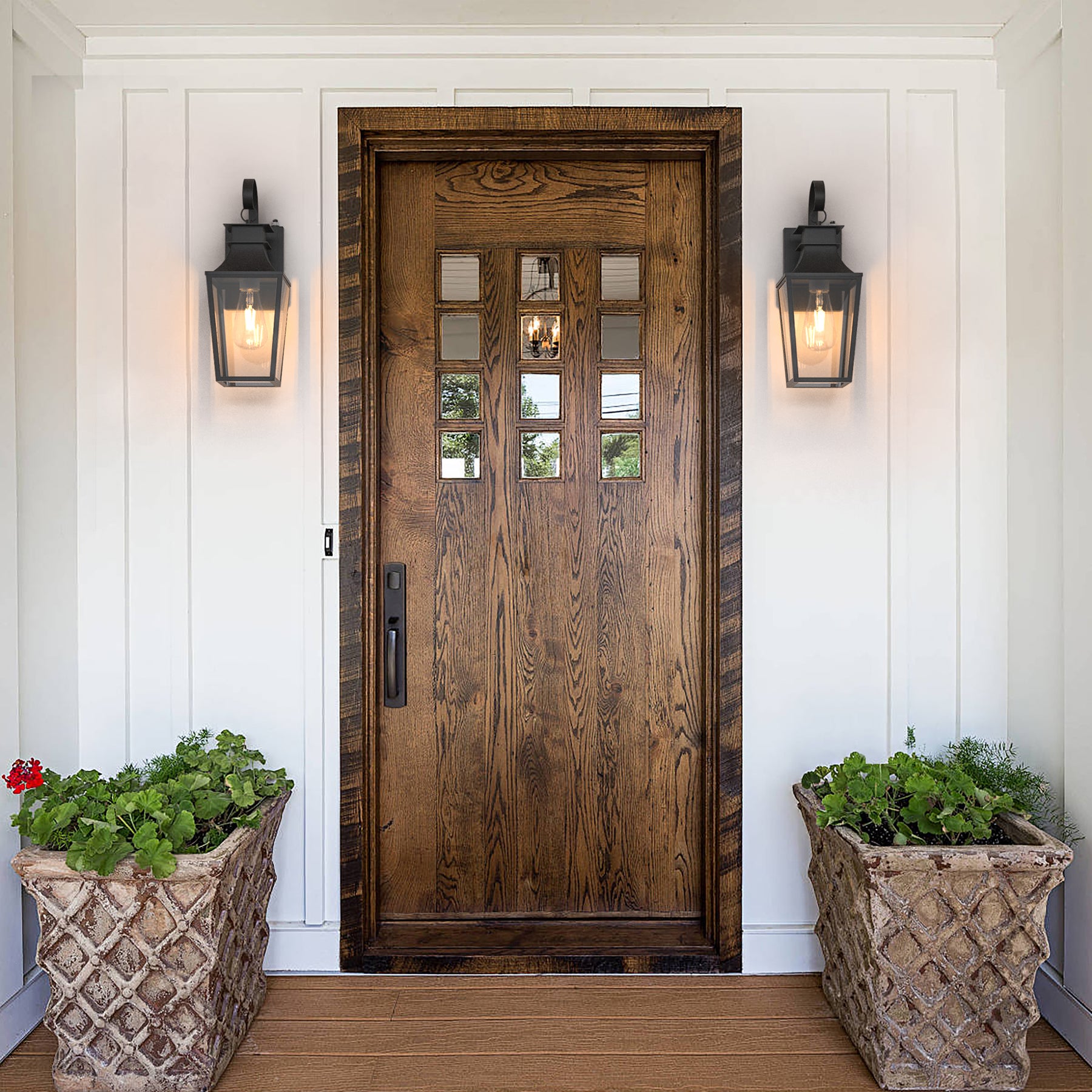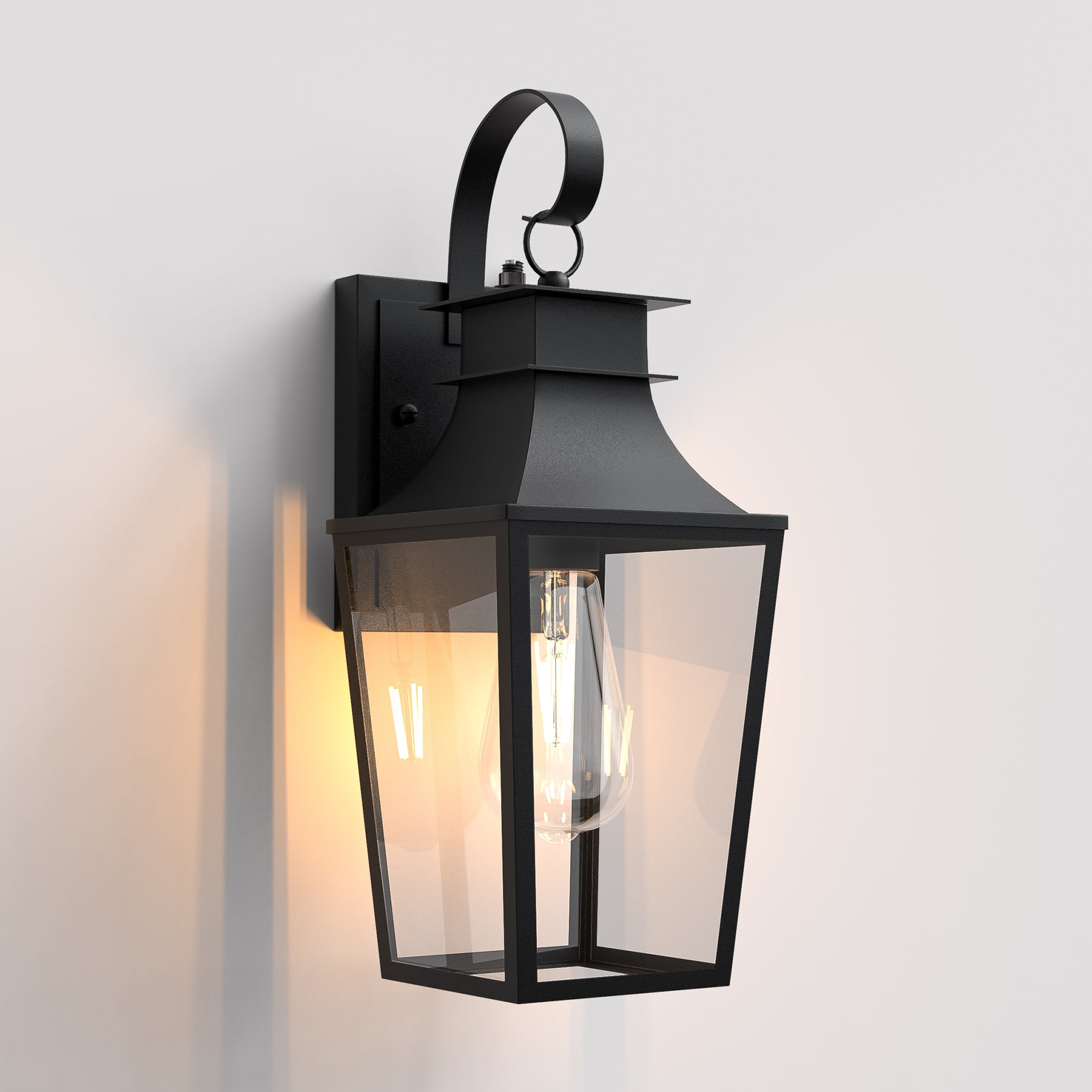 • Stylish Design: Crafted from?heavy-duty iron and tempered clear glass, this light offers a sand-textured black finish, blending seamlessly with any exterior décor.