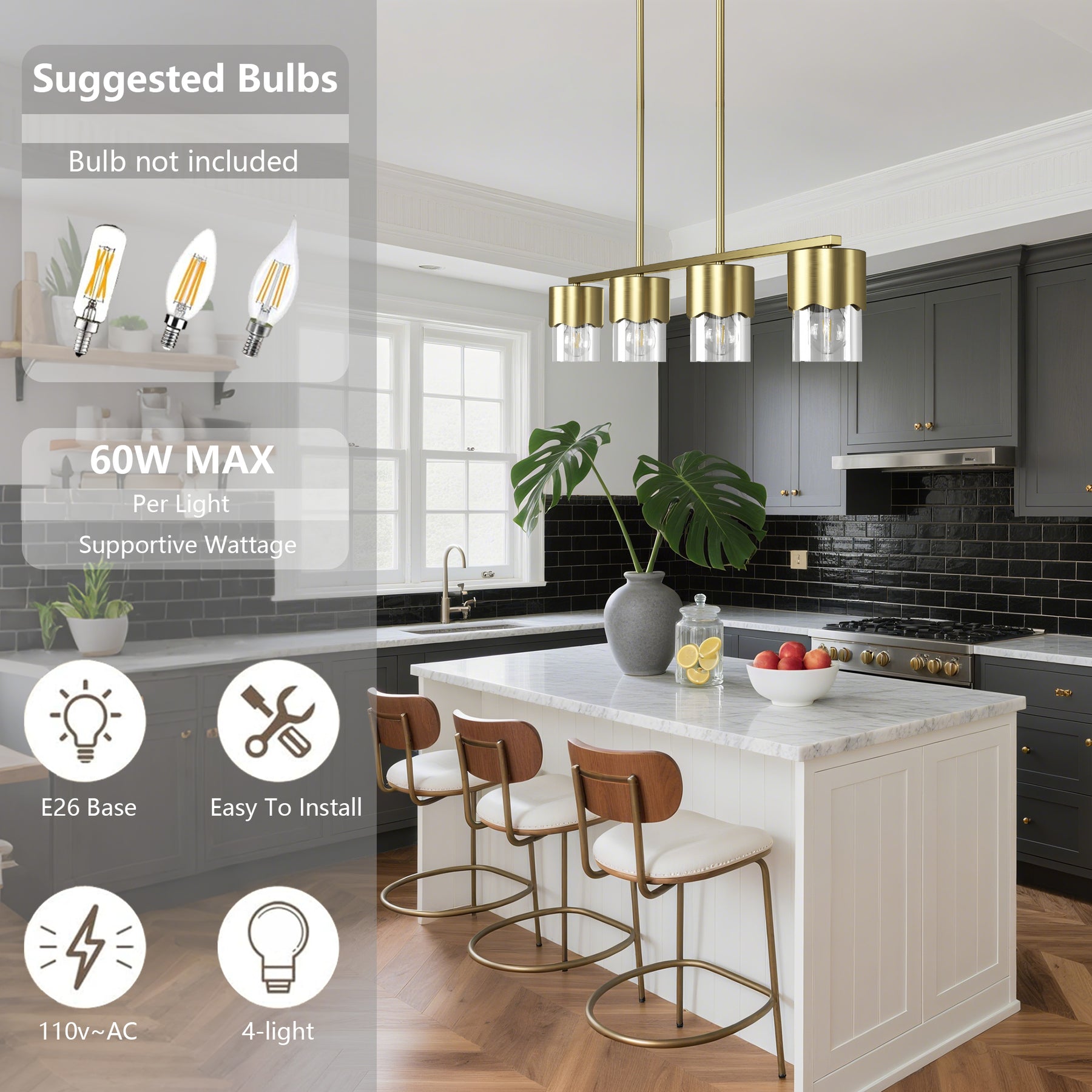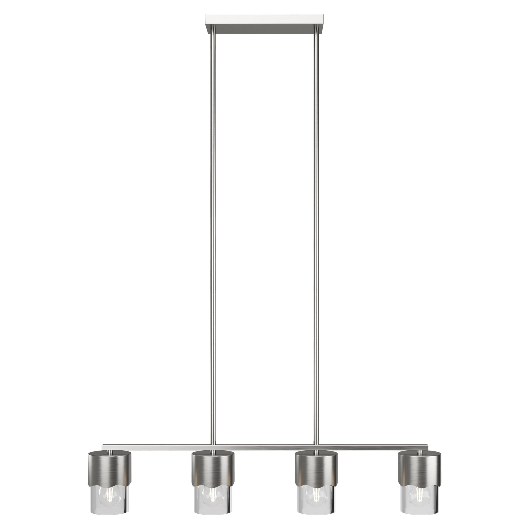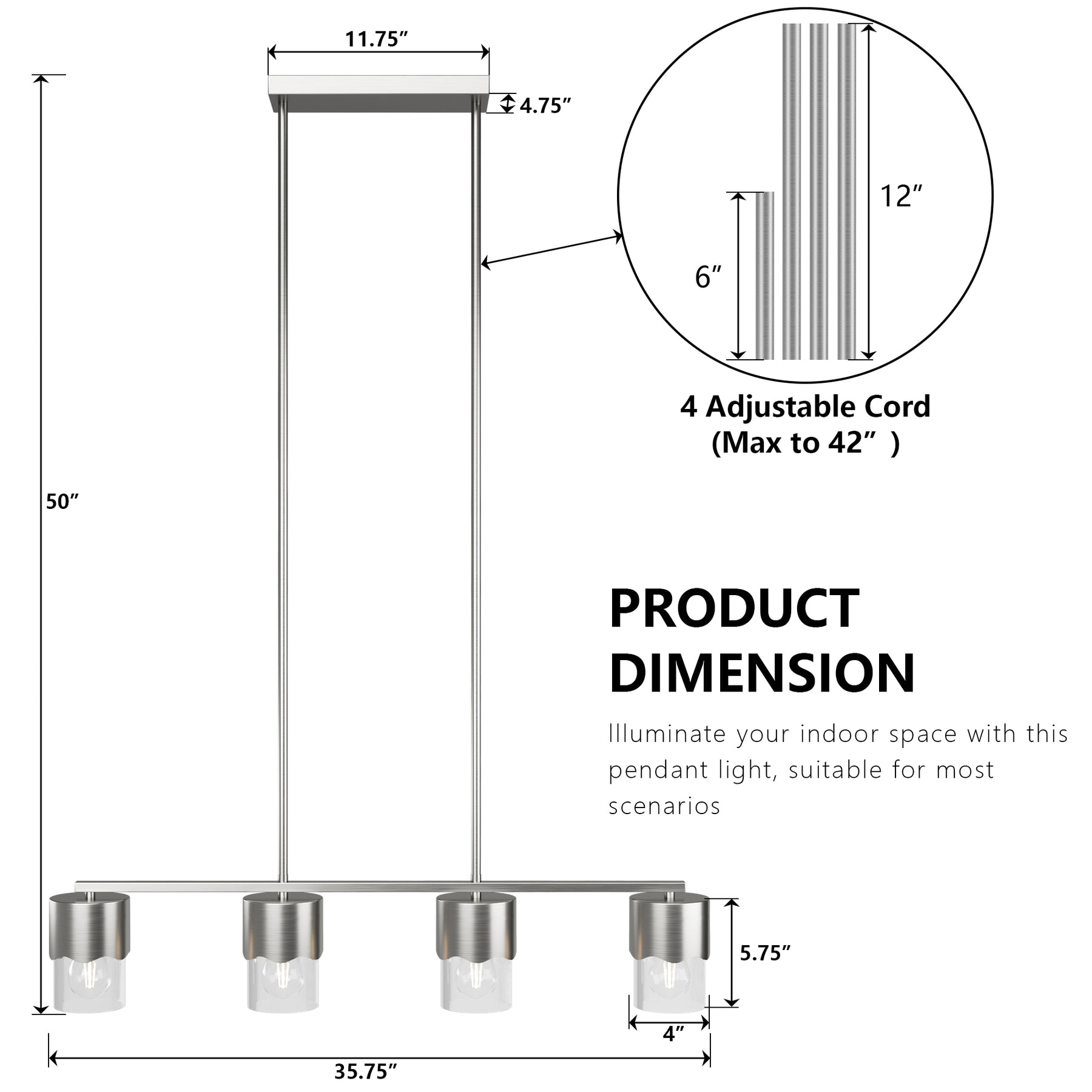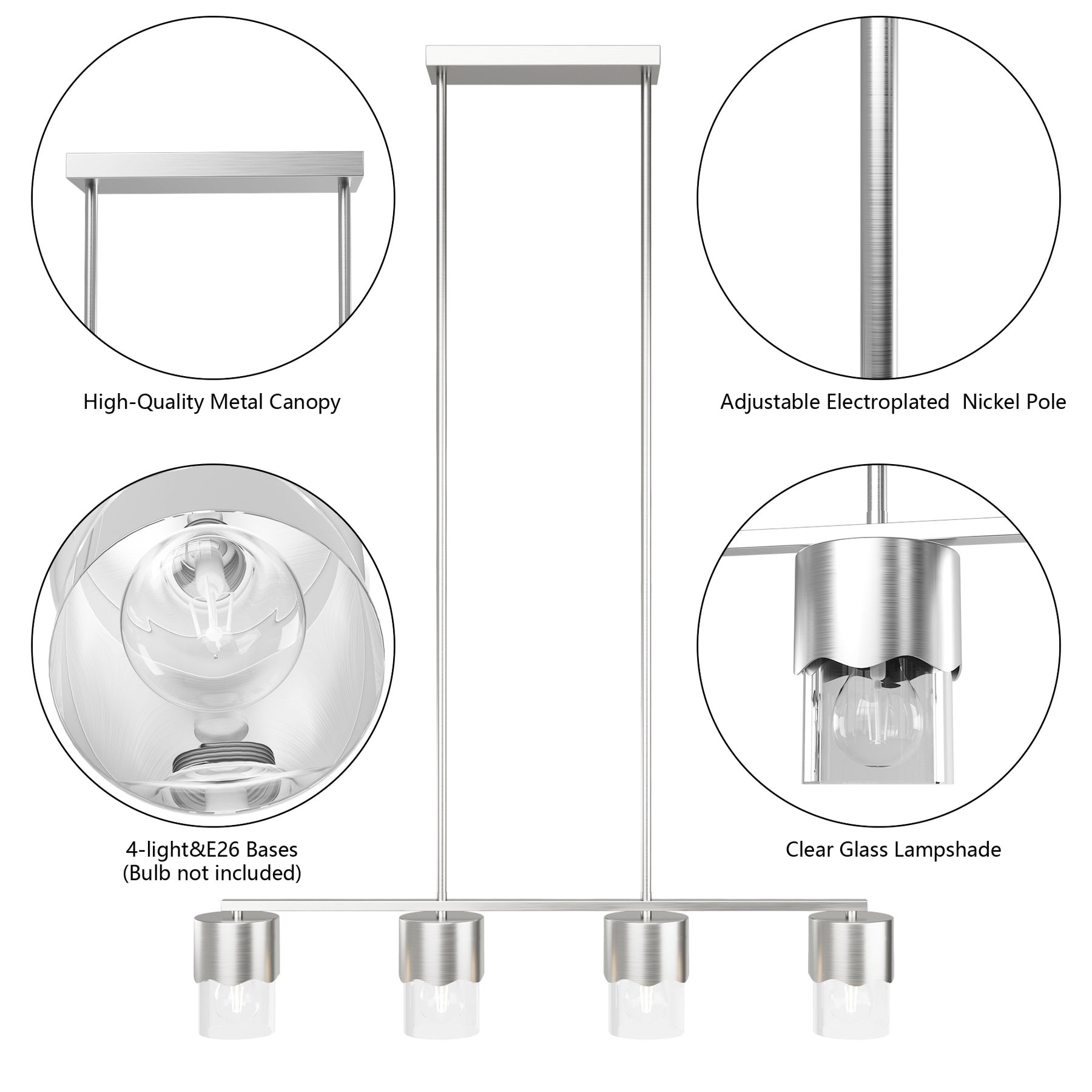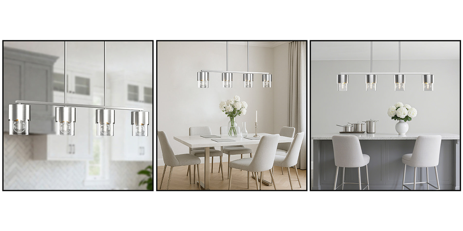 Elevate your kitchen island with this 4 - Light Metal and Glass Modern Linear Pendant Light. Crafted with a sleek metal frame in a sophisticated black finish and clear glass shades, it blends modern aesthetics with a touch of industrial charm. The linear design evenly distributes light, creating a warm and inviting ambiance over your kitchen workspace. Ideal for both contemporary and transitional kitchen styles, it not only illuminates but also serves as a stylish focal point.