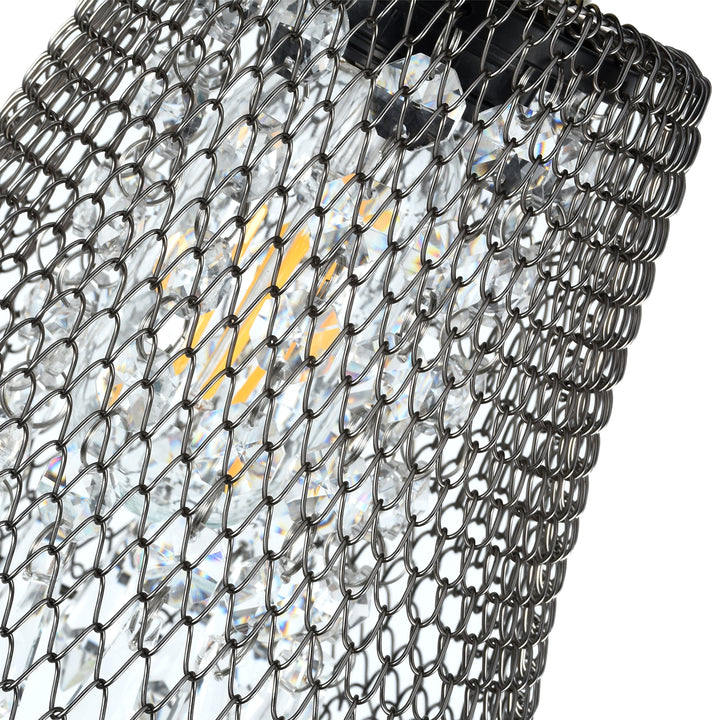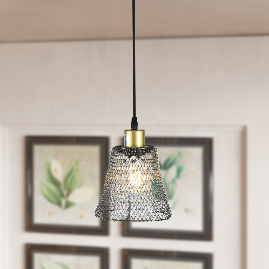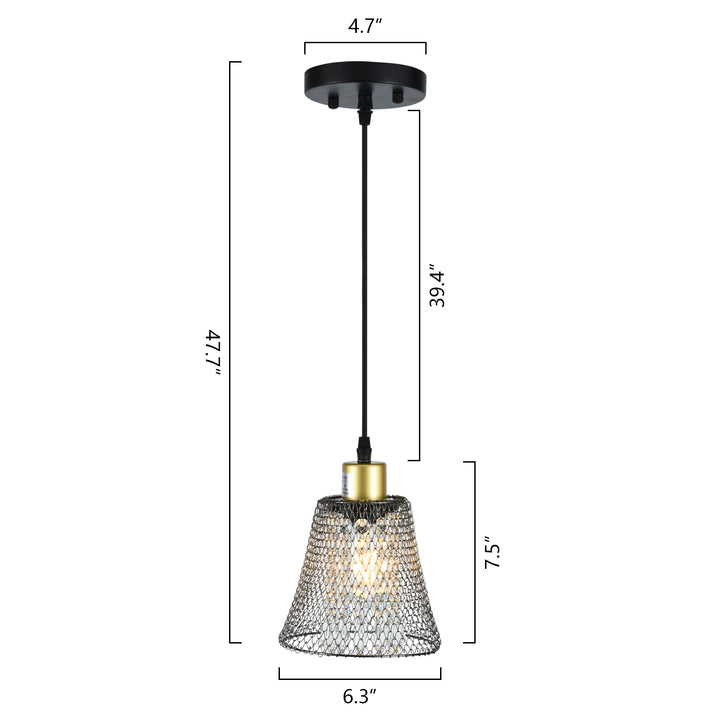 • The pendant is suspended from a sleek cord, and topped with a round ceiling canopy, both finished in a chic matte black that perfectly complements the iron netting shade. This versatile fixture is a perfect blend of modern and vintage elements, making it the ideal choice for a variety of interior design styles. Whether you're looking to add a touch of sophistication to your dining room, living room, or bedroom, this pendant light is sure to impress, providing both style and functionality to any space. Don't miss out on this must-have lighting accessory that will elevate your home decor to the next level!