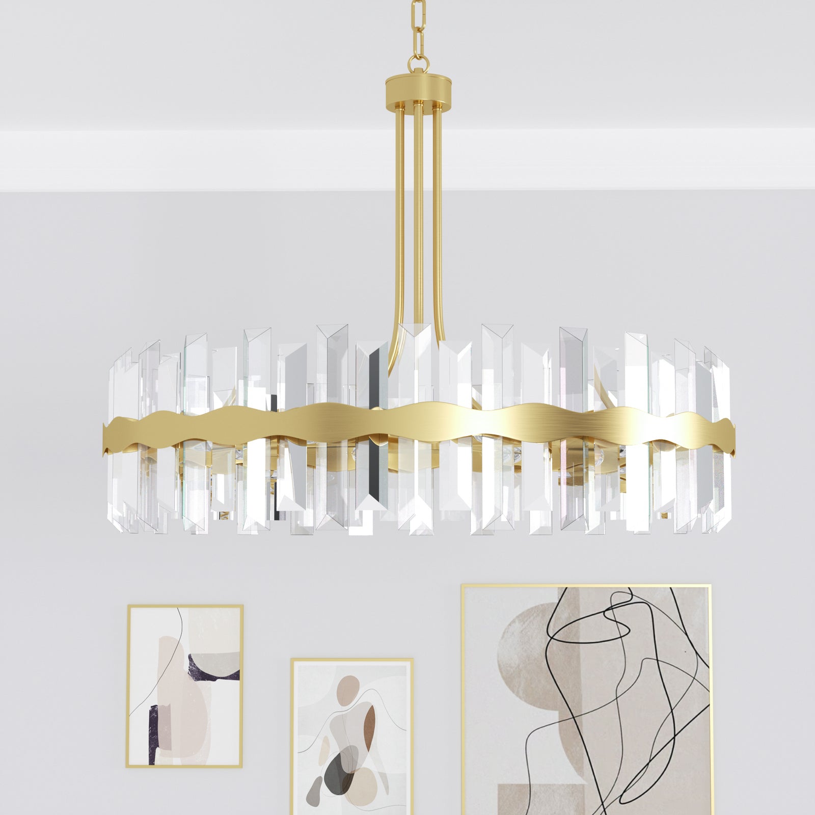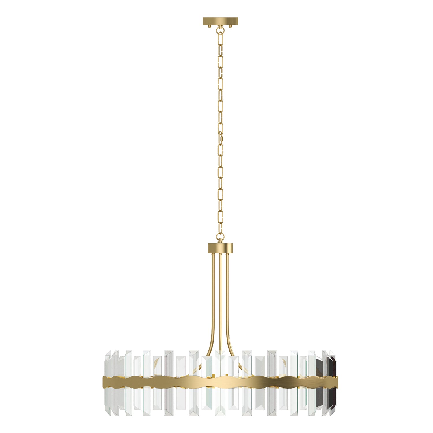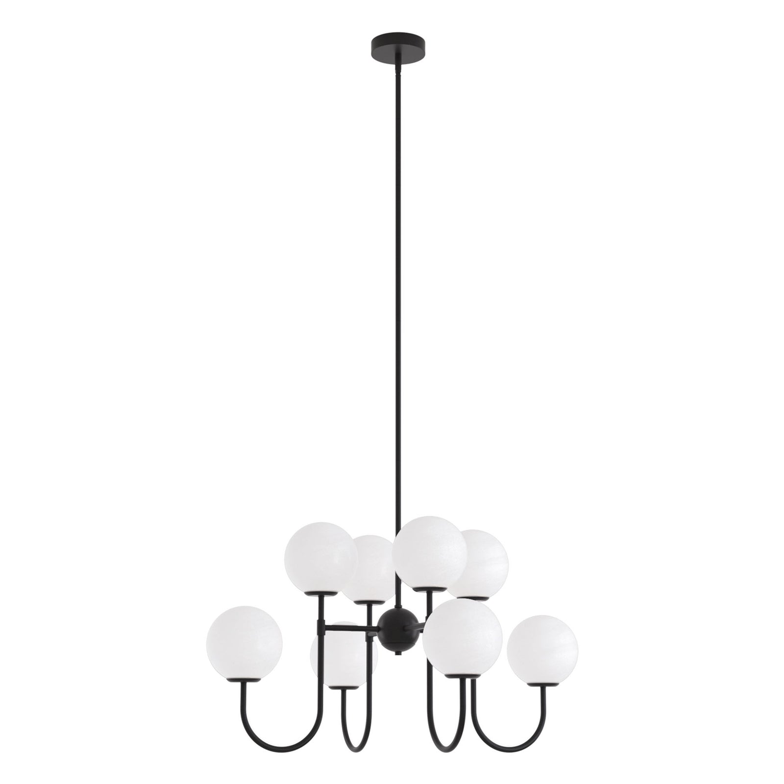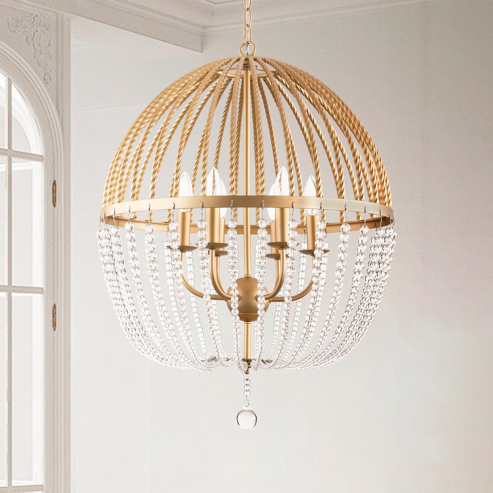 It is a beautiful chandelier. It took some time to figure out and assemble. The design was too ornate for my humble dining room with a standard high ceiling, so eliminated bottom danglers and connecting danglers. With no danglers, the bottom of the chandelier is about 6 feet from the floor. The light bulbs make a big difference in their look. I used traditional standard CLEAR light bulbs for a sparkling effect. The plain ceiling medallion was also installed.