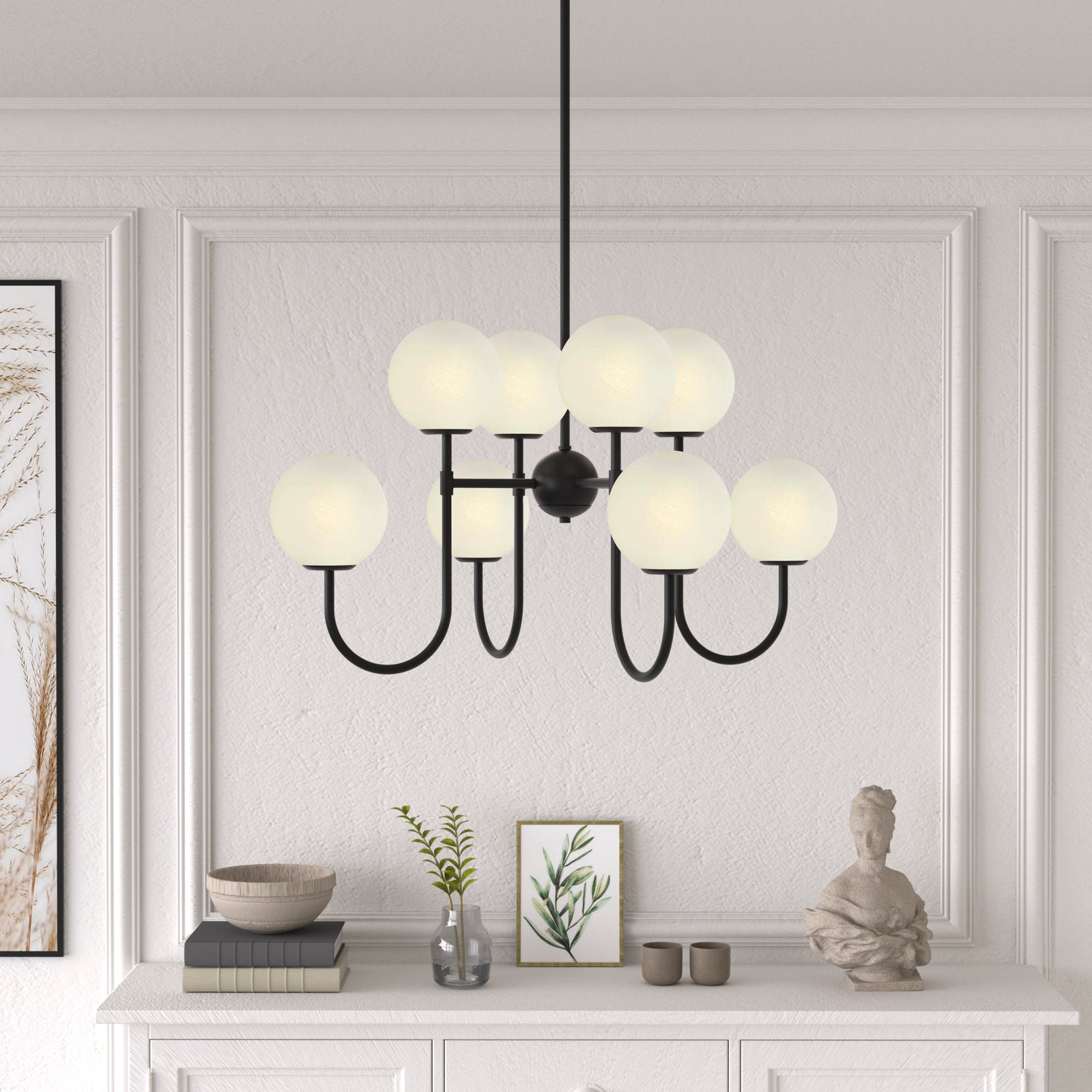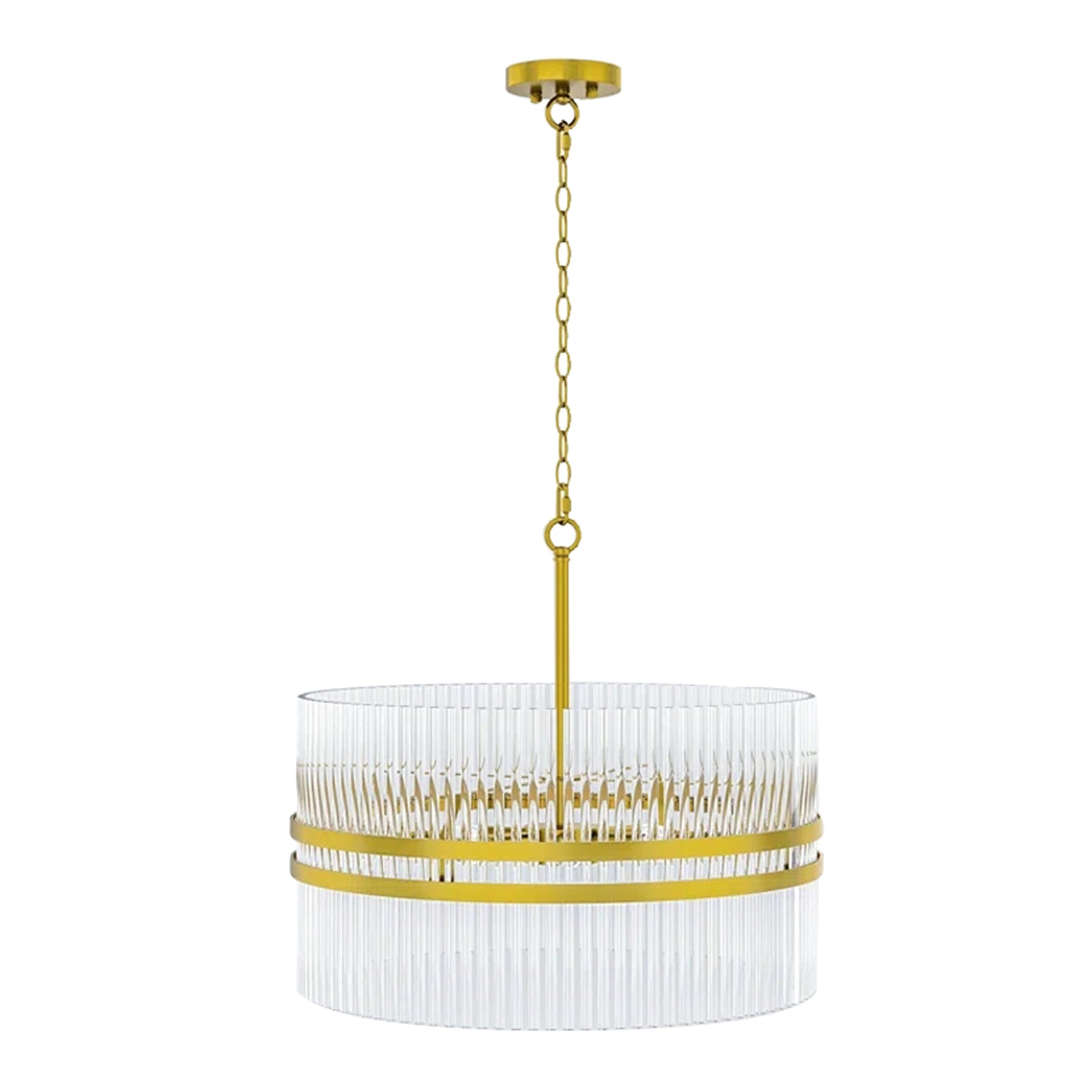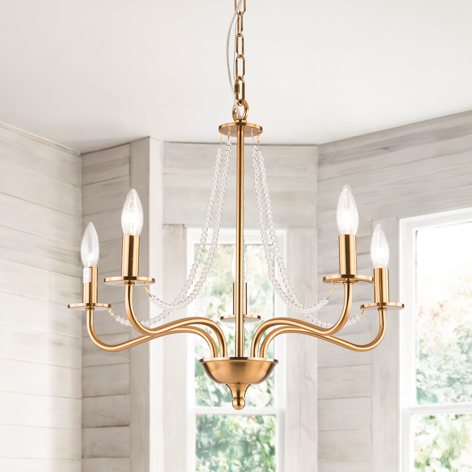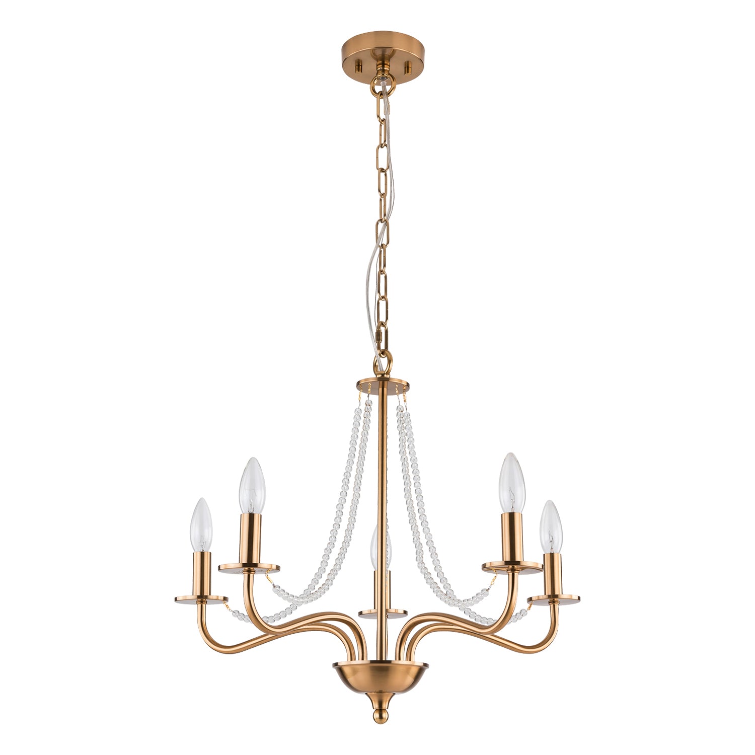 It is a beautiful chandelier. It took some time to figure out and assemble. The design was too ornate for my humble dining room with a standard high ceiling, so eliminated bottom danglers and connecting danglers. With no danglers, the bottom of the chandelier is about 6 feet from the floor. The light bulbs make a big difference in their look. I used traditional standard CLEAR light bulbs for a sparkling effect. The plain ceiling medallion was also installed.