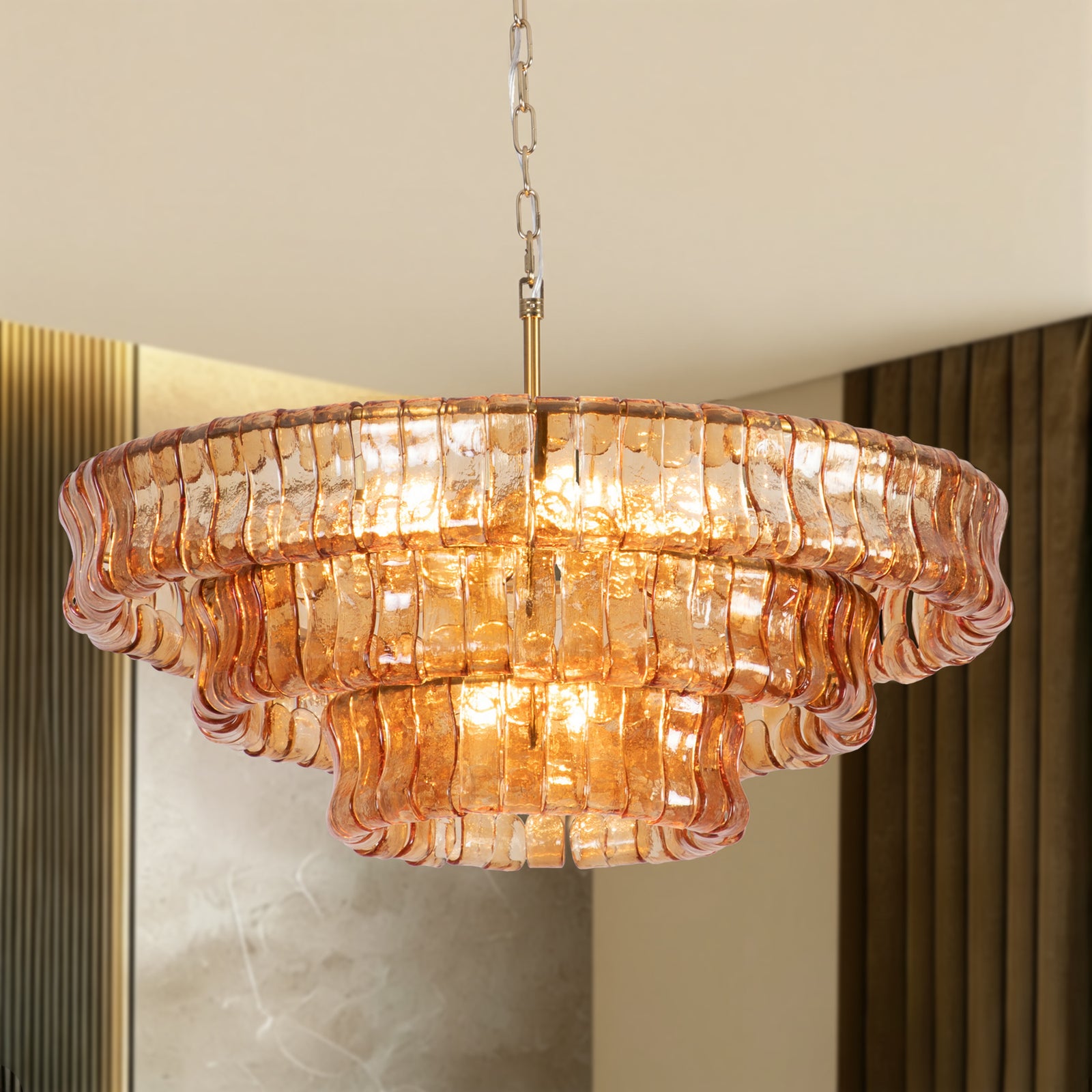 Lumen 9-Light 32"W Polished Brass Modern Tired Chandelier with Hand-Blown Amber Glass for Dining Room or Living Room #19239
