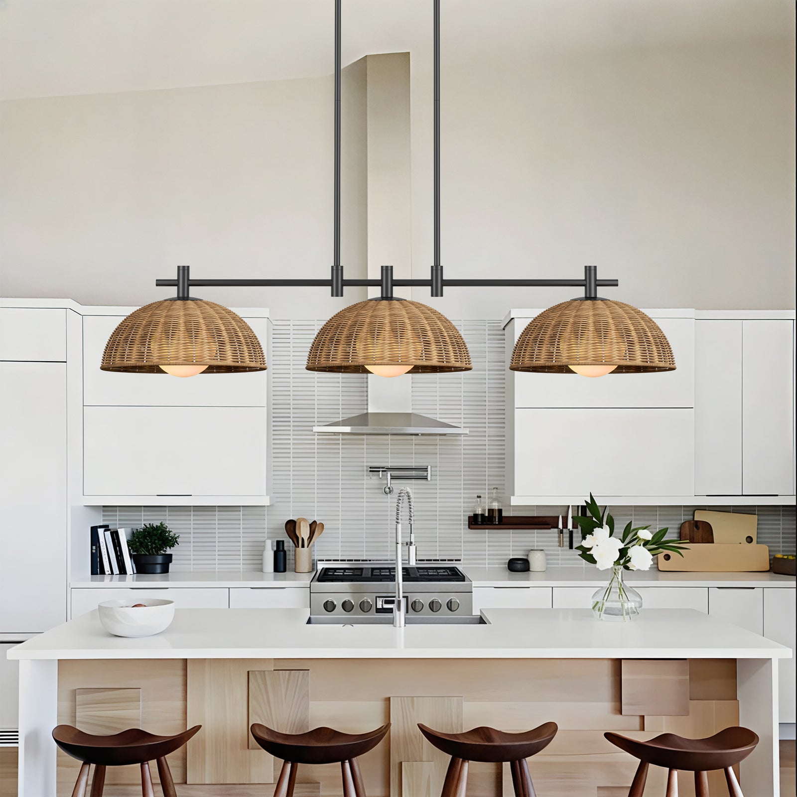 Radiant 3-light 41"w Black Modern Dome Linear Pendant With Hand-woven Rattan Lampshade For Dining Room Or Kitchen Island #29041