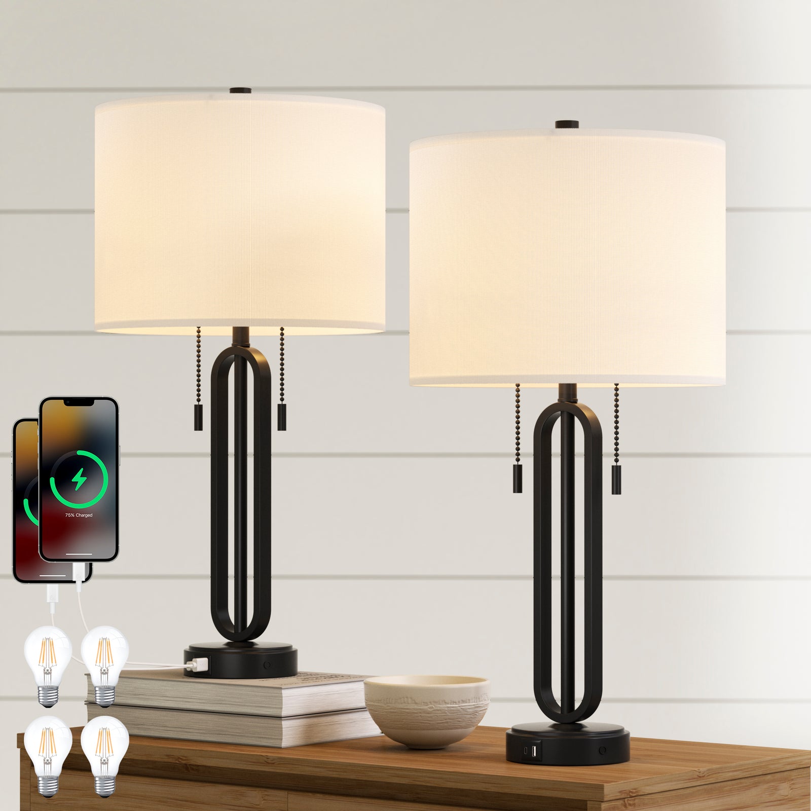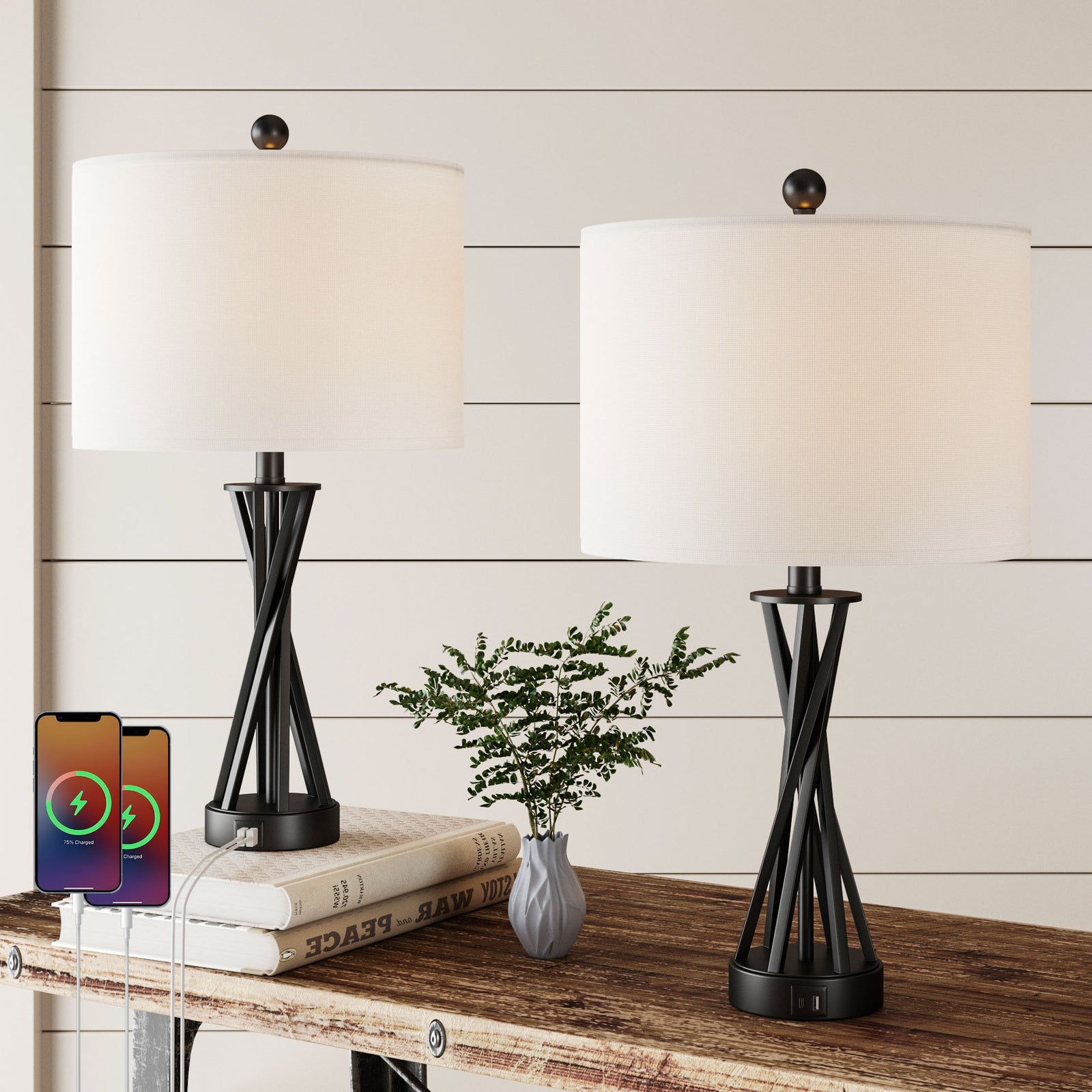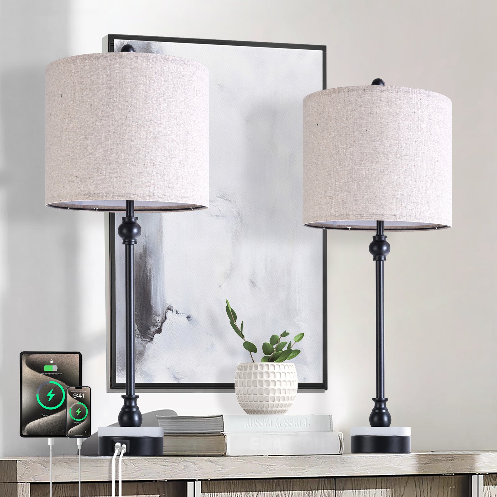 Maxax 25'' Glass Table Lamp Set of 2, Traditional Black Lamp sets with USB Port & Type C for Living Room Bedroom #T167