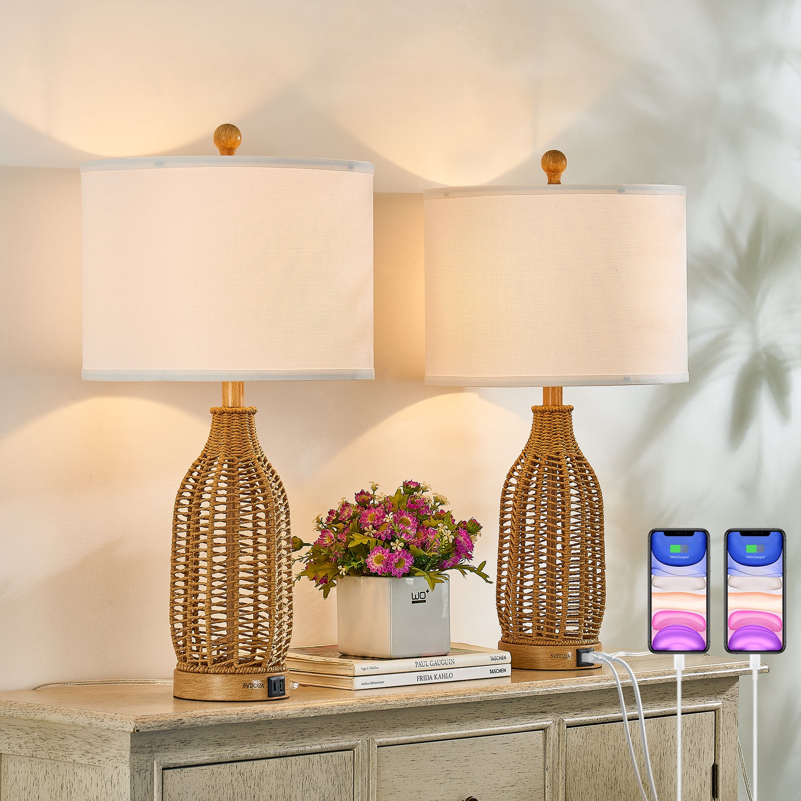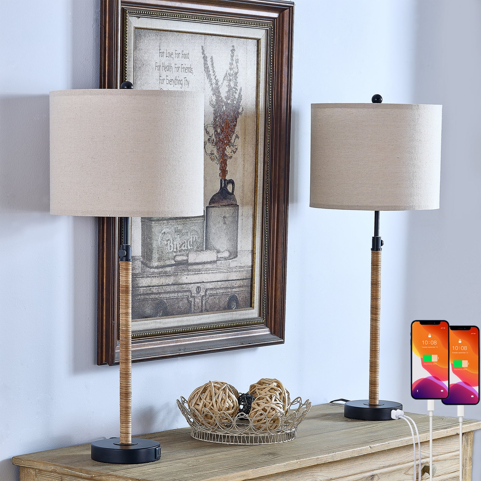 Maxax Farmhouse Rattan Table Lamp for Living Room Bedroom 24.5" Coastal Nightstands Bedside Lamps with USB Charging Port & Type C #T259