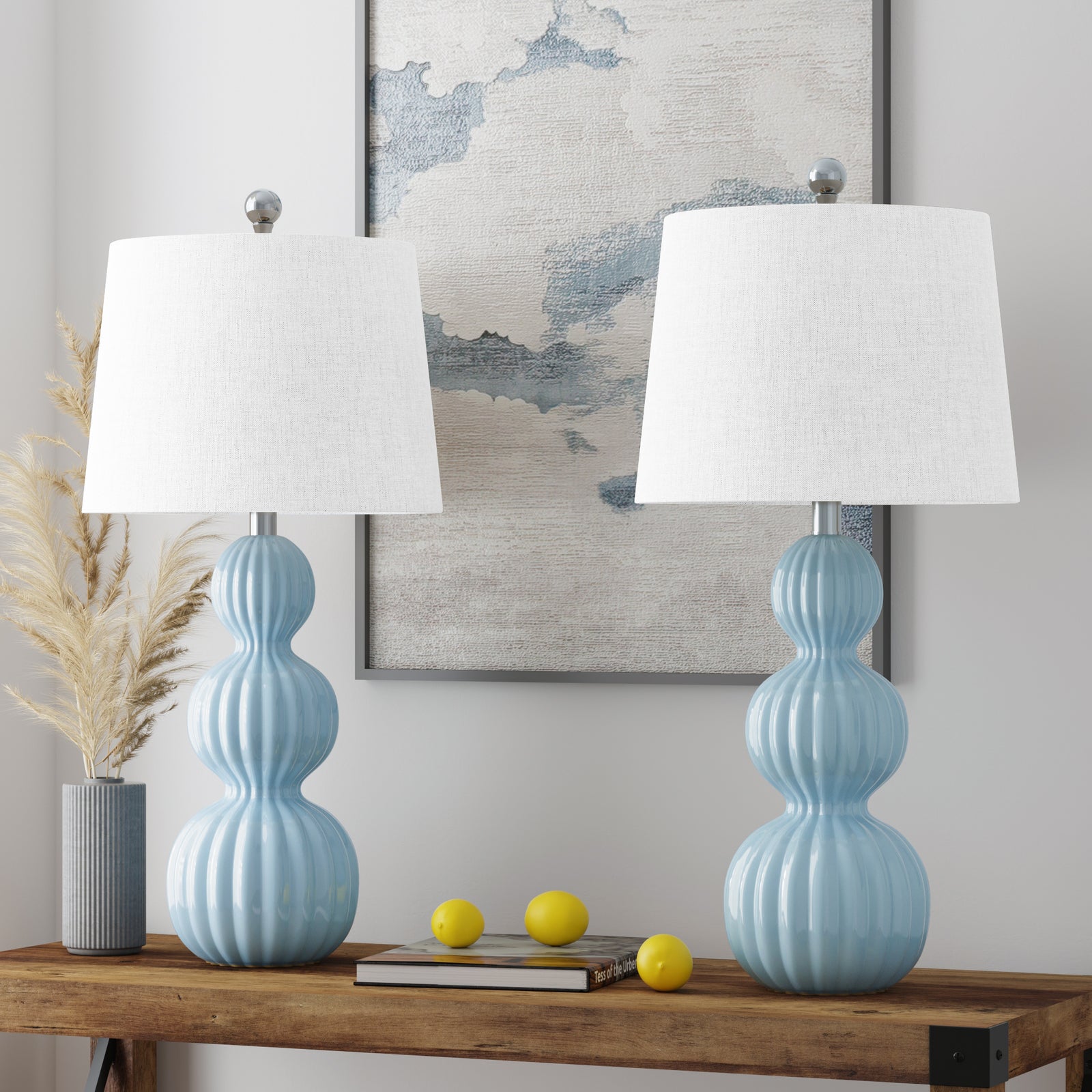 Maxax Blue Ceramic Table Lamps Set of 2,28" Triple Gourd Bedside Nightstand Lamps with White Shade for Living Room,Bedroom,Office #T45-BU
