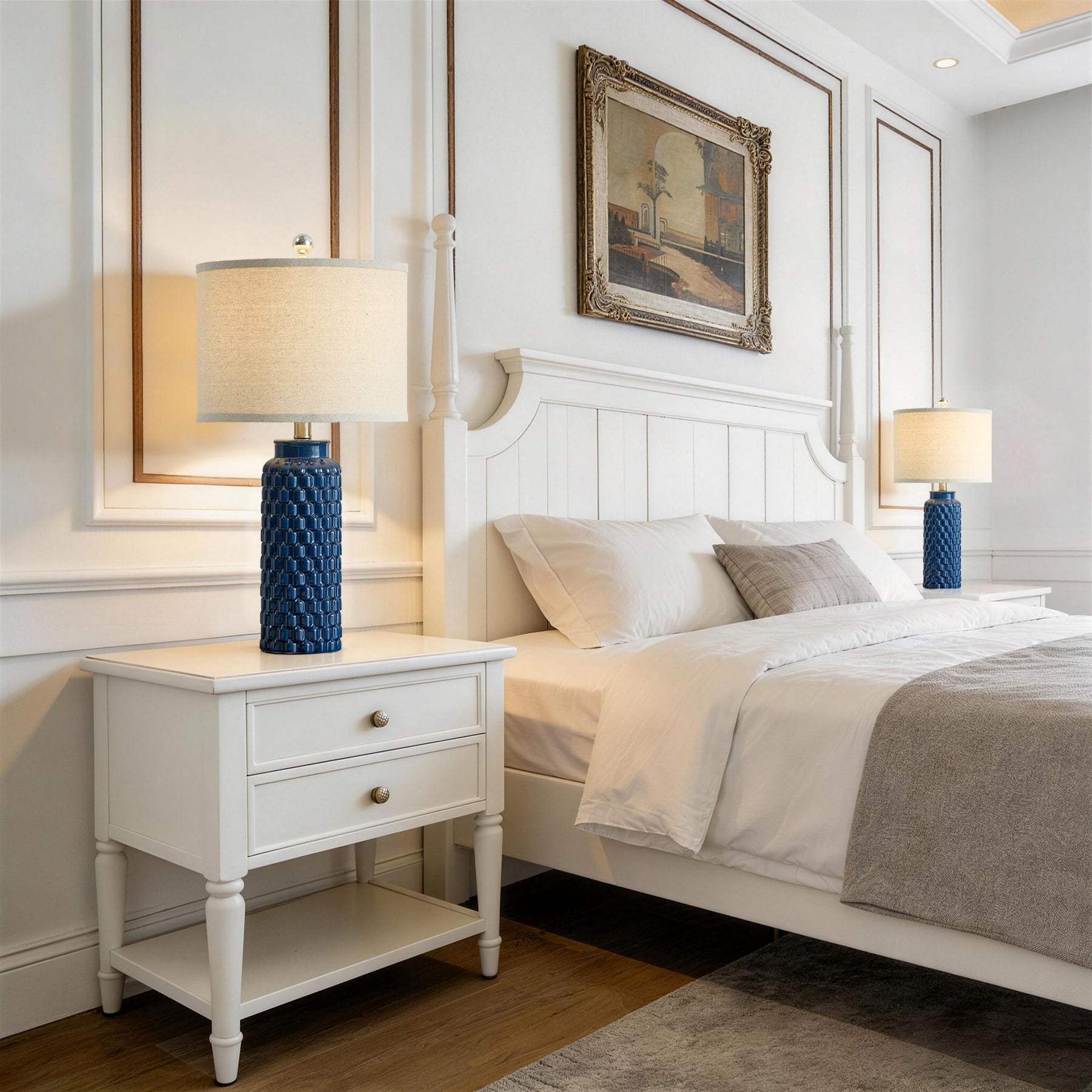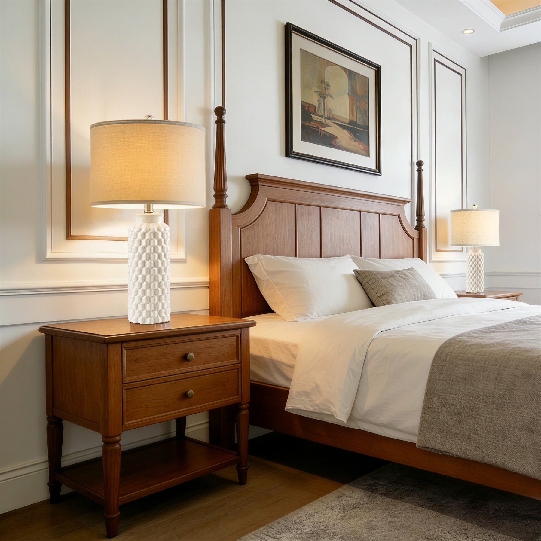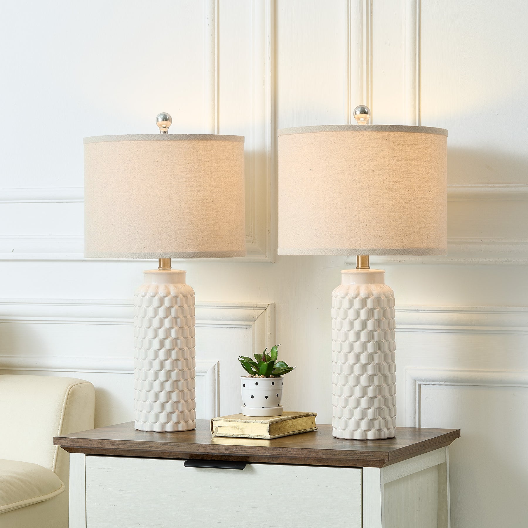 Elevate your space with this 20.5-inch decorative ceramic table lamp featuring a textured embossed body and polished nickel accents. The oatmeal linen drum shade softly diffuses light, creating a warm and inviting ambiance ideal for bedrooms, living rooms, or entry consoles. Its clean silhouette pairs effortlessly with Modern, Transitional, and Contemporary Glam interiors.