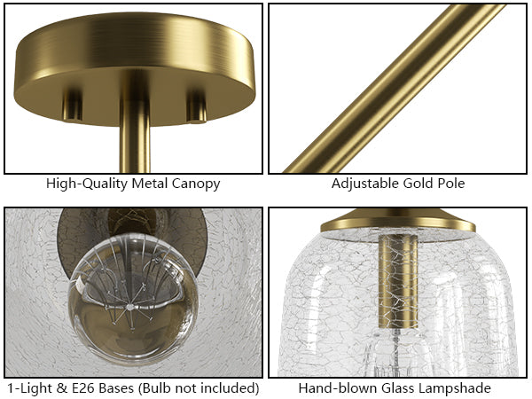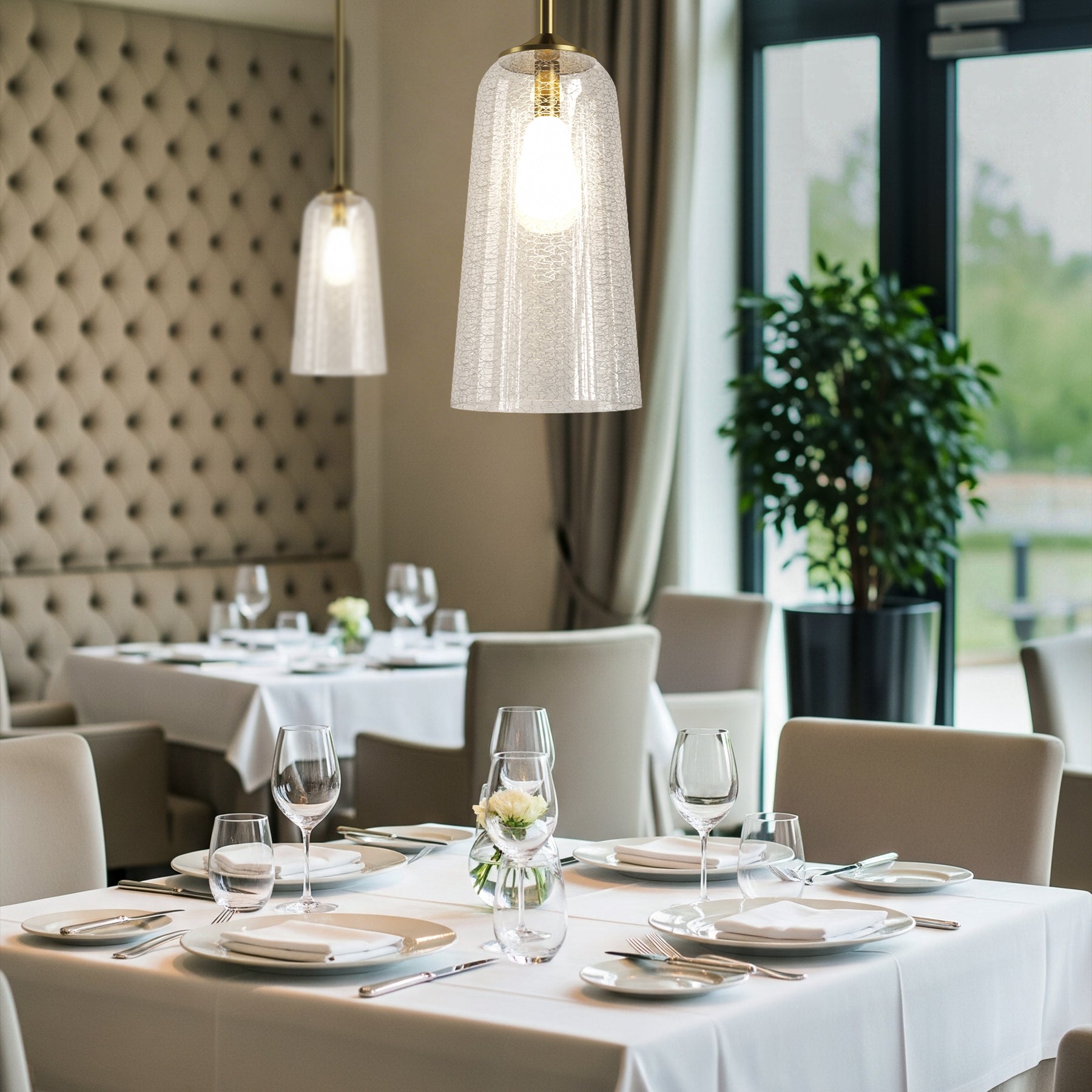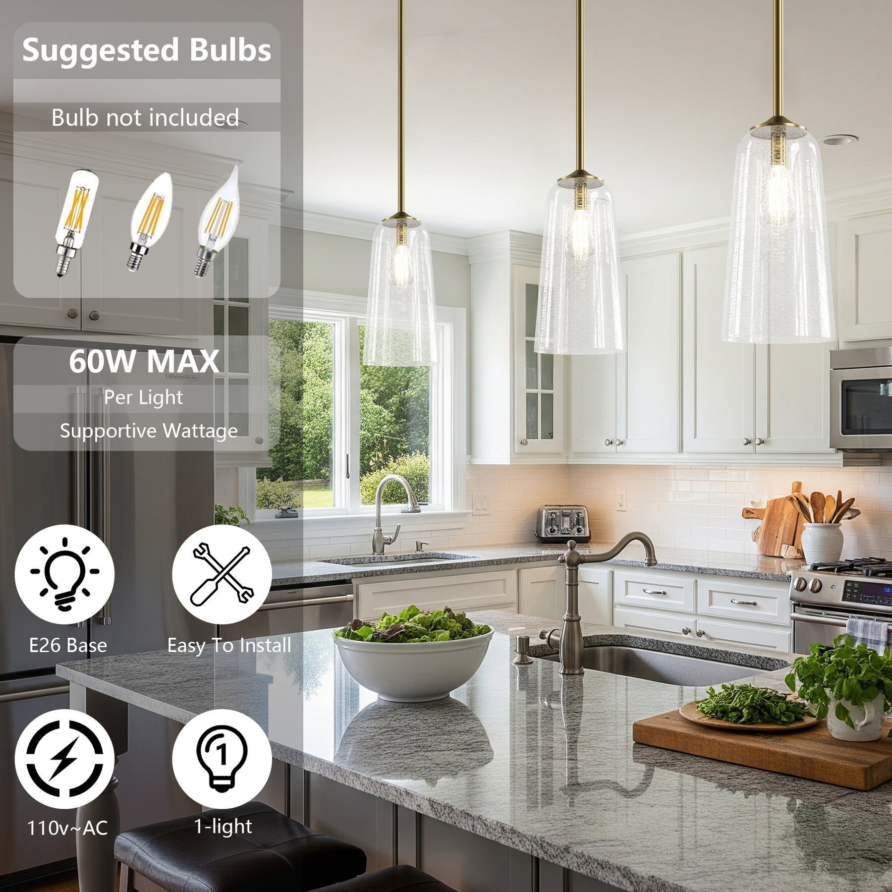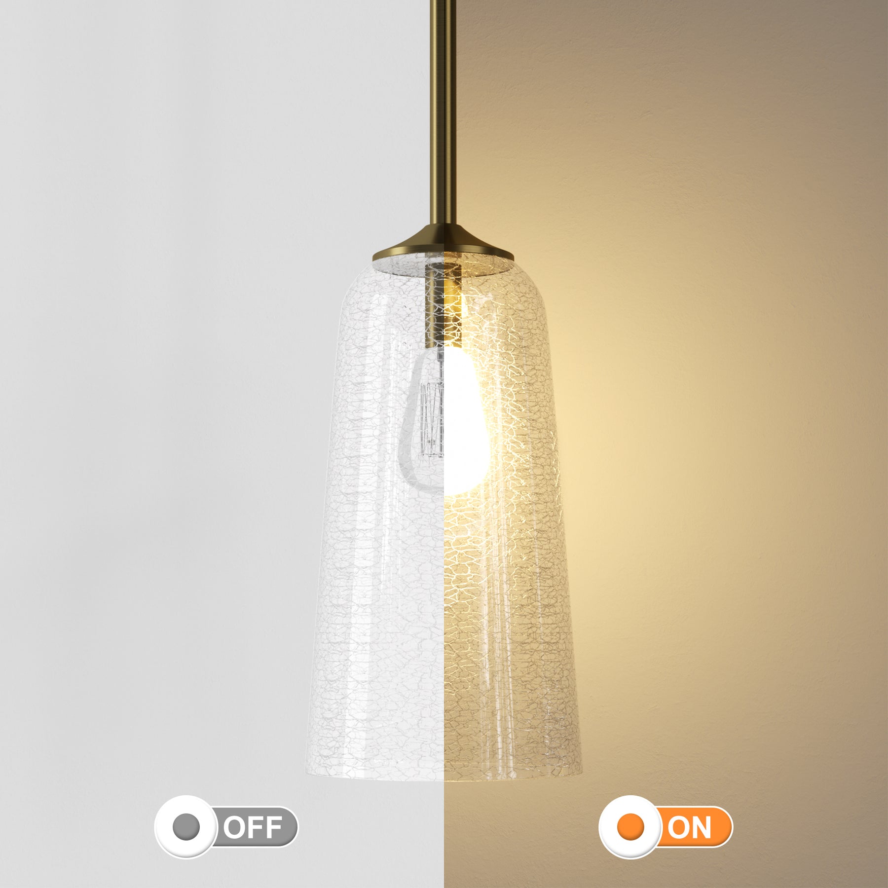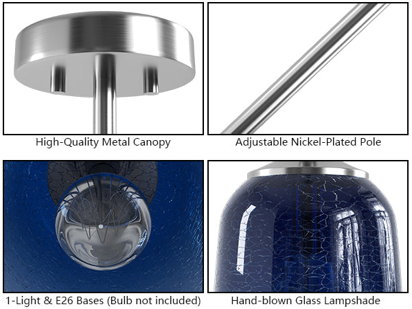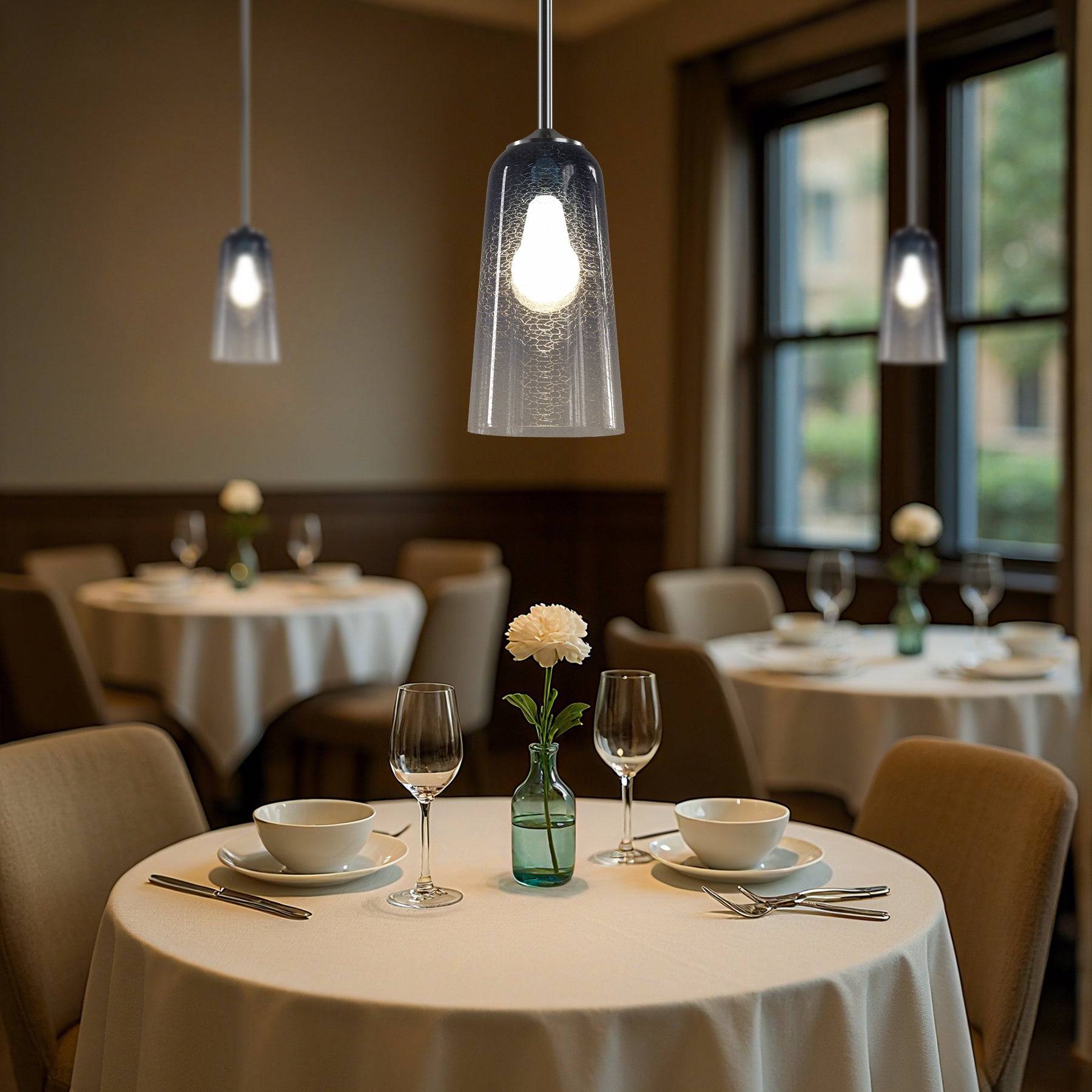 Elevate your space with this modern pendant light featuring a striking crackled-glass shade in a refined gradient blue finish. Its trio of 11.81" downrods allows flexible height customization, and the fixture is fully compatible with sloped ceilings for effortless placement. ETL-certified for safety and reliability, this pendant installs with ease while delivering a contemporary, artful glow that enhances any kitchen island, dining area.