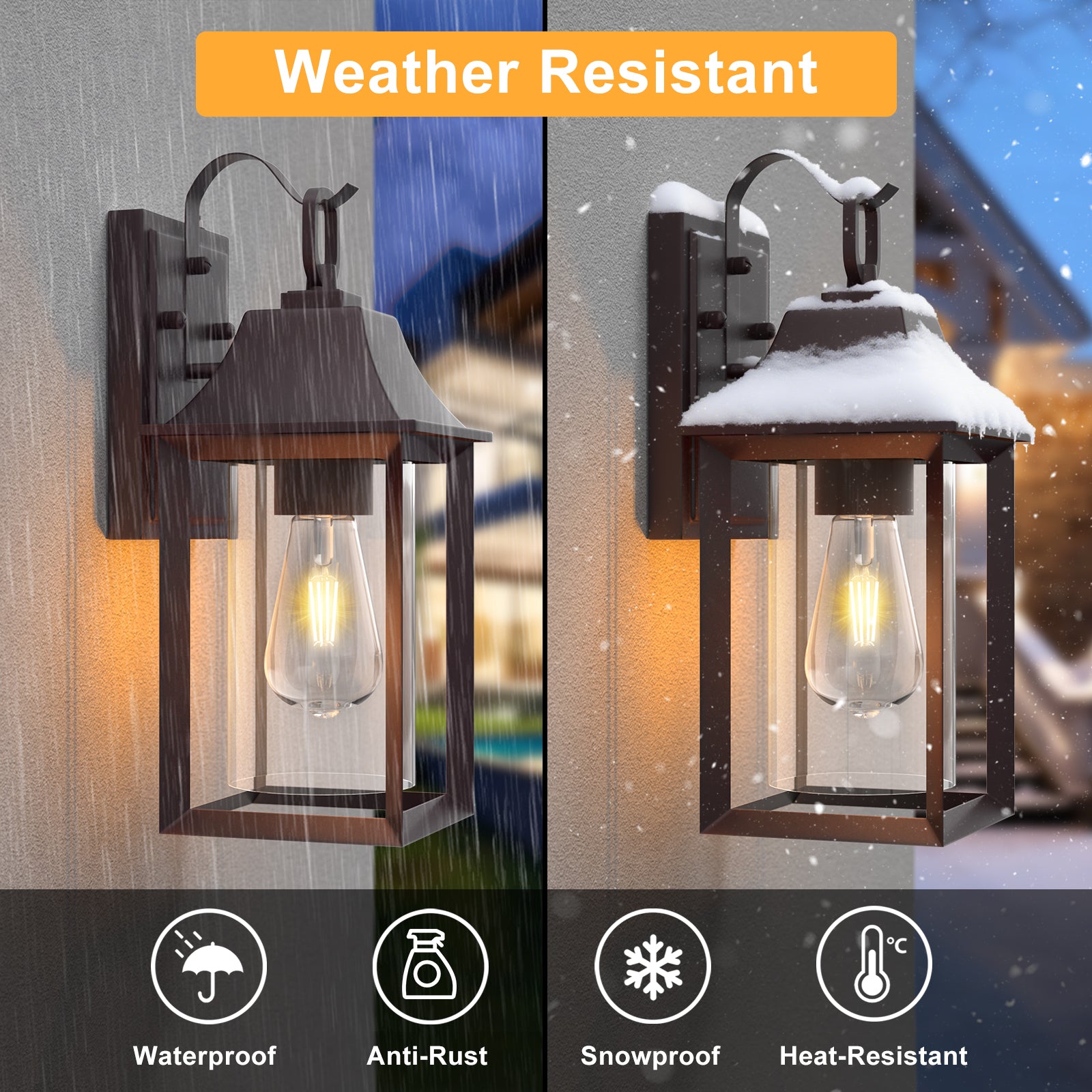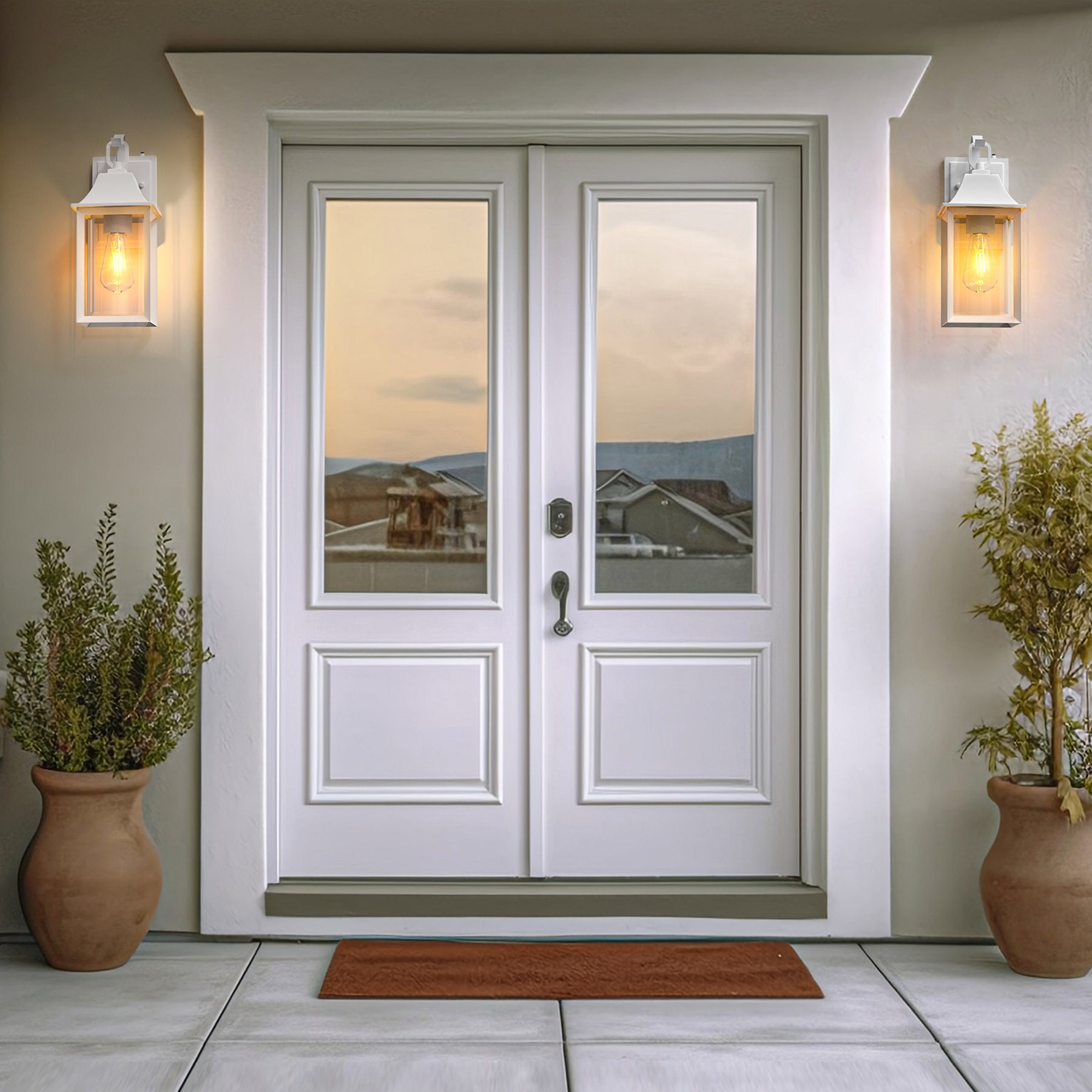 Merging timeless country charm with contemporary elegance, this pair of dusk-to-dawn outdoor lights makes a striking statement. Featuring thick, clear glass panes, they emit a radiant glow that beautifully enhances any space. Inspired by traditional lanterns, their design is elevated by modern lines and meticulous craftsmanship, making them perfect for homes with both classic allure and contemporary simplicity. These large outdoor light fixtures are a versatile addition to any decor.