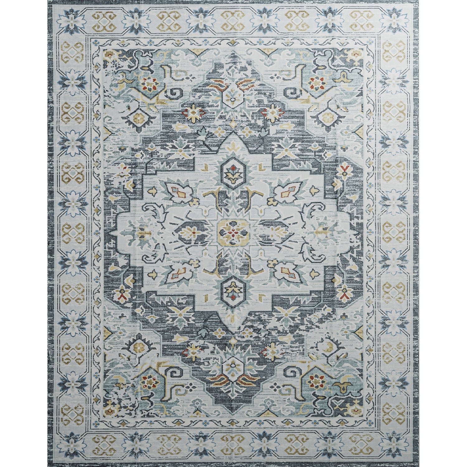 This retro-style area rug effortlessly blends timeless charm with modern functionality. Machine-woven from durable polyester, it features a debossed pattern in vibrant yellow, grey, and cream tones, adding a touch of refined elegance to any room. The non-slip latex backing keeps the rug securely in place, ensuring practical use in any space. Its plush, soft texture provides enhanced comfort underfoot, while the machine-washable feature makes maintenance easy, keeping it looking fresh and clean for years to come. Ideal for adding both style and comfort to your home.